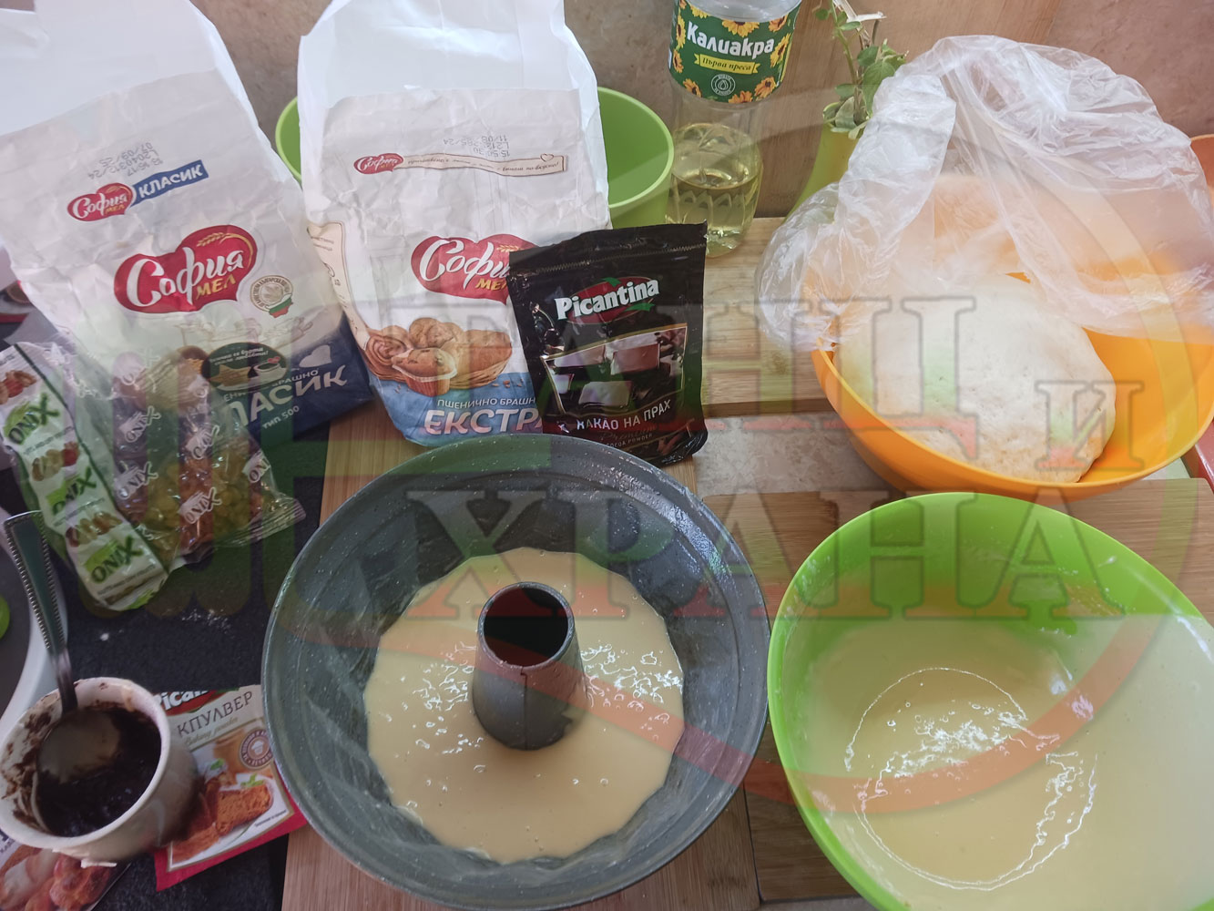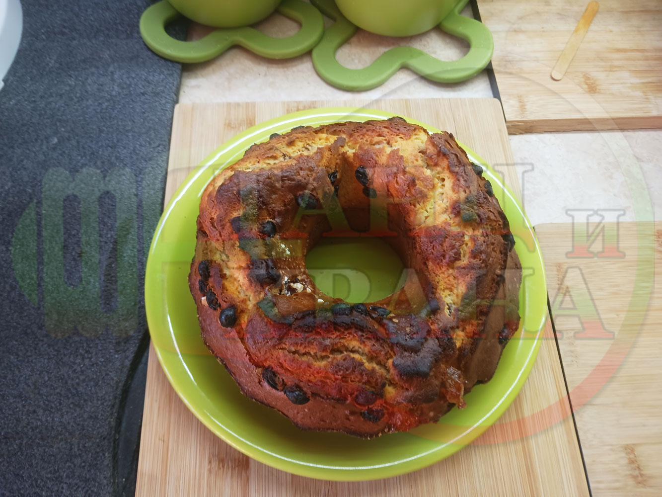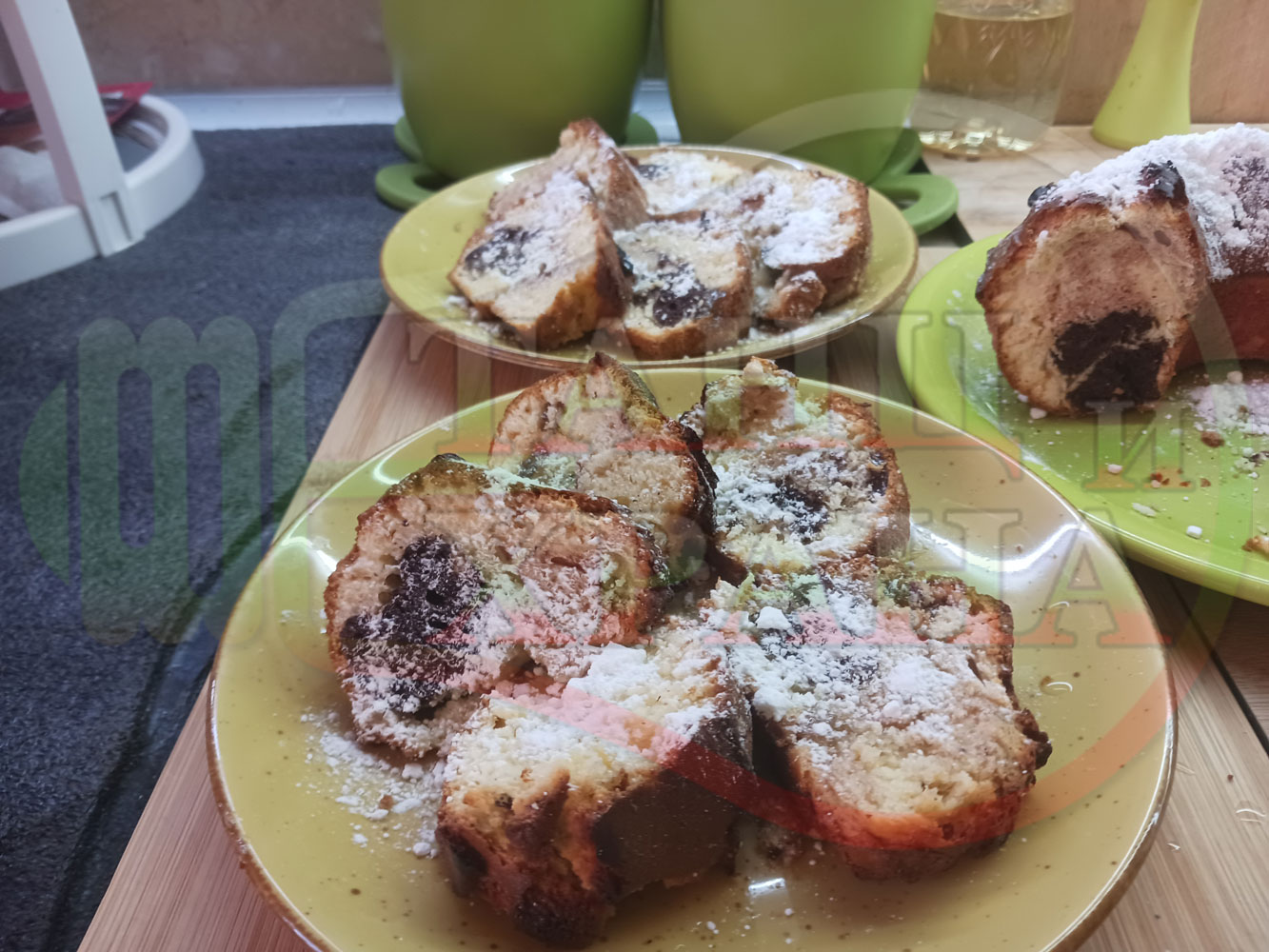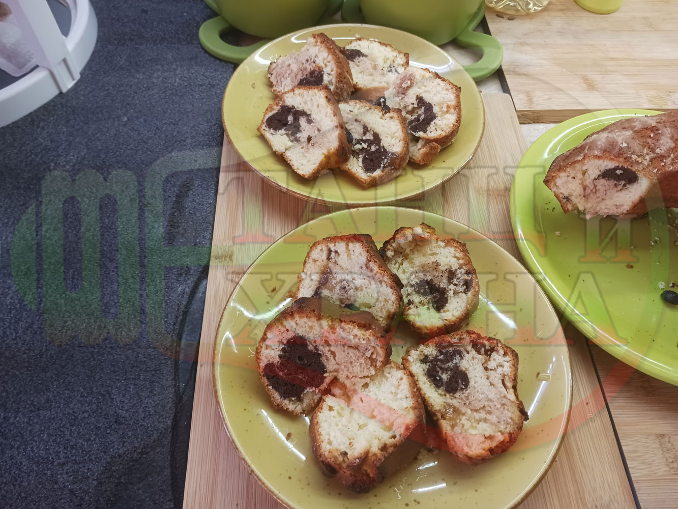 Кекс "Какаоволокумен златностафиден" приготвен с яйца, брашно, прясно мляко, кристална захар и какао с плънка от златни стафиди и локум с мед, орехи и канела