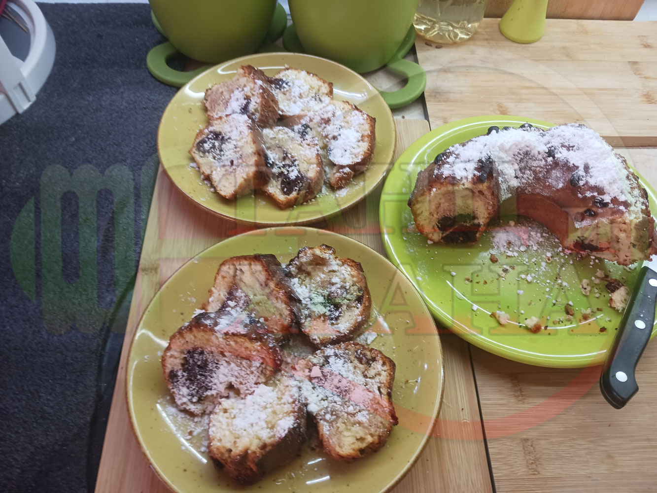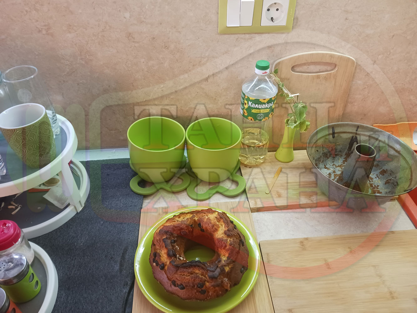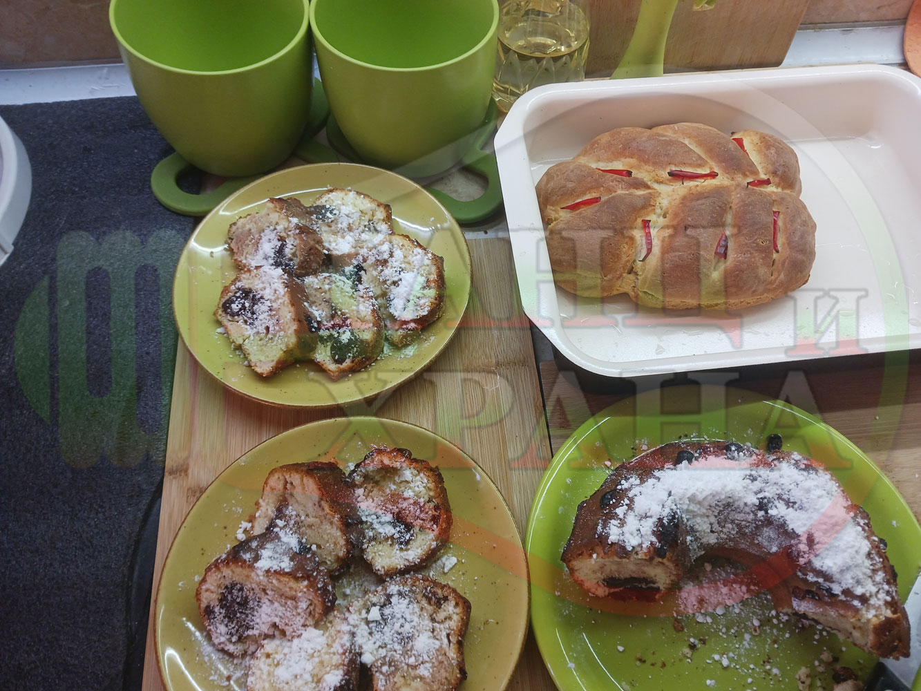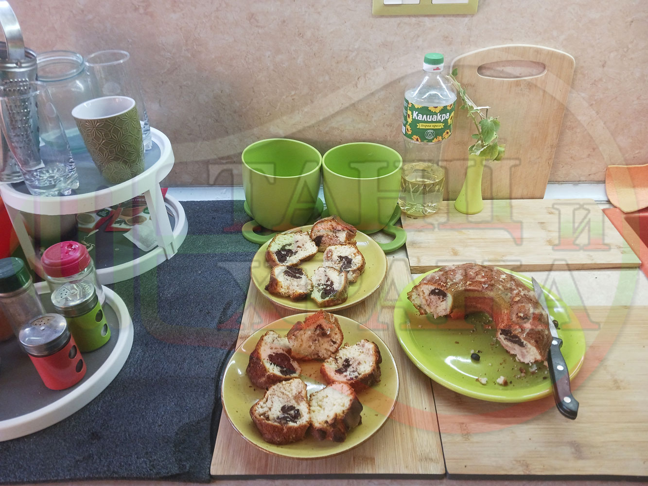 Кекс "Какаоволокумен златностафиден" приготвен с яйца, брашно, прясно мляко, кристална захар и какао с плънка от златни стафиди и локум с мед, орехи и канела