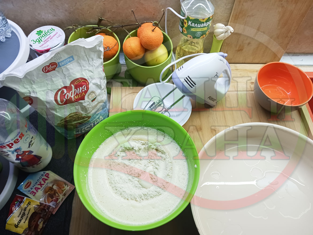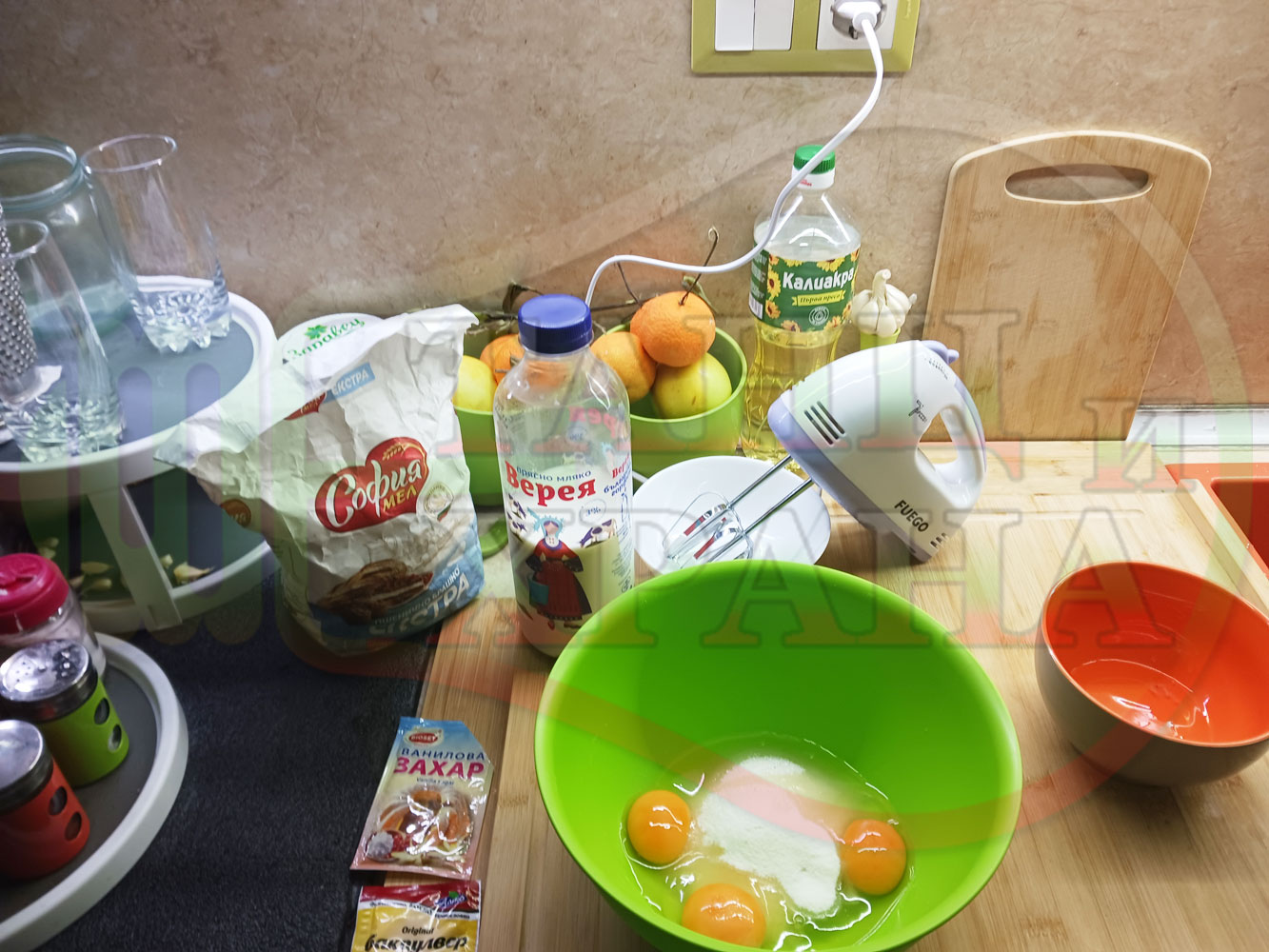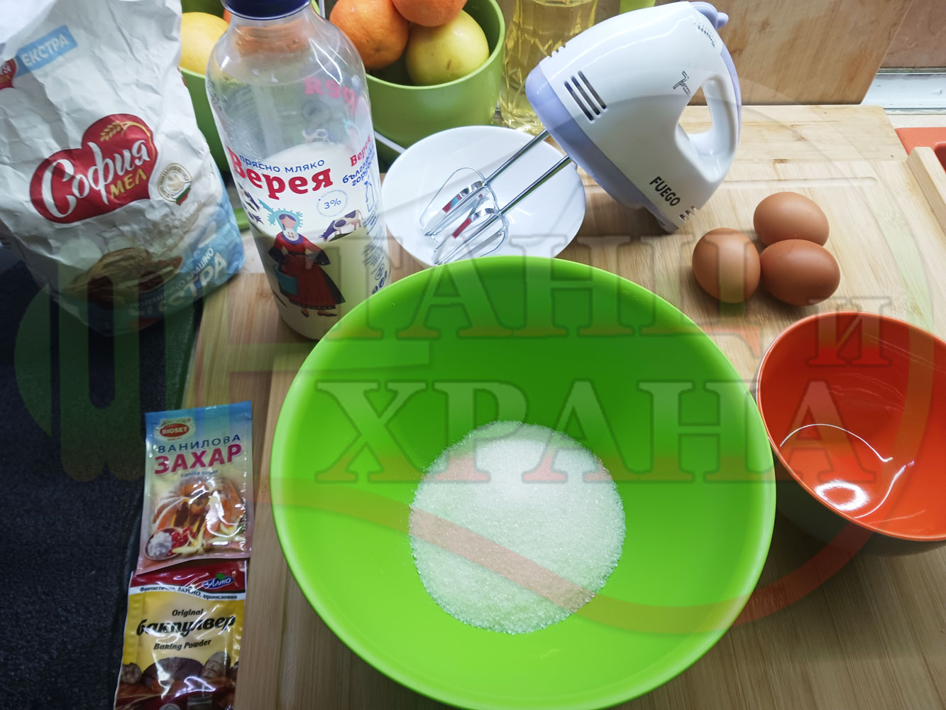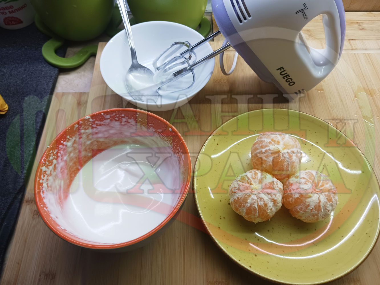 ПРОДУКТИ: Приблизителни количества за мандаринова кексова торта "Мандариновобелтъчна" изпечена на фурна с белтъчен крем и пресни мандарини приготвена с кексово тесто с яйца, брашно с набухвател, слънчогледово олио и прясно мляко