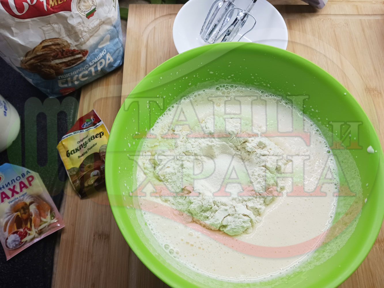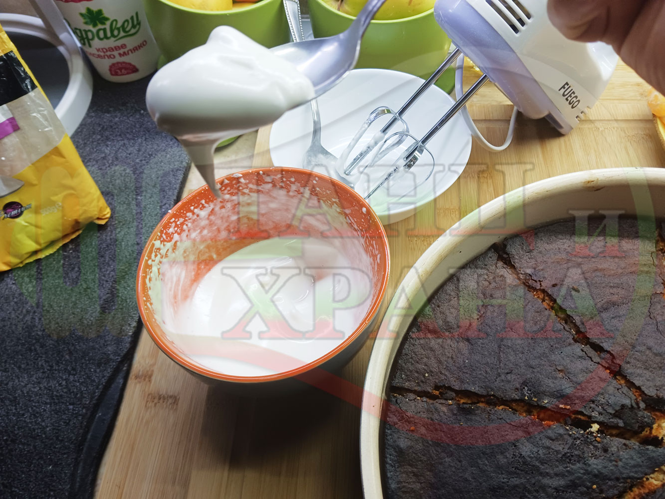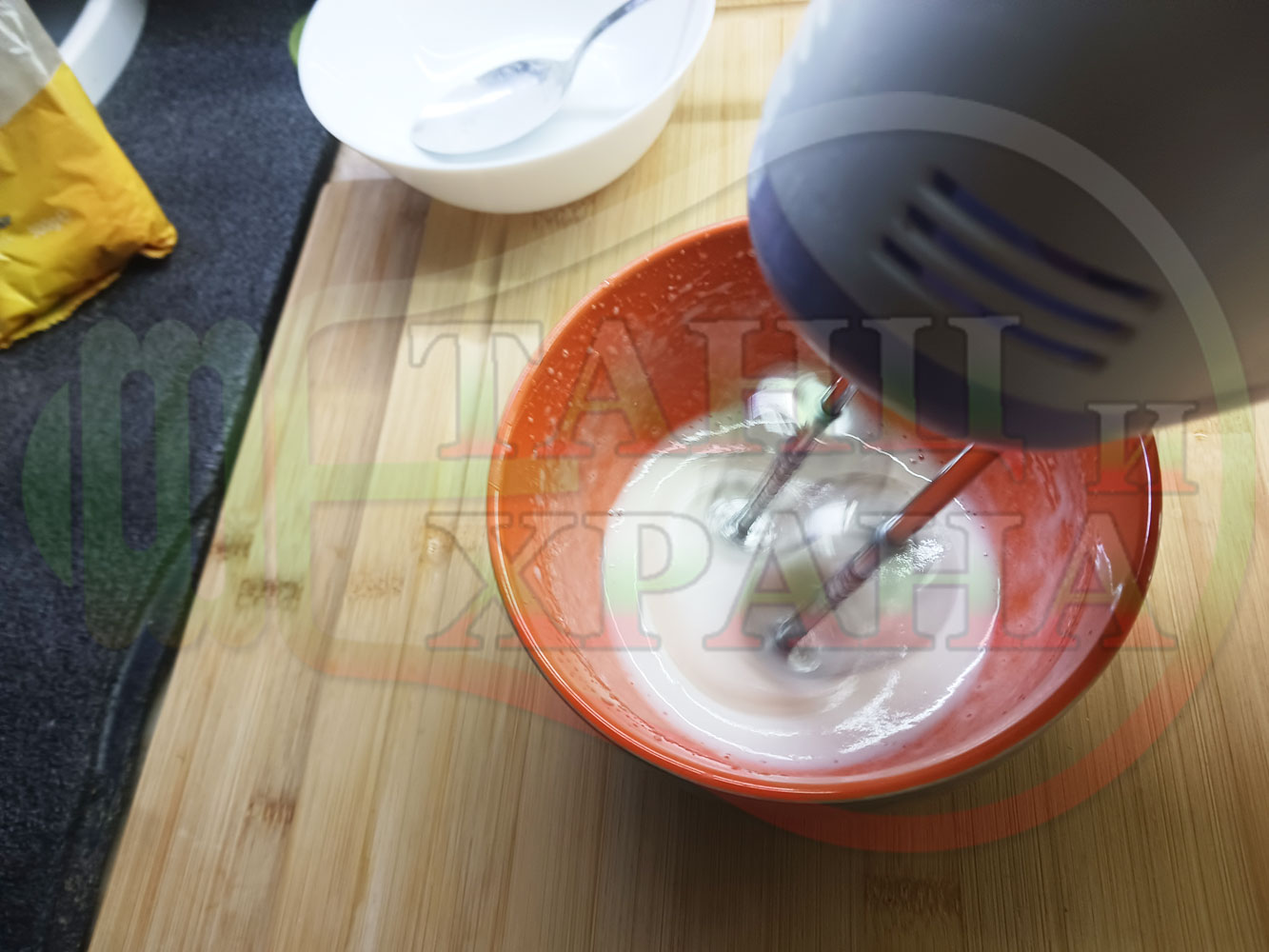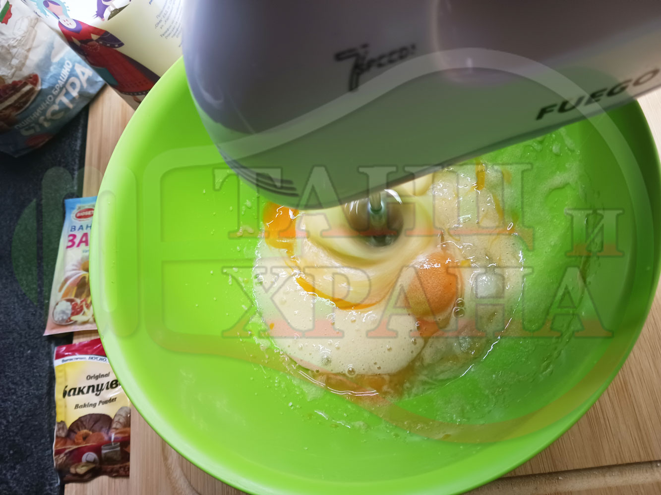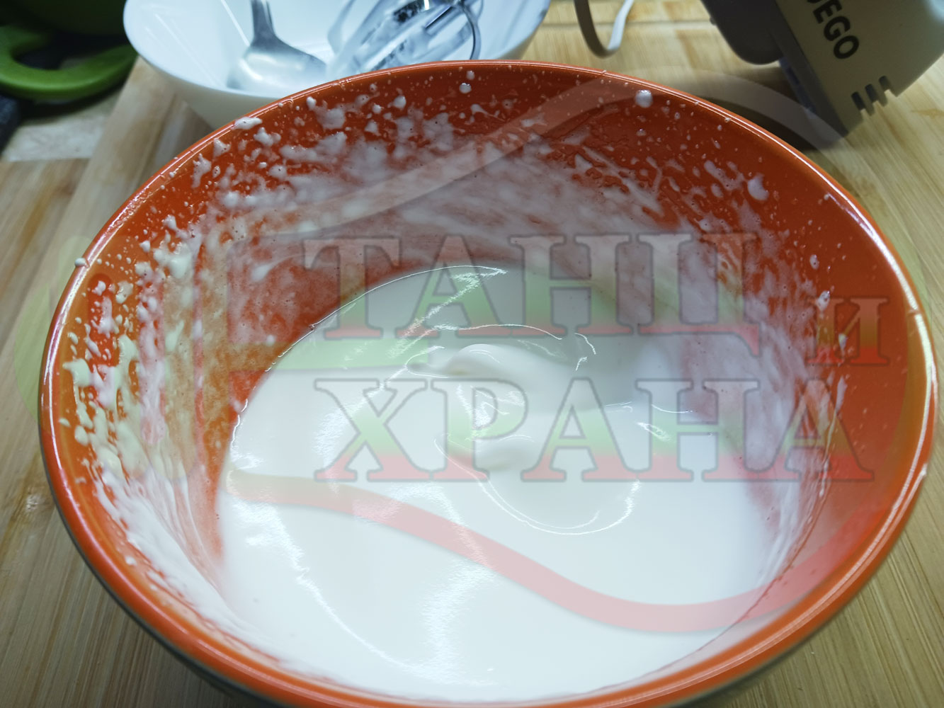 Сипете пудрата захар при заделения белтък от 1-то яйце и го разбийте с миксер до образуване на гъст, белтъчен крем (белтъчният крем не трябва да се разтича).