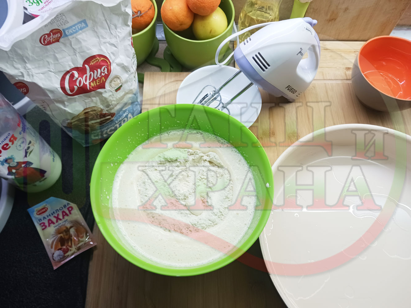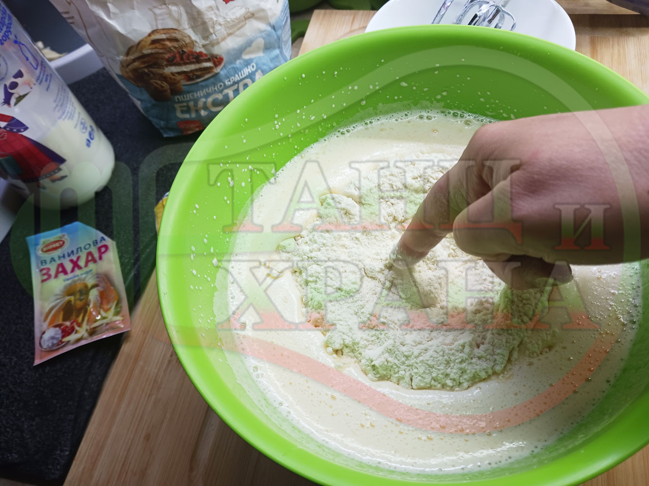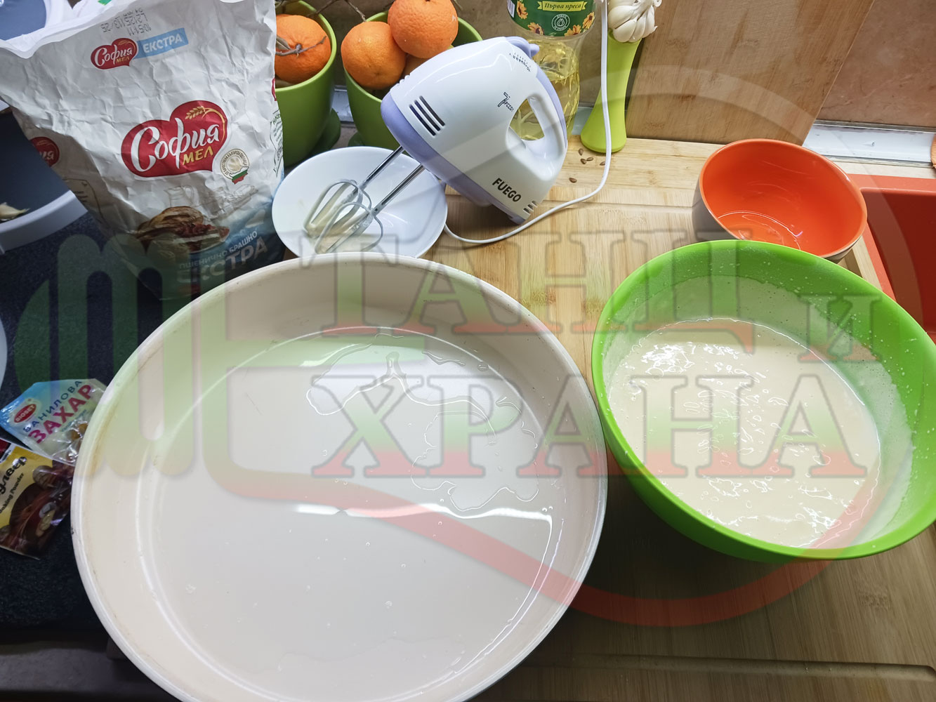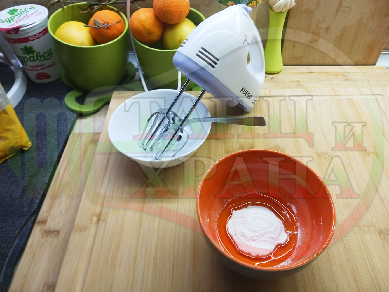 Сипете пудрата захар при заделения белтък от 1-то яйце и го разбийте с миксер до образуване на гъст, белтъчен крем (белтъчният крем не трябва да се разтича).