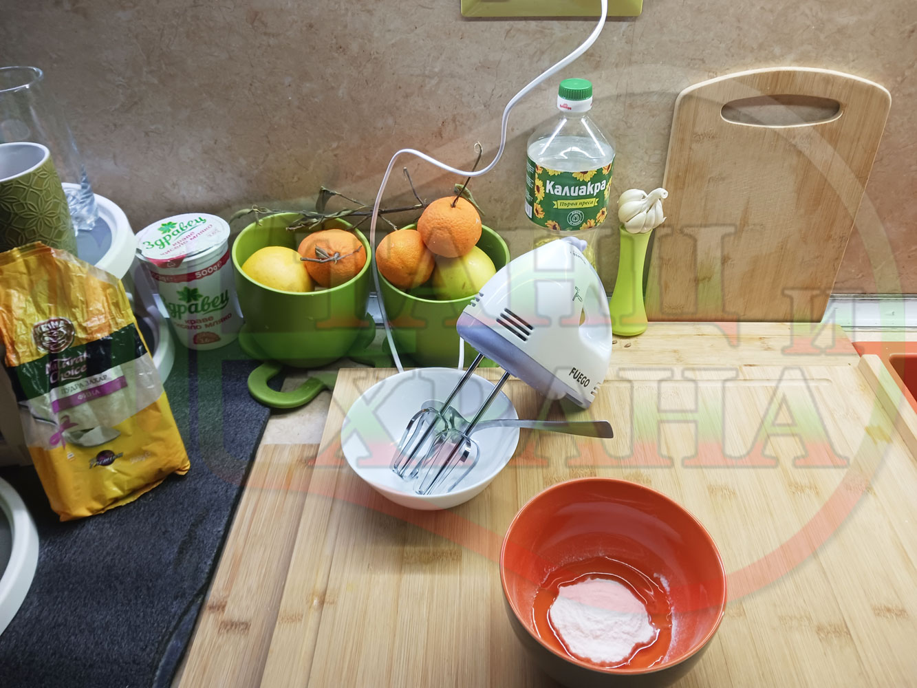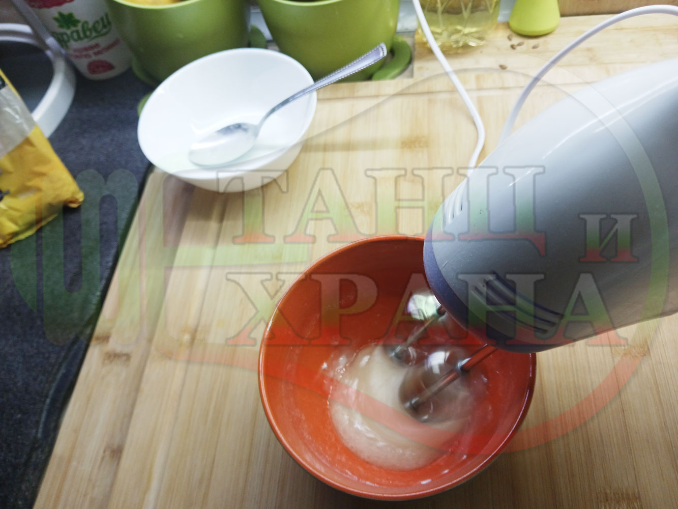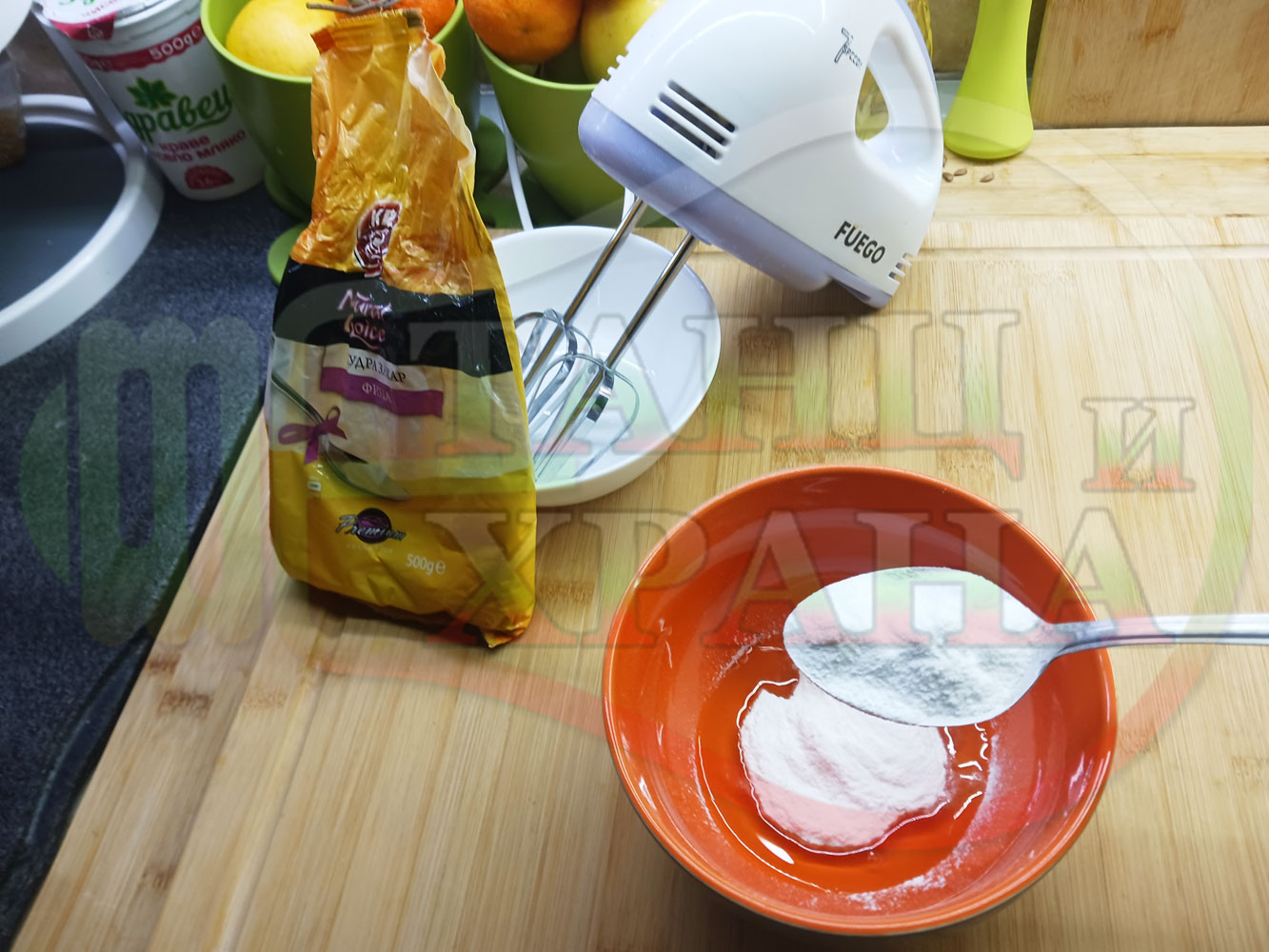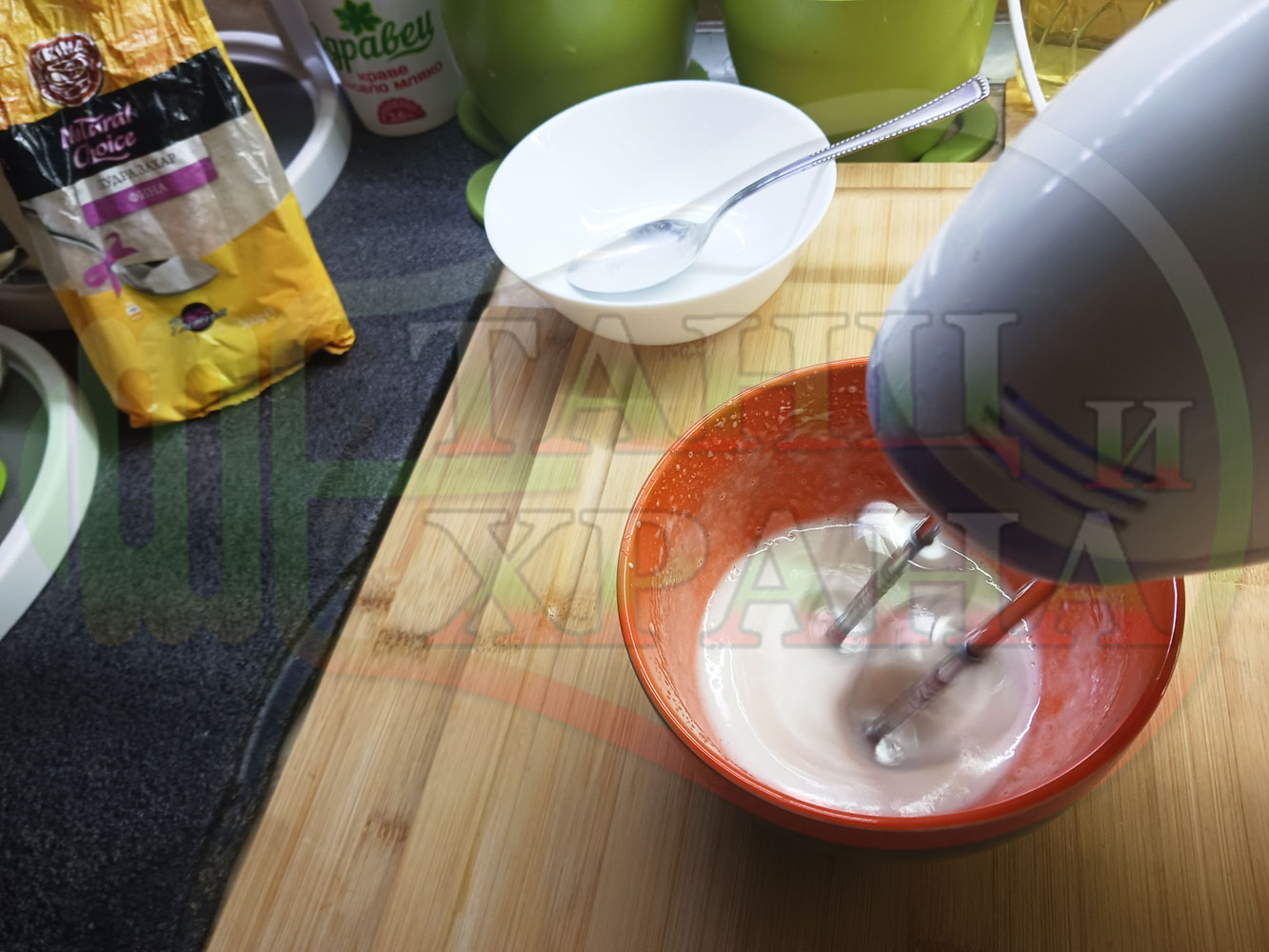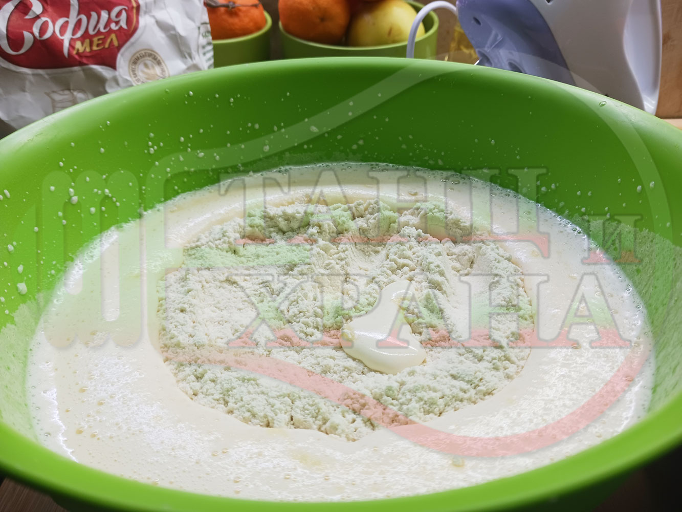 Сипете пудрата захар при заделения белтък от 1-то яйце и го разбийте с миксер до образуване на гъст, белтъчен крем (белтъчният крем не трябва да се разтича).