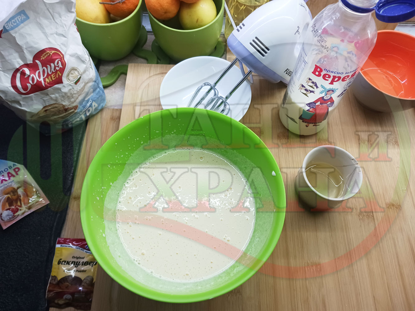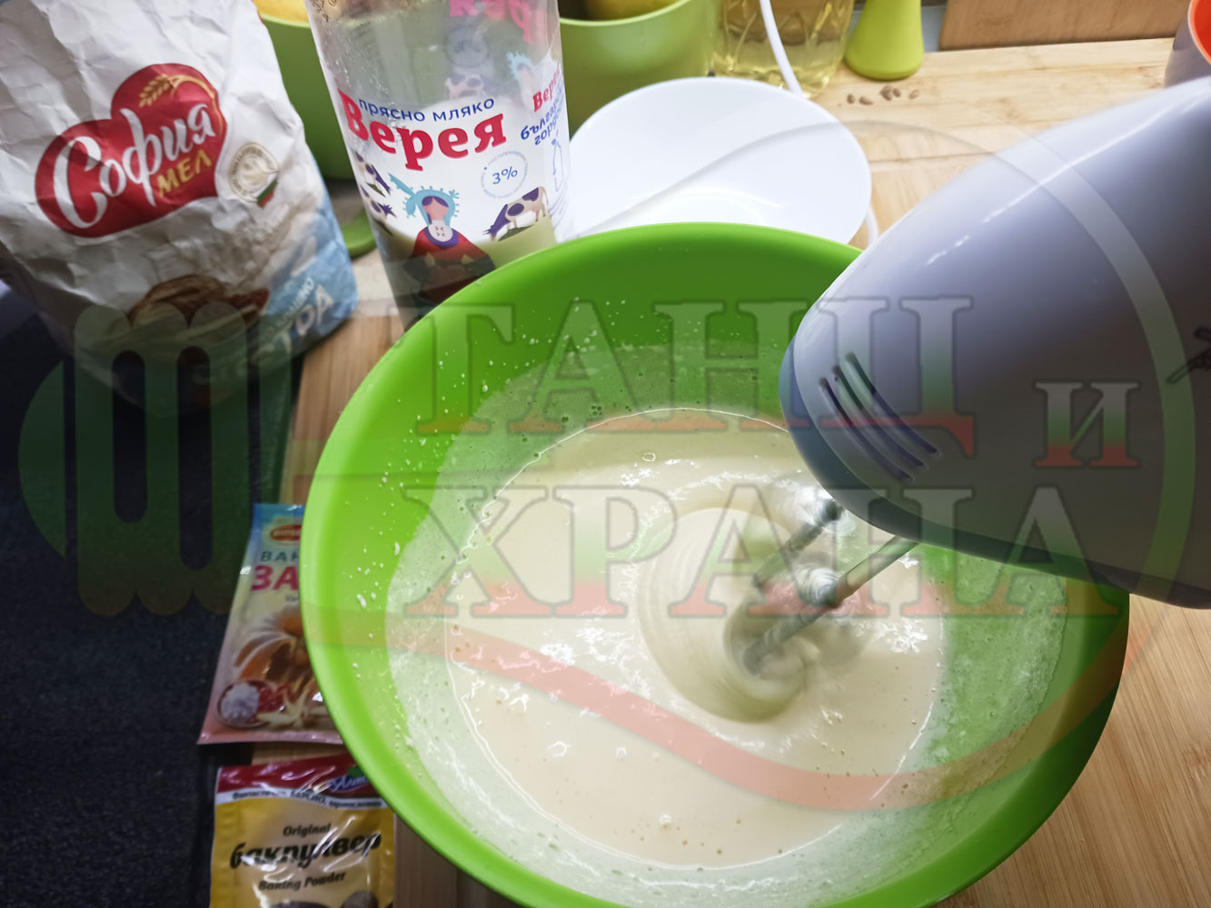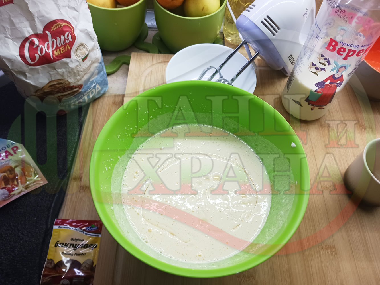 Сипете захарта и ваниловата захар в дълбока купа и добавете 2 цели яйца и 1 жълтък (запазете белтъка за белтъчния крем). Разбийте захарта с яйцата и жълтъка с миксер и сипете слънчогледовото олио и прясното мляко. Отново разбийте с миксера до образуване на пухкава кремообразна и средно гъста смес. Сипете брашното в яйчено млечната захарна смес и направете малко "кладенче" в брашното. Сипете бакпулвера в кладенчето и леко го разбъркайте в брашното за да се смеси напълно с брашното. След като сте смесили бакпулвера с брашното, започнете да разбивате с миксера на по-ниска скорост до образуване на средно гъсто кексово, хомогенизирано тесто (кексовото тесто при изсипване се "дипли" и на снимките се вижка каква трябва да е гъстотата).