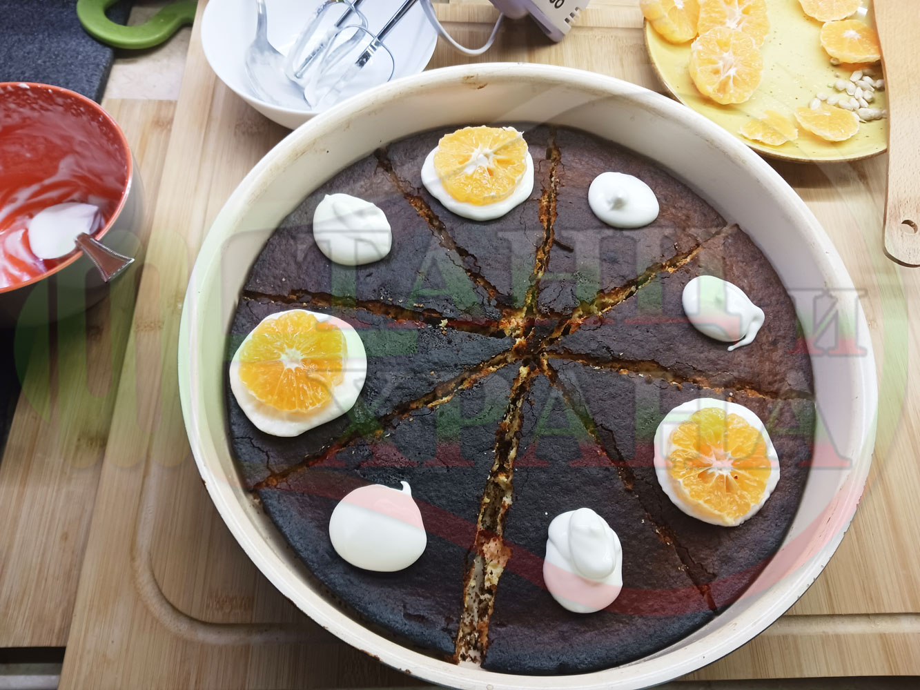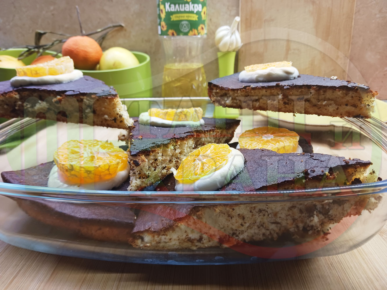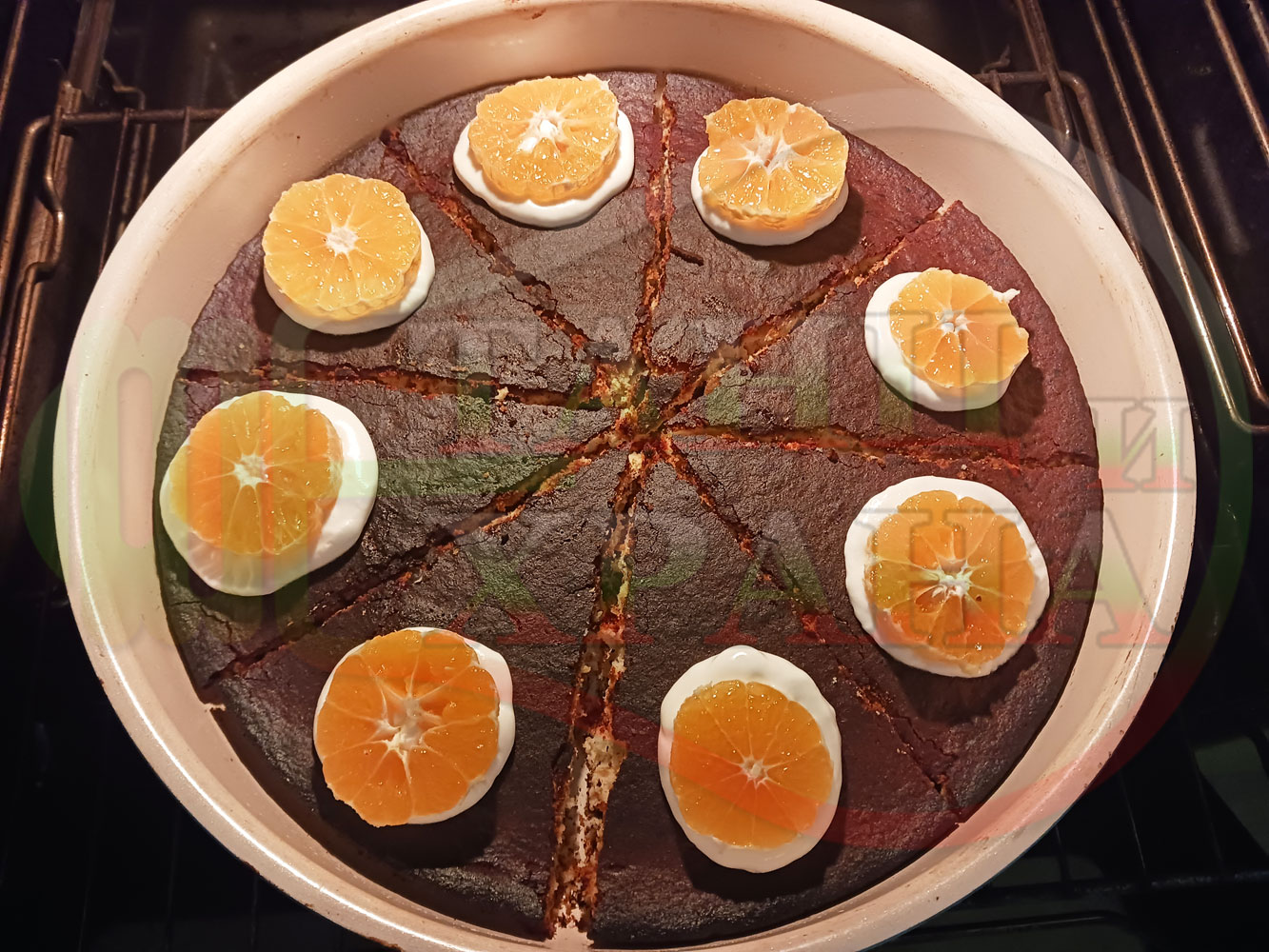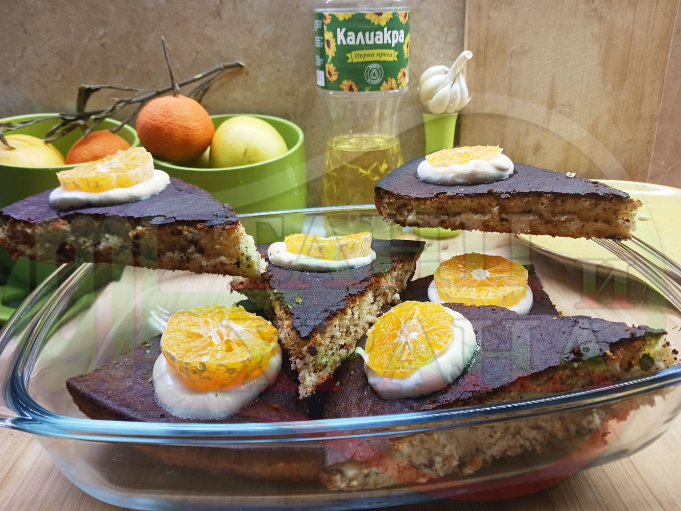 Мандаринова кексова торта "Мандариновобелтъчна" изпечена на фурна с белтъчен крем и пресни мандарини приготвена с кексово тесто с яйца, брашно с набухвател, слънчогледово олио и прясно мляко