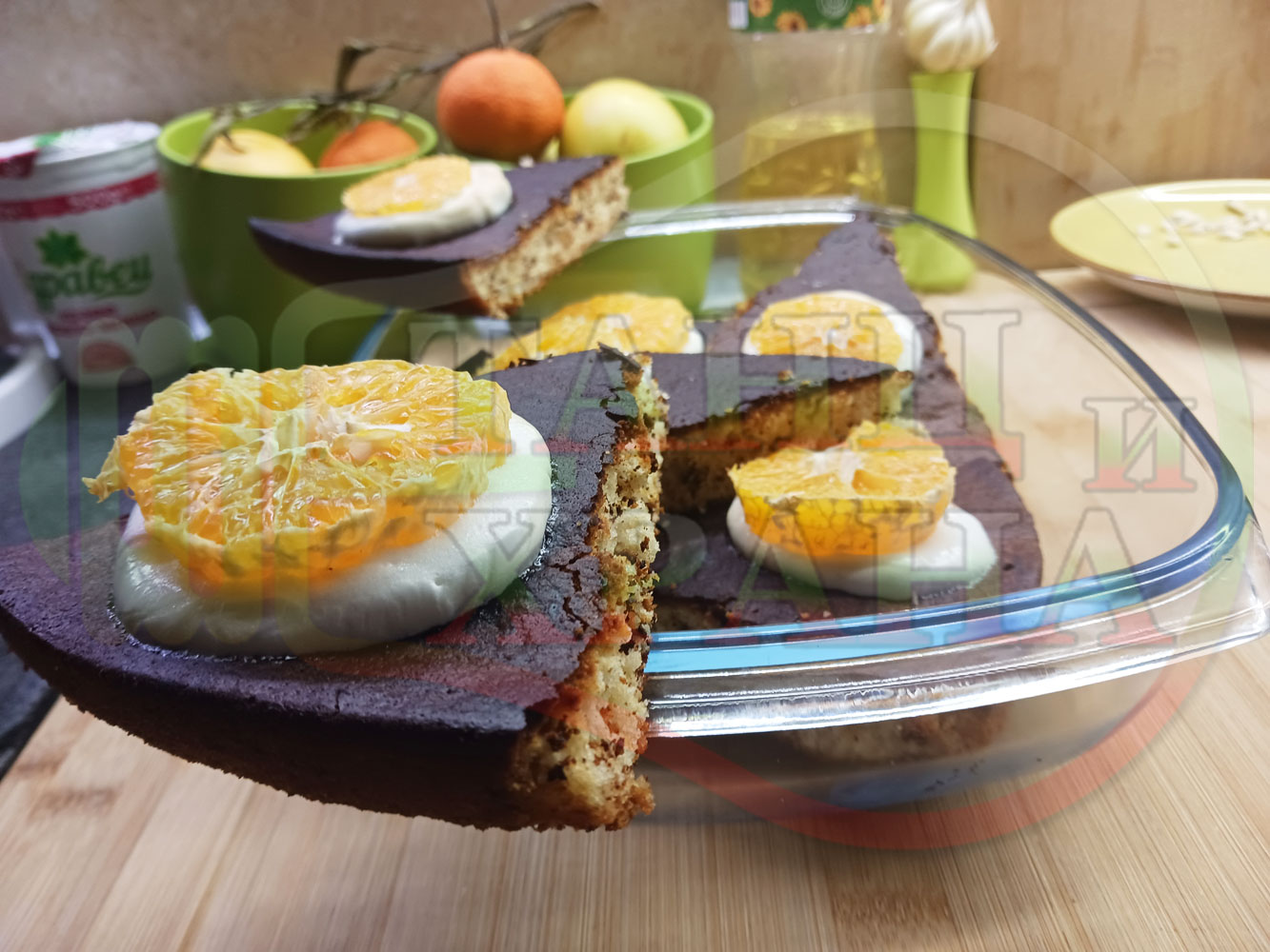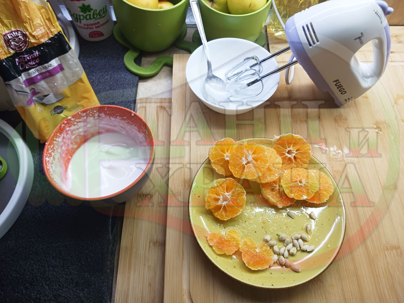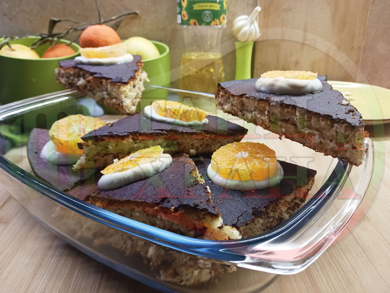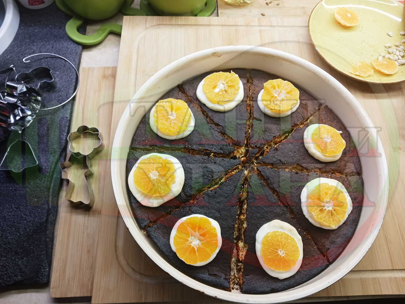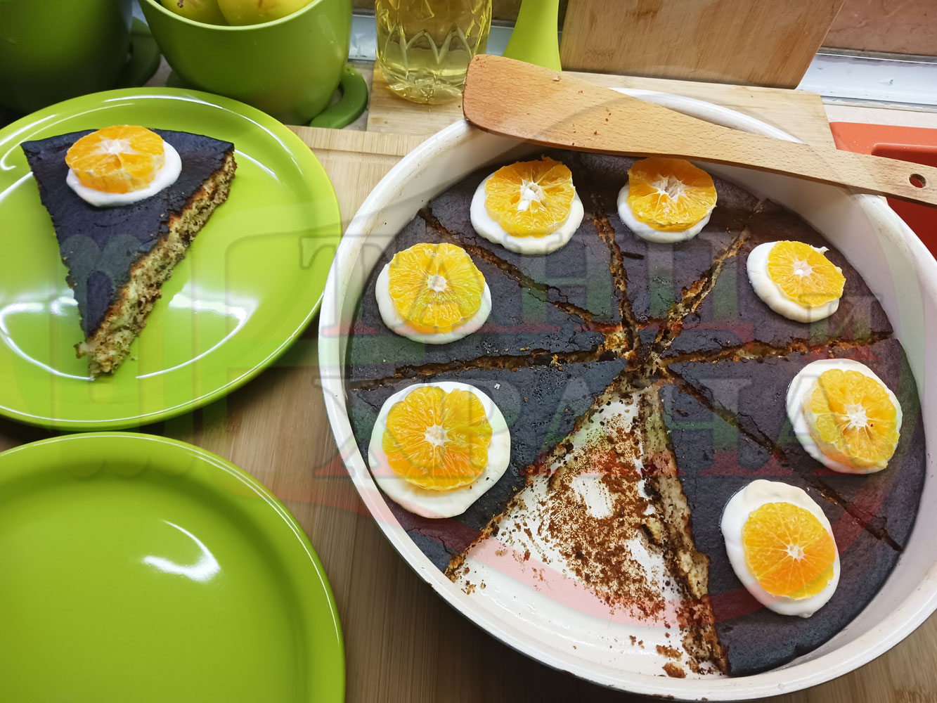 Мандаринова кексова торта "Мандариновобелтъчна" изпечена на фурна с белтъчен крем и пресни мандарини приготвена с кексово тесто с яйца, брашно с набухвател, слънчогледово олио и прясно мляко