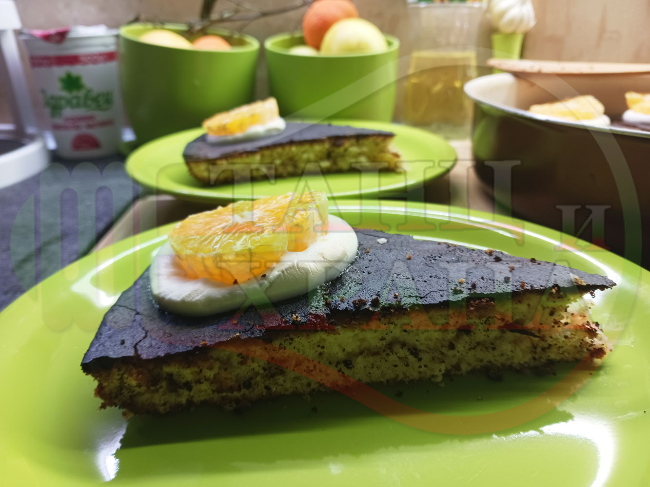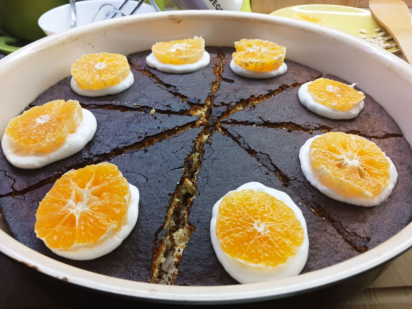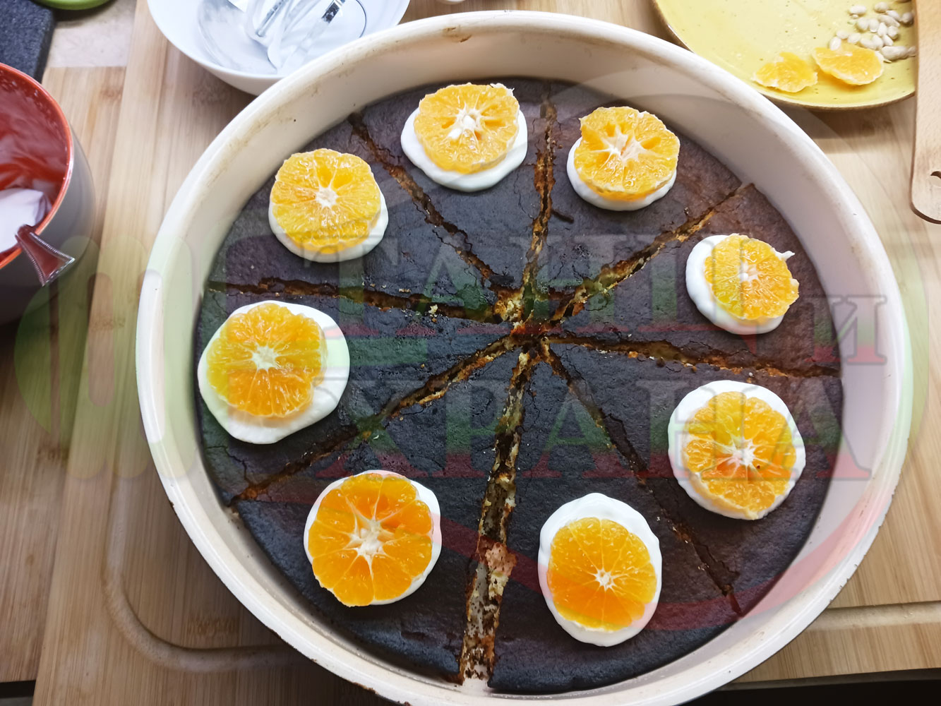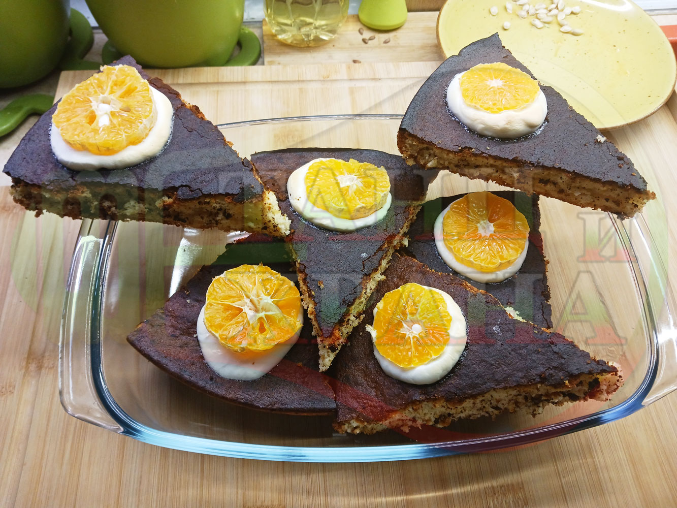 Мандаринова кексова торта "Мандариновобелтъчна" изпечена на фурна с белтъчен крем и пресни мандарини приготвена с кексово тесто с яйца, брашно с набухвател, слънчогледово олио и прясно мляко