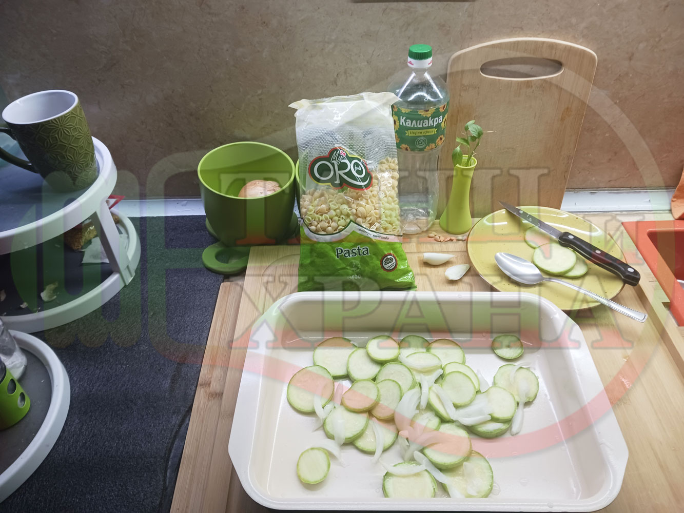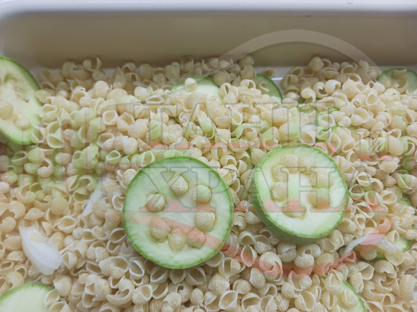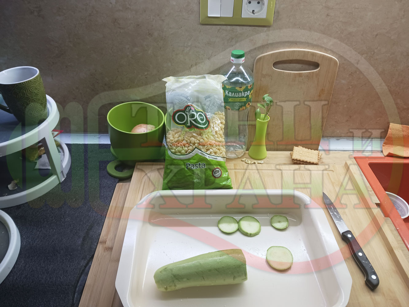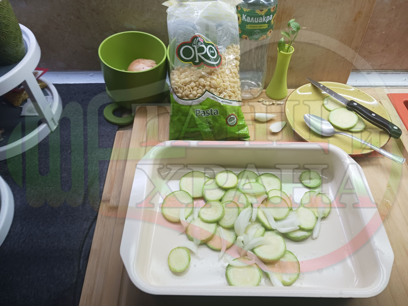 ПРОДУКТИ: Приблизителни количества за български макарони "Тиквичкови луканковотелешки с БГсирене" сварени на фурна с кромид лук, тиквички, червен сладък пипер и телешка луканка сурово гарнирани с краве бяло сирене (българско, саламурено) - двукомпонентни