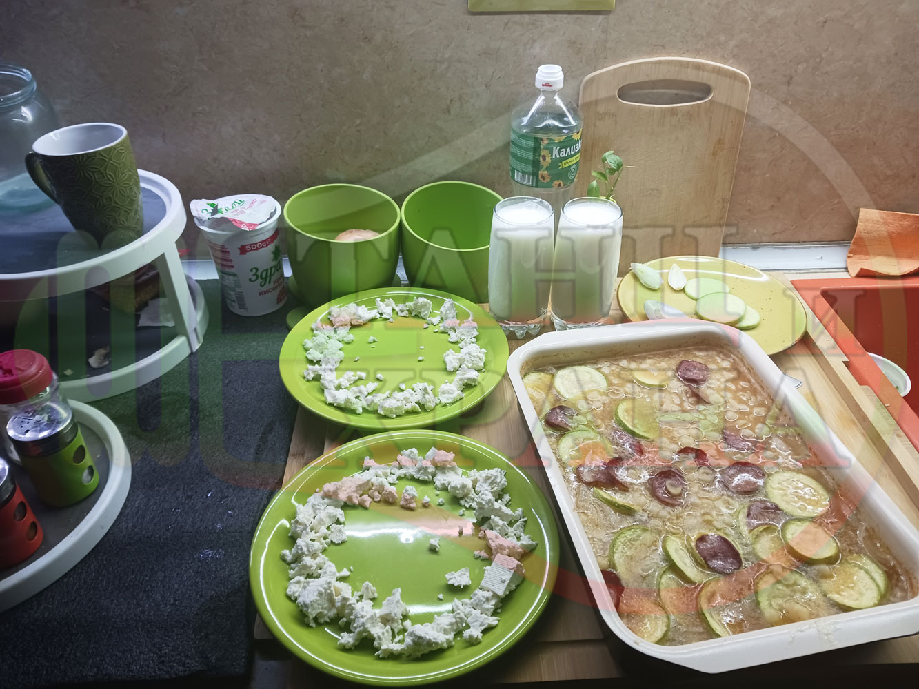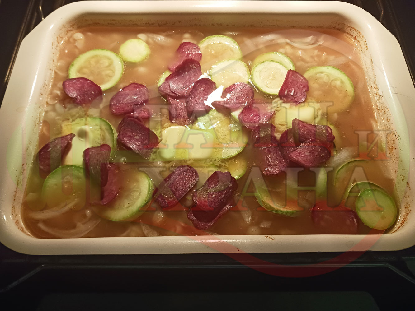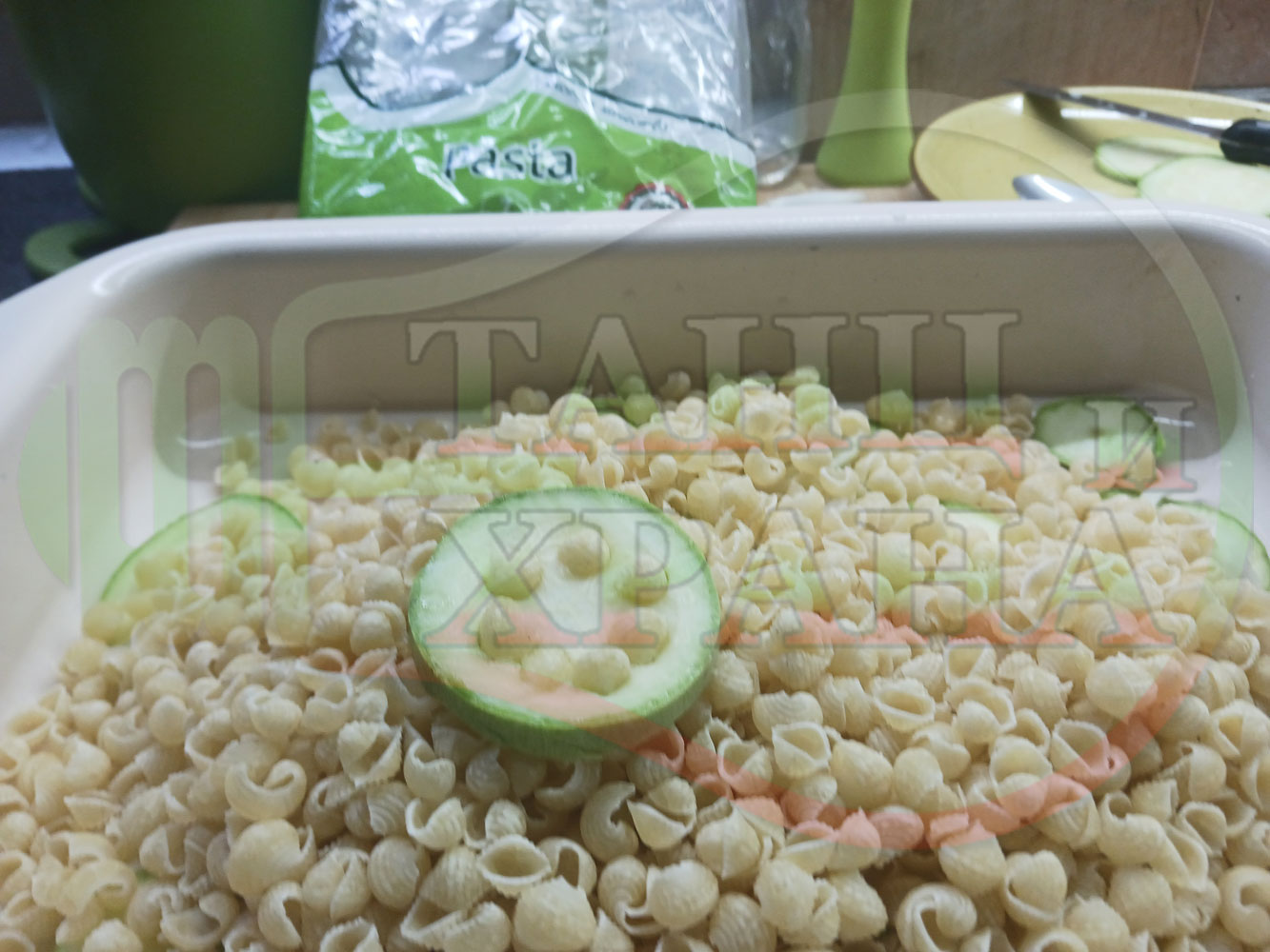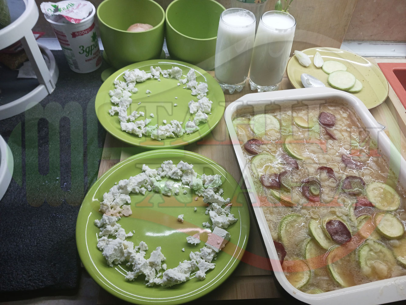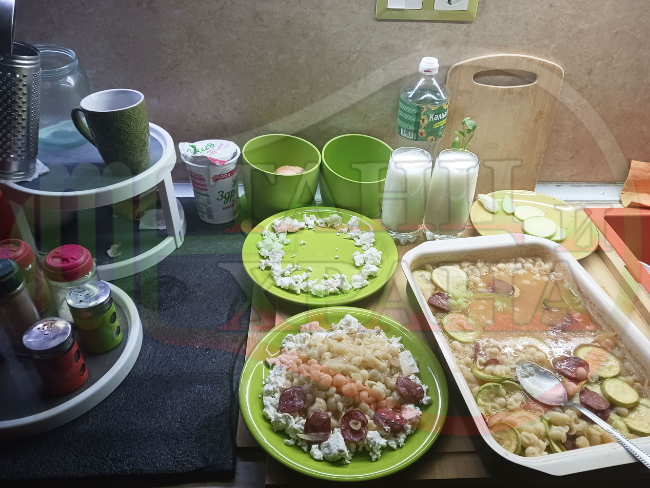 ПРОДУКТИ: Приблизителни количества за български макарони "Тиквичкови луканковотелешки с БГсирене" сварени на фурна с кромид лук, тиквички, червен сладък пипер и телешка луканка сурово гарнирани с краве бяло сирене (българско, саламурено) - двукомпонентни
