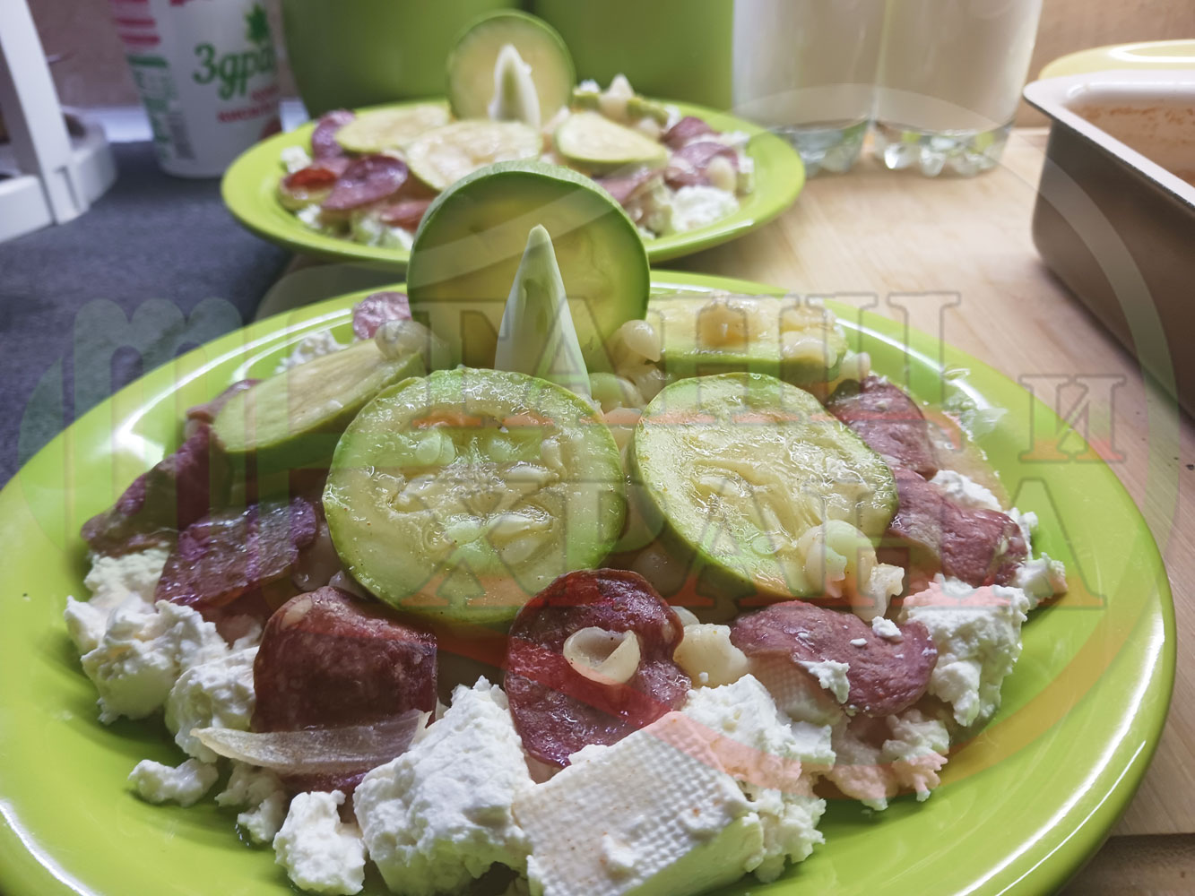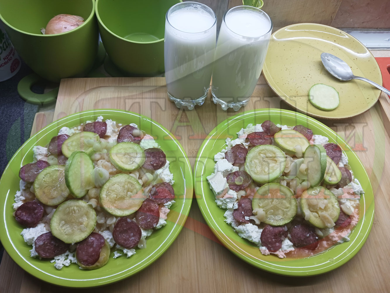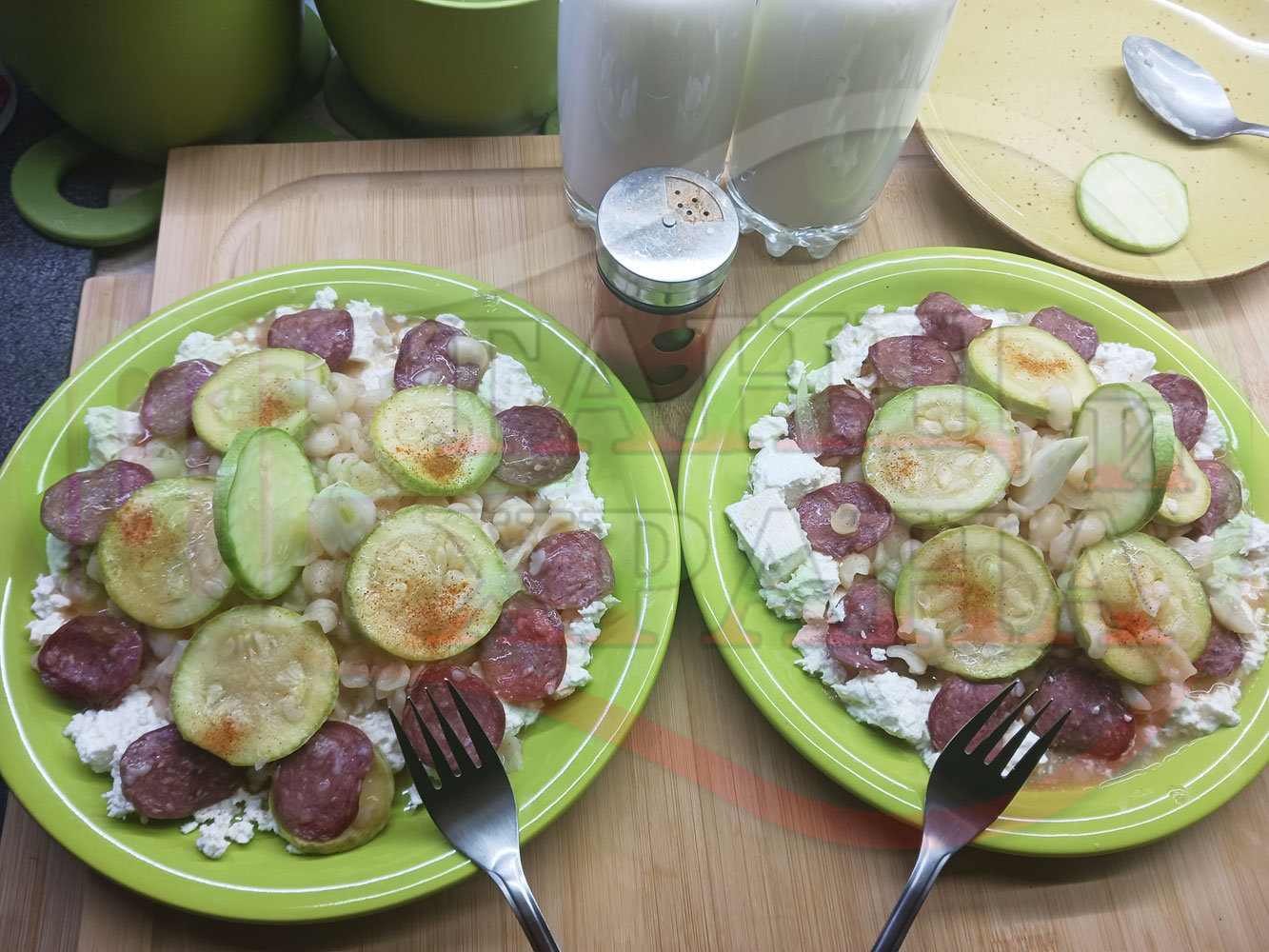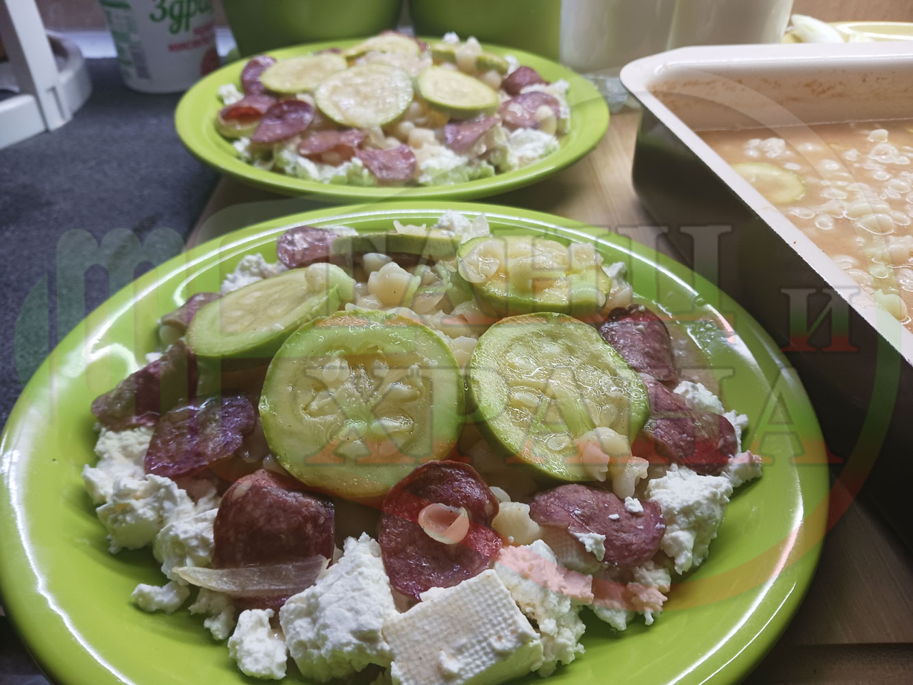 Български макарони "Тиквичкови луканковотелешки с БГсирене" сварени на фурна с кромид лук, тиквички, червен сладък пипер и телешка луканка сурово гарнирани с краве бяло сирене (българско, саламурено) - двукомпонентни