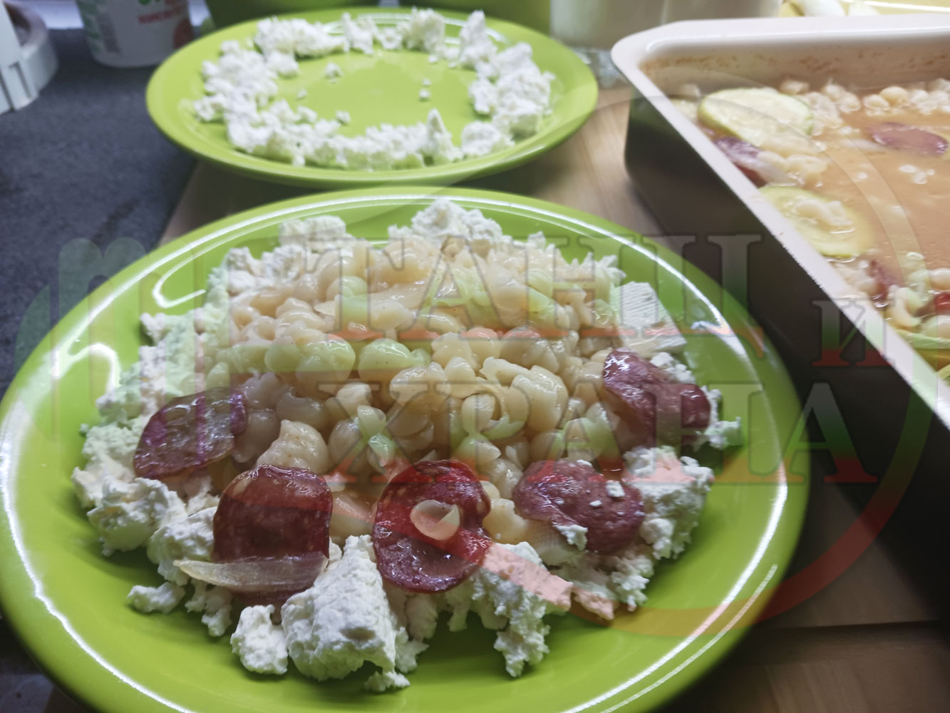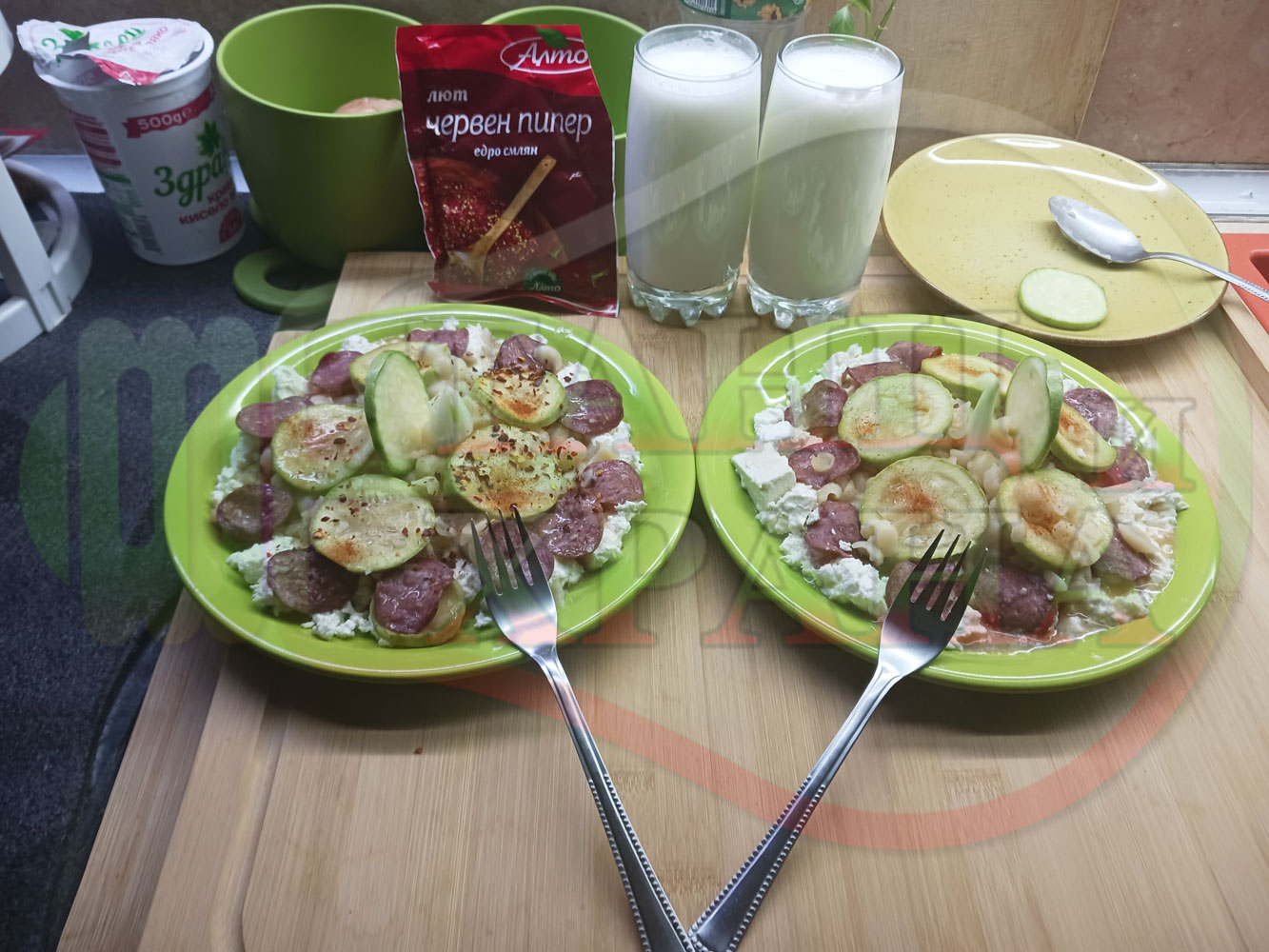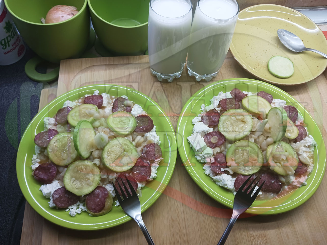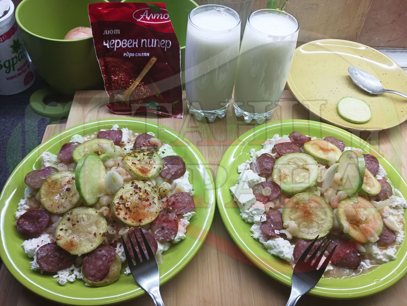 Български макарони "Тиквичкови луканковотелешки с БГсирене" сварени на фурна с кромид лук, тиквички, червен сладък пипер и телешка луканка сурово гарнирани с краве бяло сирене (българско, саламурено) - двукомпонентни