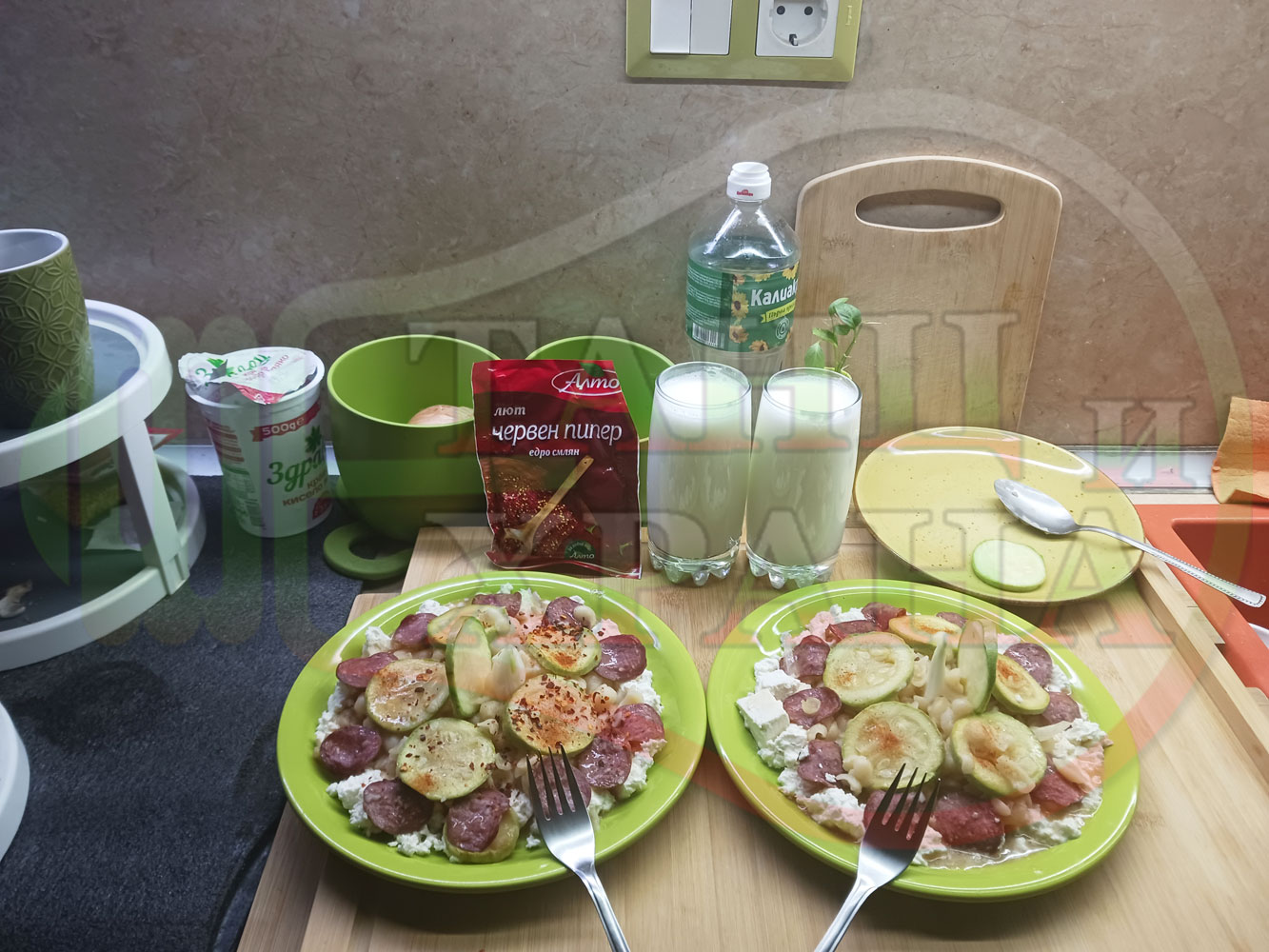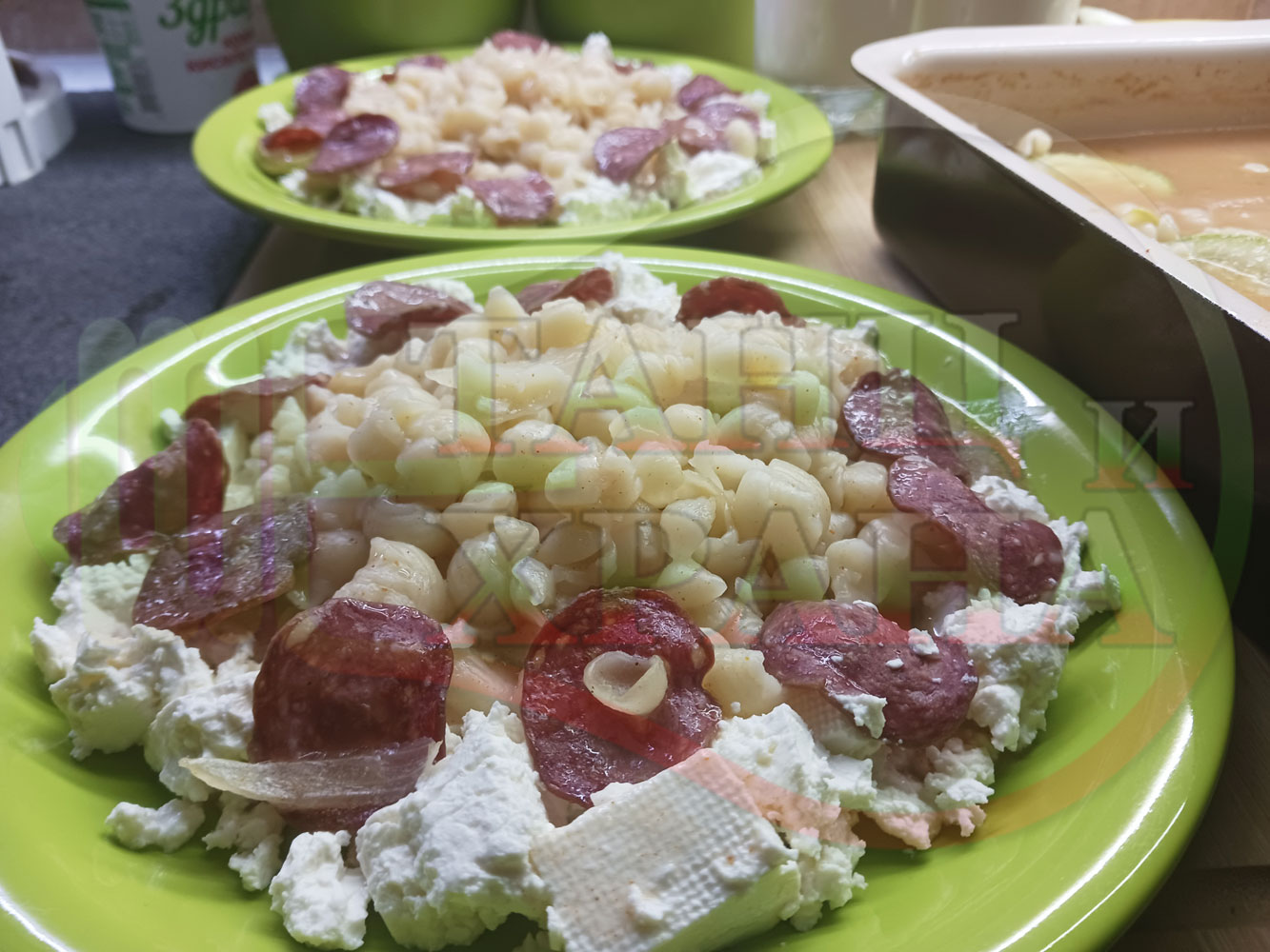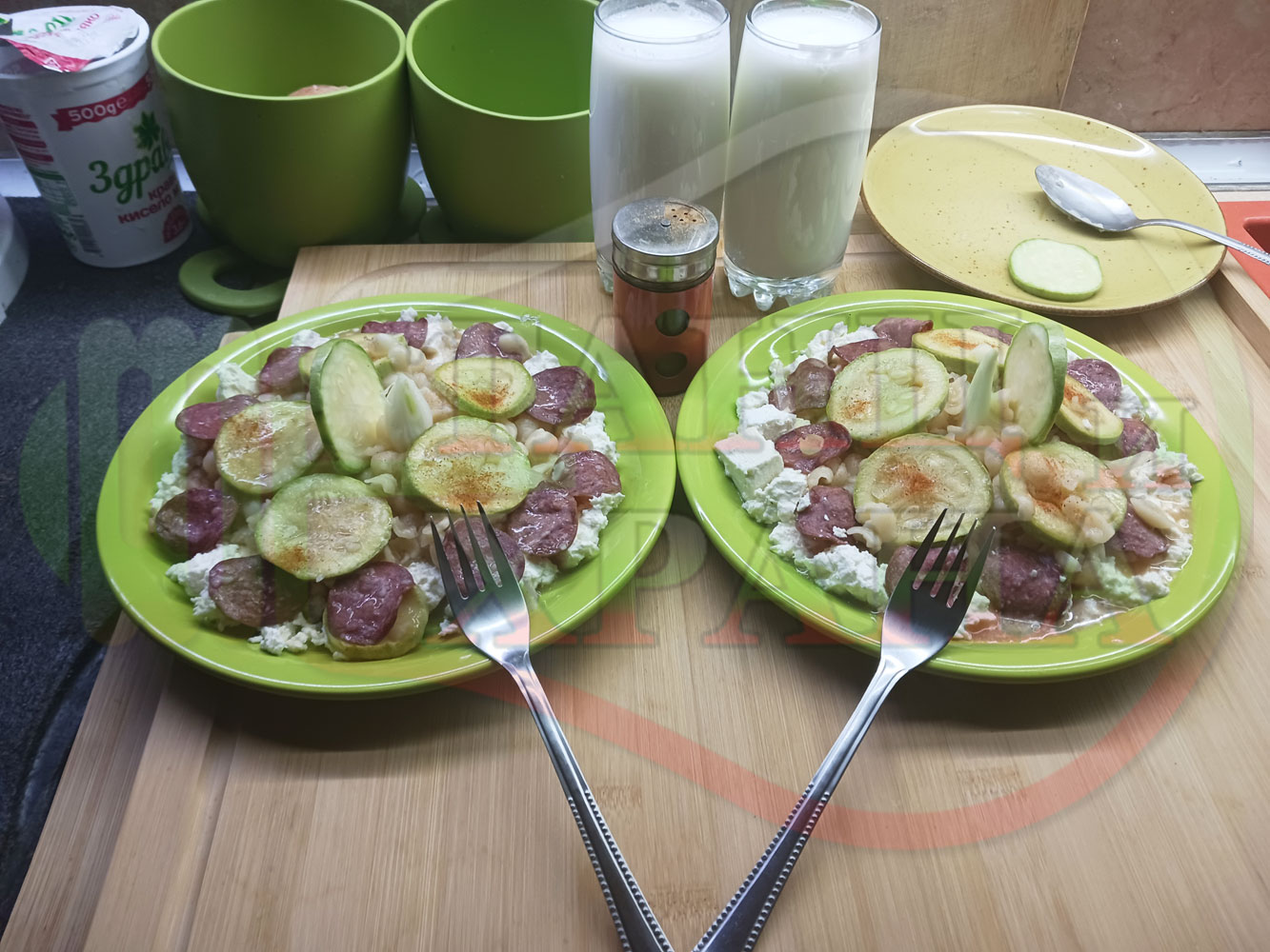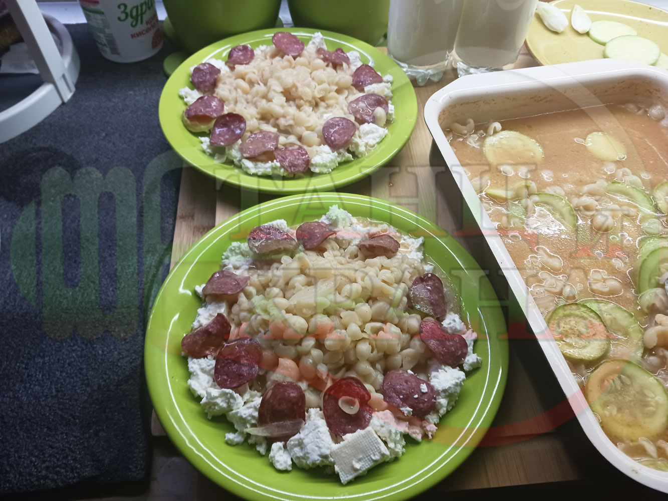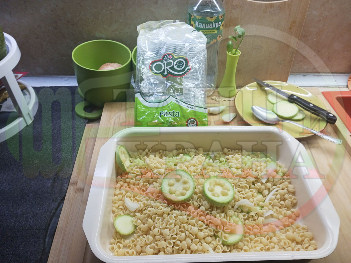 Български макарони "Тиквичкови луканковотелешки с БГсирене" сварени на фурна с кромид лук, тиквички, червен сладък пипер и телешка луканка сурово гарнирани с краве бяло сирене (българско, саламурено) - двукомпонентни