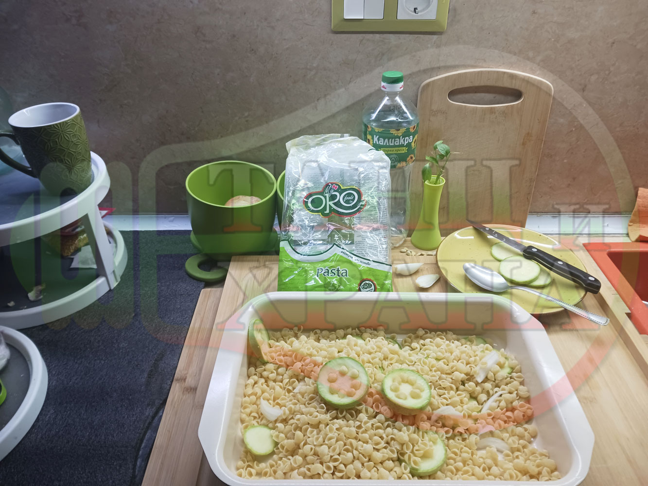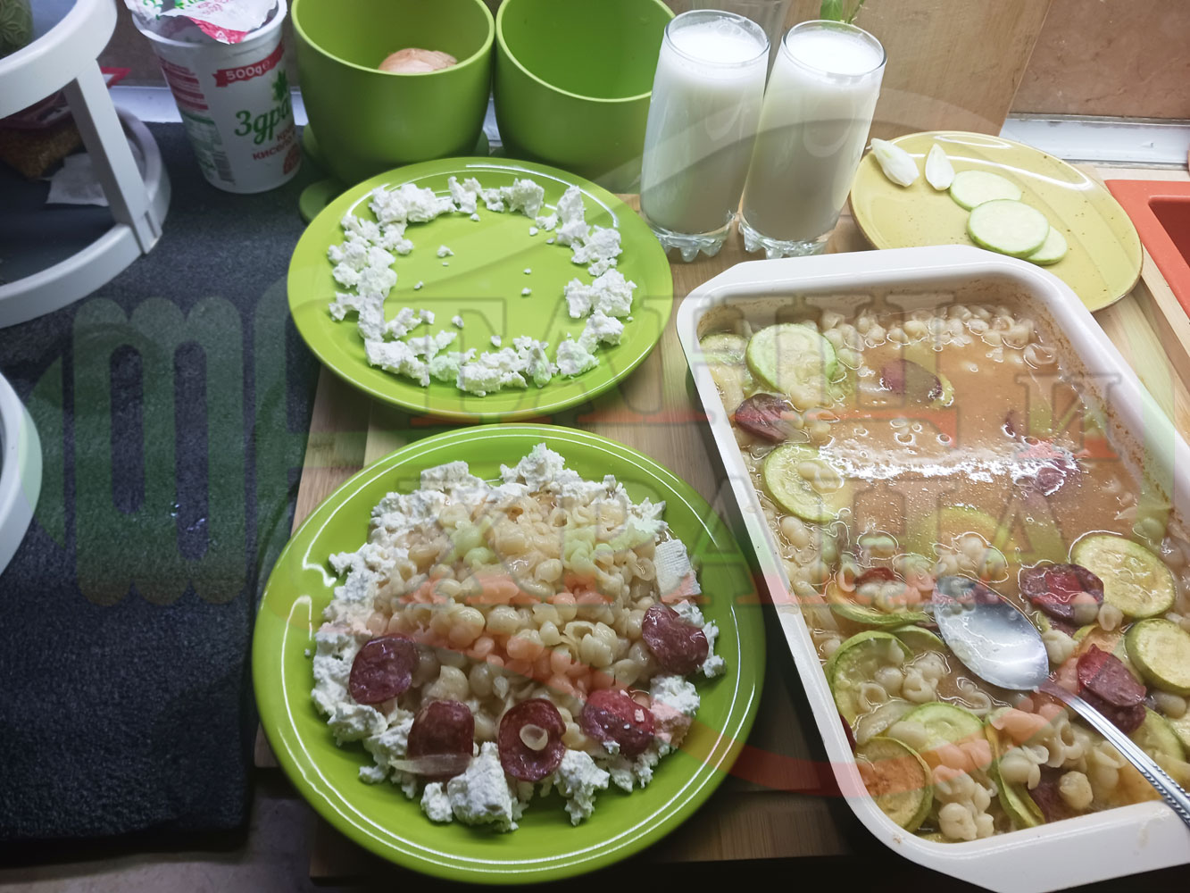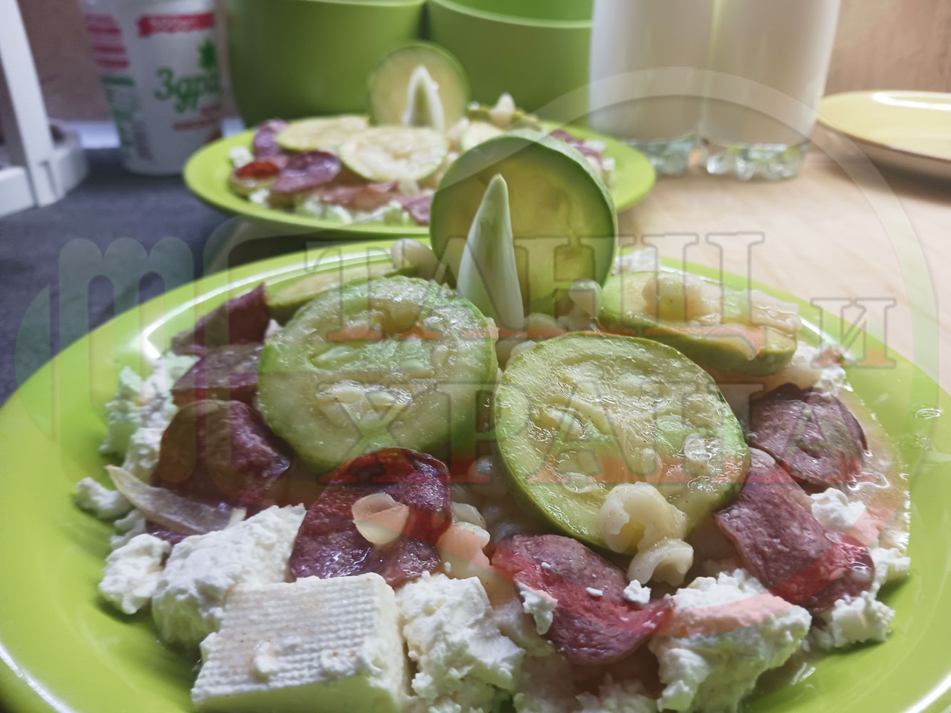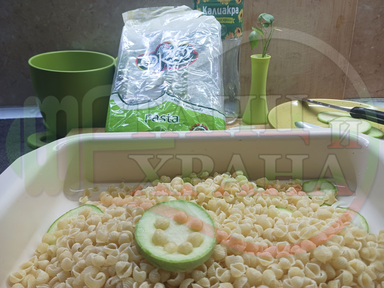Български макарони "Тиквичкови луканковотелешки с БГсирене" сварени на фурна с кромид лук, тиквички, червен сладък пипер и телешка луканка сурово гарнирани с краве бяло сирене (българско, саламурено) - двукомпонентни