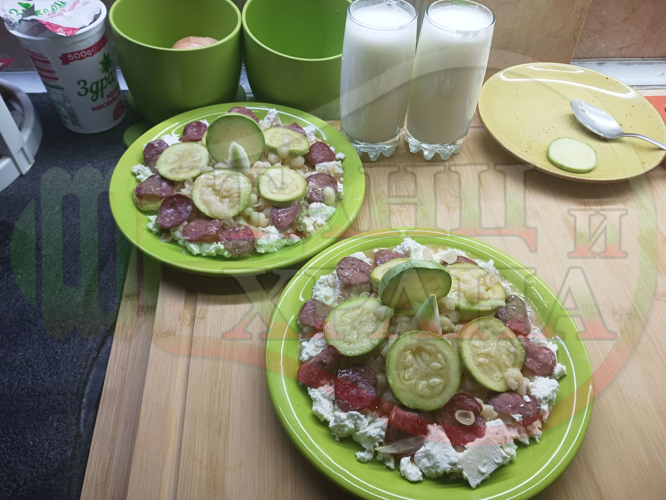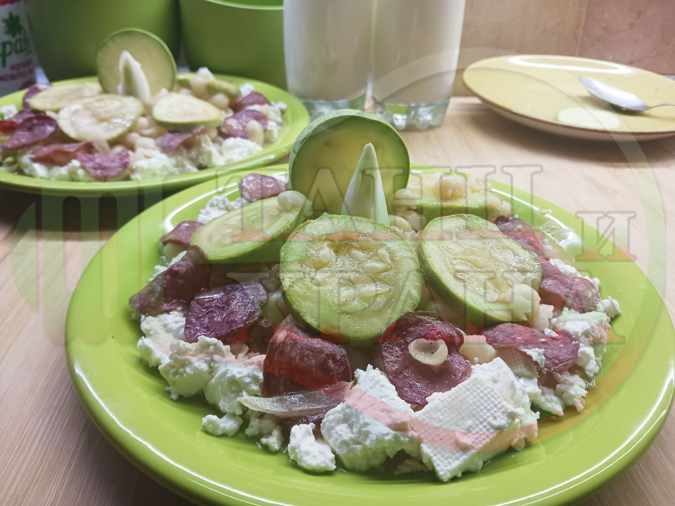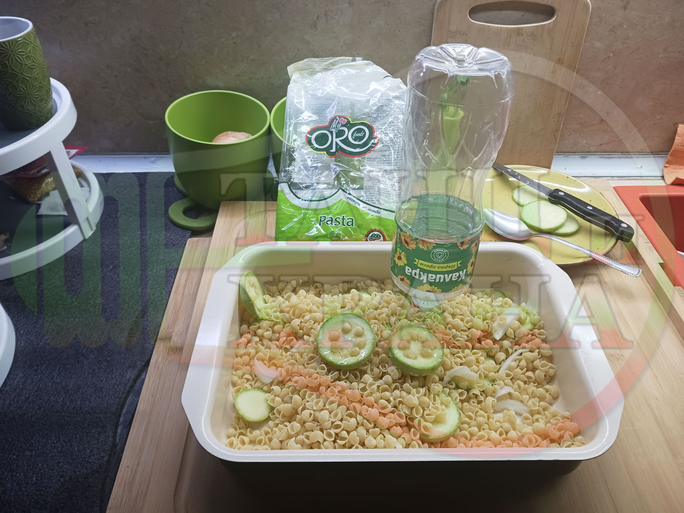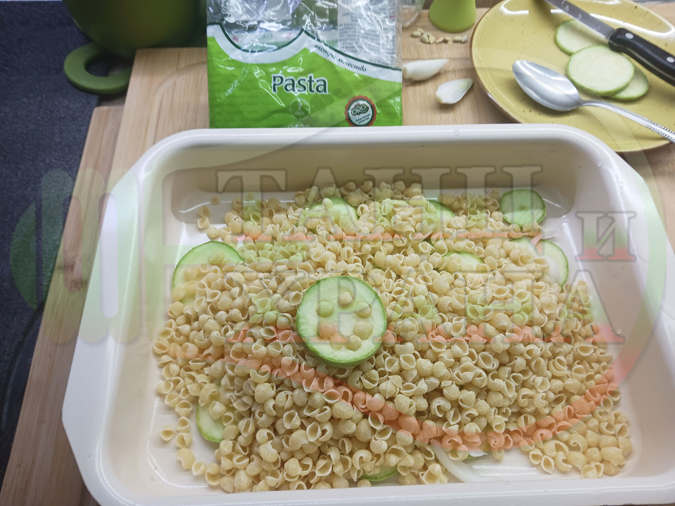 Български макарони "Тиквичкови луканковотелешки с БГсирене" сварени на фурна с кромид лук, тиквички, червен сладък пипер и телешка луканка сурово гарнирани с краве бяло сирене (българско, саламурено) - двукомпонентни