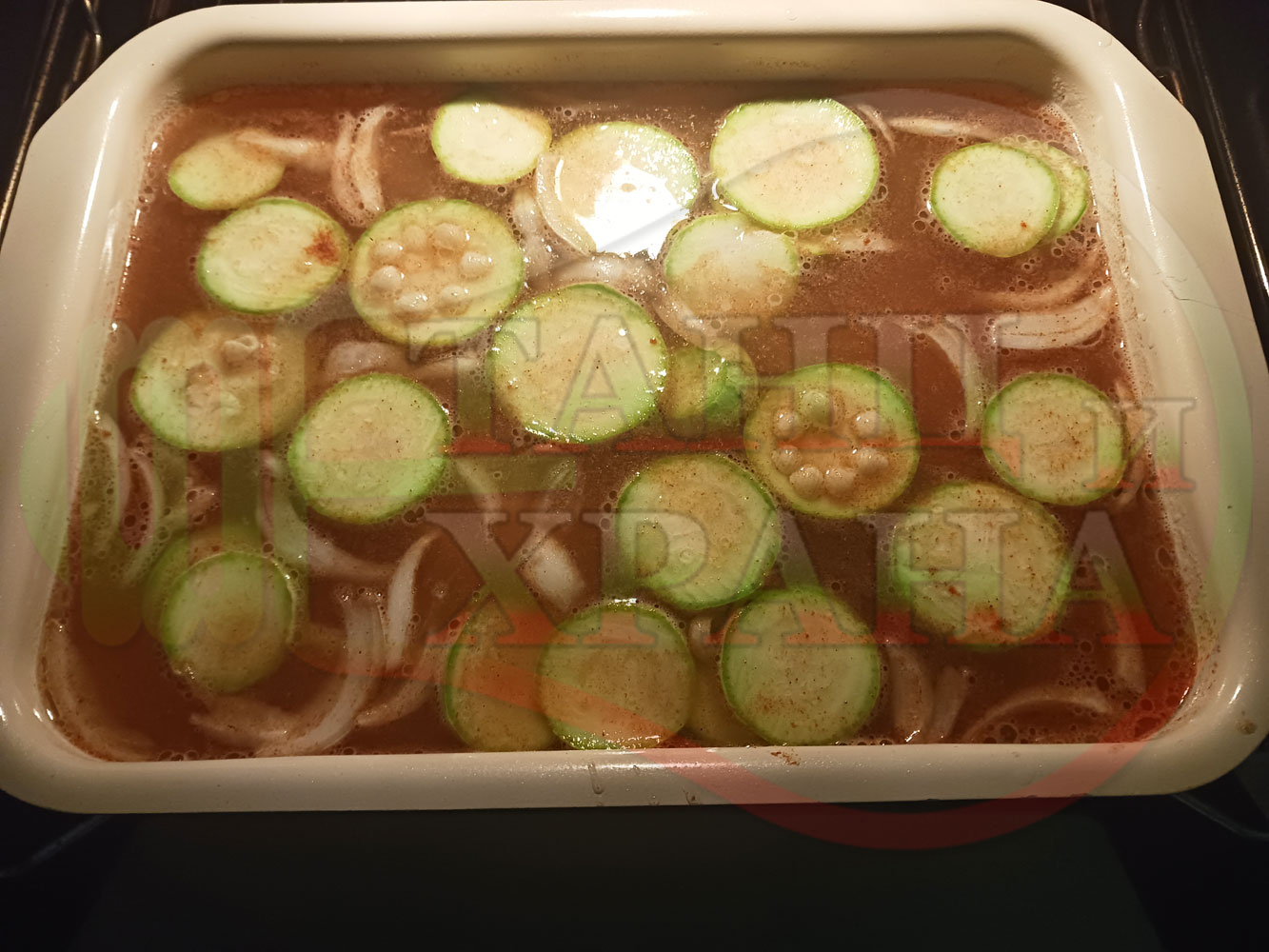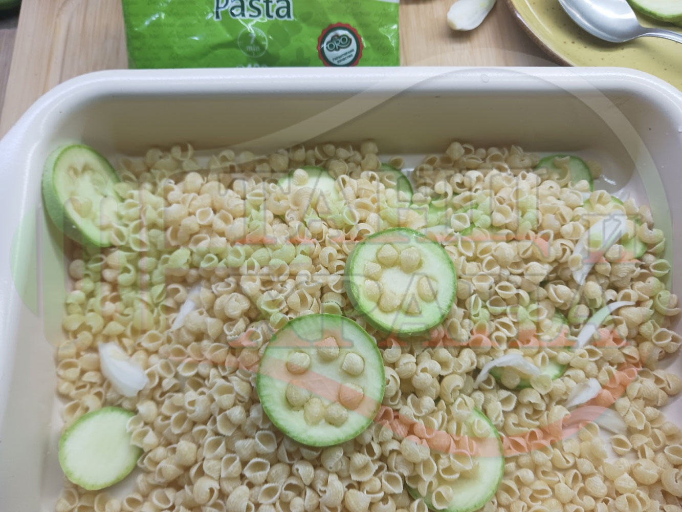 Измийте тиквичката, нарежете я на кръгчета и сипете макароните в тава за печене заедно с обеления, измит и нарязан на едро и с различна форма кромид лук (запазете част от кръгчетата на тиквичката и вътрешната част на лука за украса ("шпиковайте" част от кръгчетата на тиквичката с дребните миди)). Сипете слънчогледовото олио, червения сладък пипер и солта, налейте топла към гореща вода от чешмата,  разбъркайте и поставете тавата в предварително загрятата фурна (загрейте я за поне 5 минути). Сварете и леко запечете на фурна без вентилатор на 180 градуса за около 40 минути.
