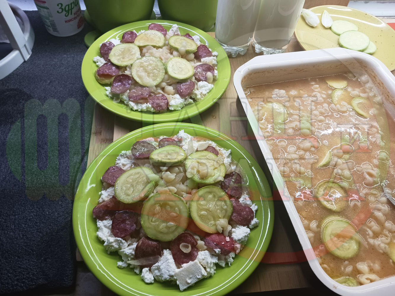 Двукомпонентните ястия, които сътворявам, обикновено съдържат суров и/или сварен и запечен (вариращ) компонент и основен суров и/или сварен и запечен компонент. Хрумна ми да "шпиковам" нарязаната на кръгчета тиквичка с дребните миди (макароните) и се получиха интересни форми при сваряването, но се разпадат при по интензивно разбъркване (зависи от степента на сваряване на тиквичките и мекотата на вътрешната част, която е доста фина). Това е по отношение на формата, в случай че решите да се фокусирате върху формата (на база на тази ми "хрумка" ми "щукнаха" още куп идеи и ще се опитам да ги претворя в някакво ястие или печиво). Макароните се получиха изключително вкусни, носещи сладостта на червения сладък пипер и кромид лука, приятната мекота и сочност на тиквичките и така обичания от нас вкус на българските колбаси (телешка луканка). Суровото гарниране с българското кравето бяло, саламурено сирене дообогатява и насища макароните с млечен вкус... Мммм... отново се получи голяма вкусно, вкусна, вкусотия (вкуснотия). laughing