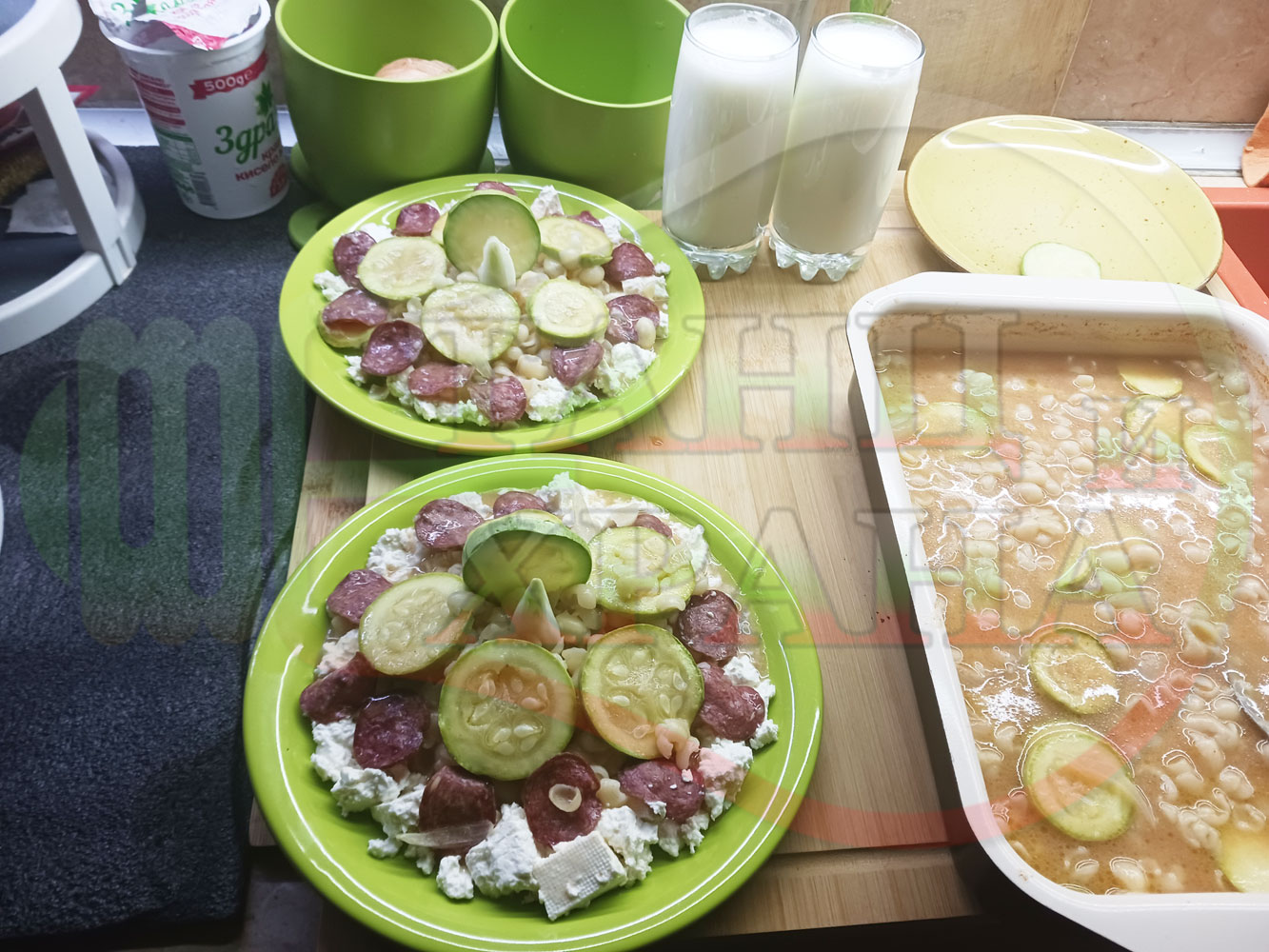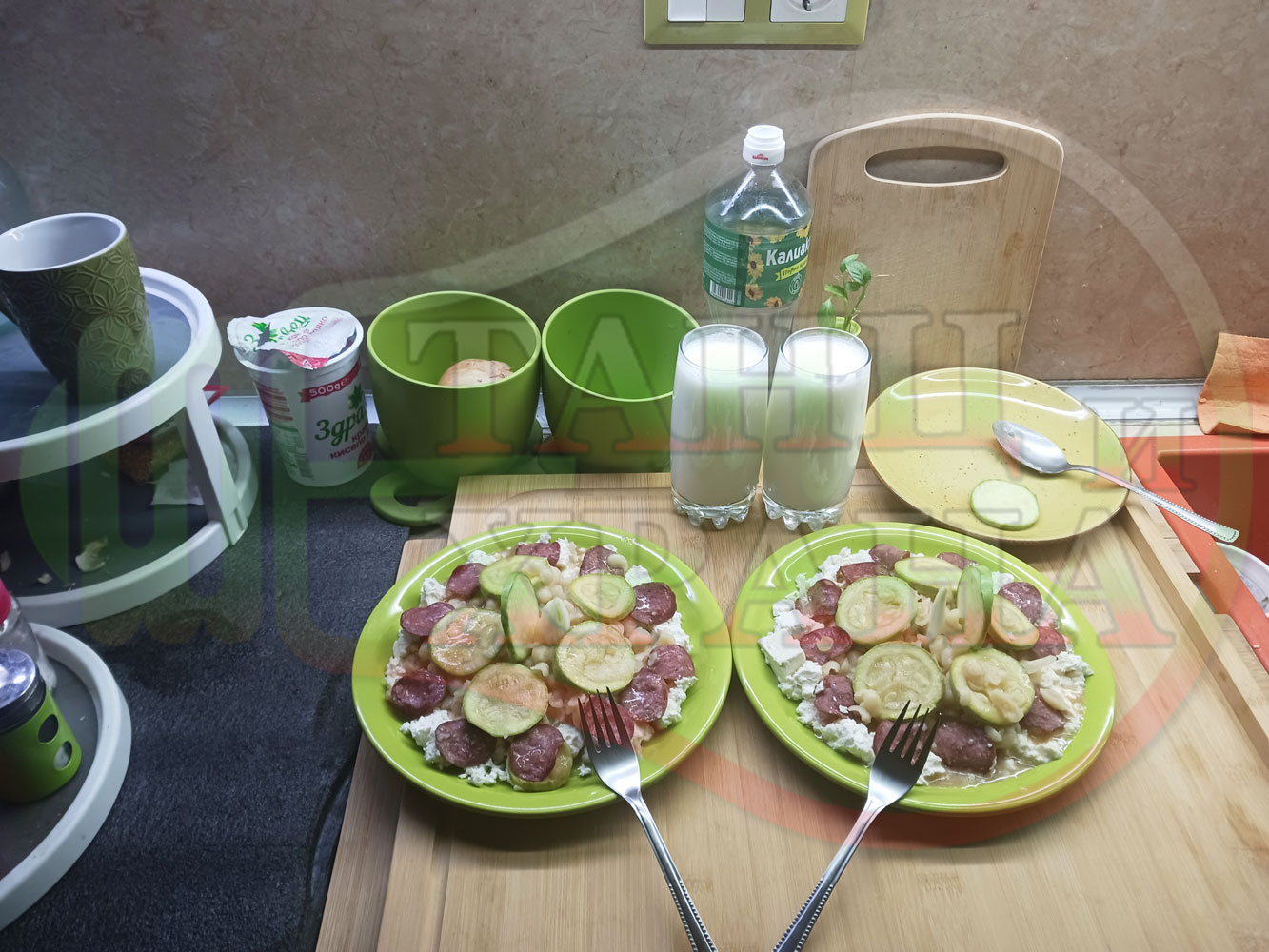 Надробете кравето бяло сирене по диаметъра на чиниите, така че да образува "кладенчета". Сипете в кладенчетата равномерно количество от готовите макарони с тиквички и подредете част от сварената луканка в някаква произволна форма (фигура). Украсете порциите със сурови кръгчета от тиквичката и с вътрешната част на кромид лука (украсете по ваше желание и усмотрение).