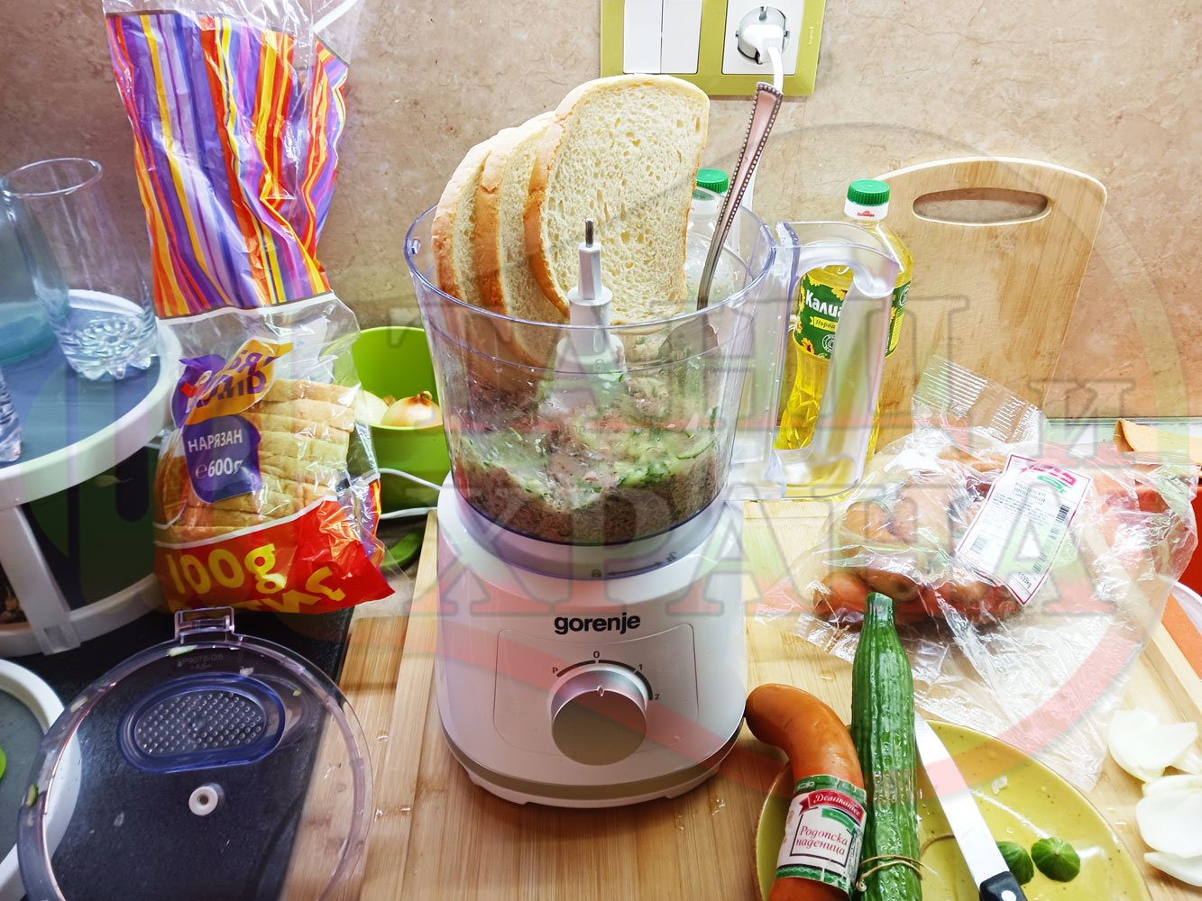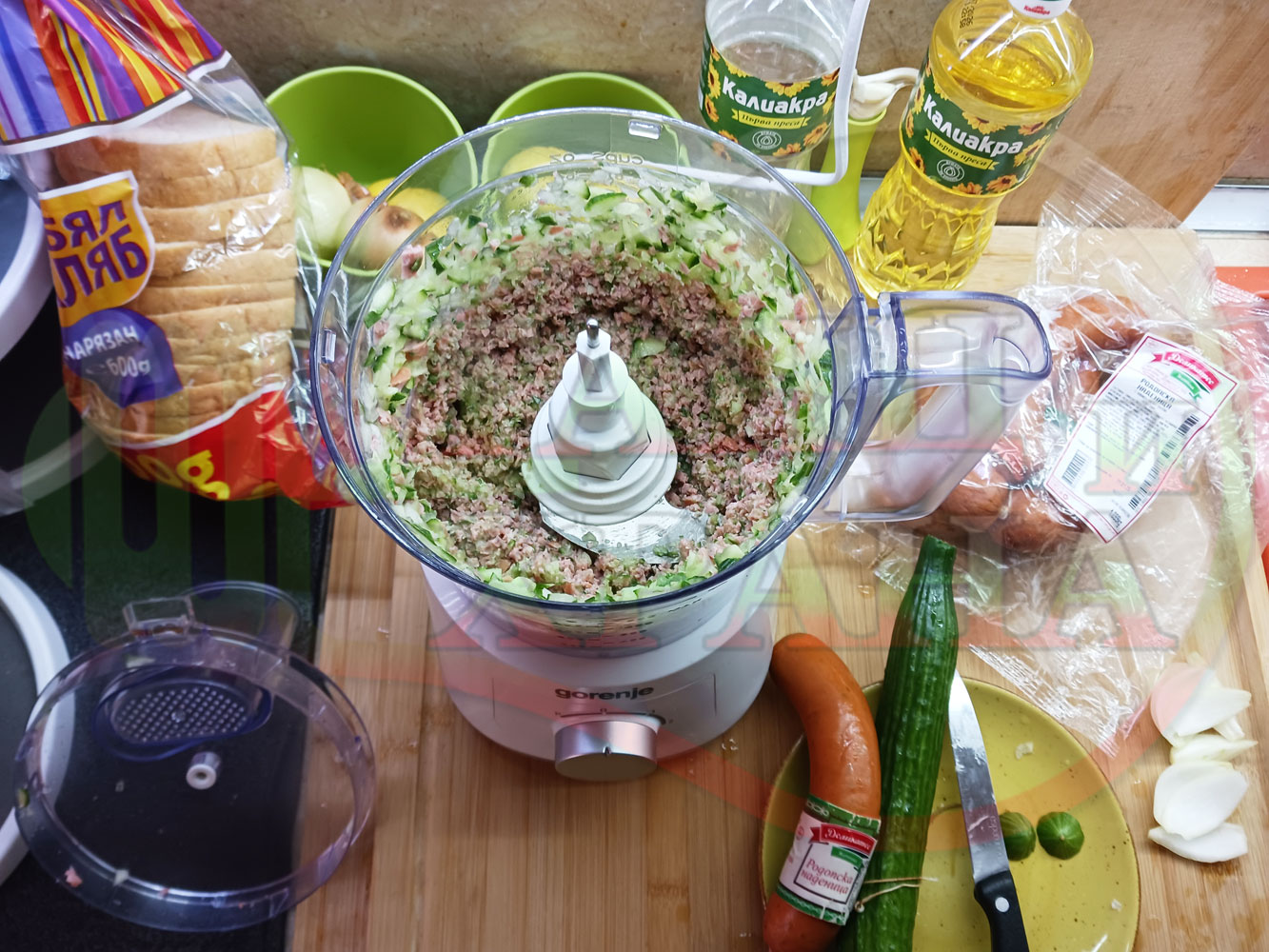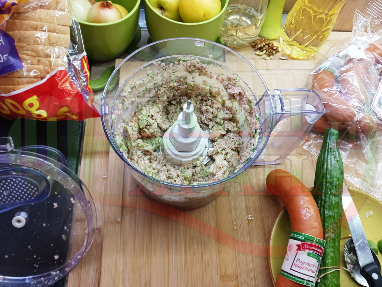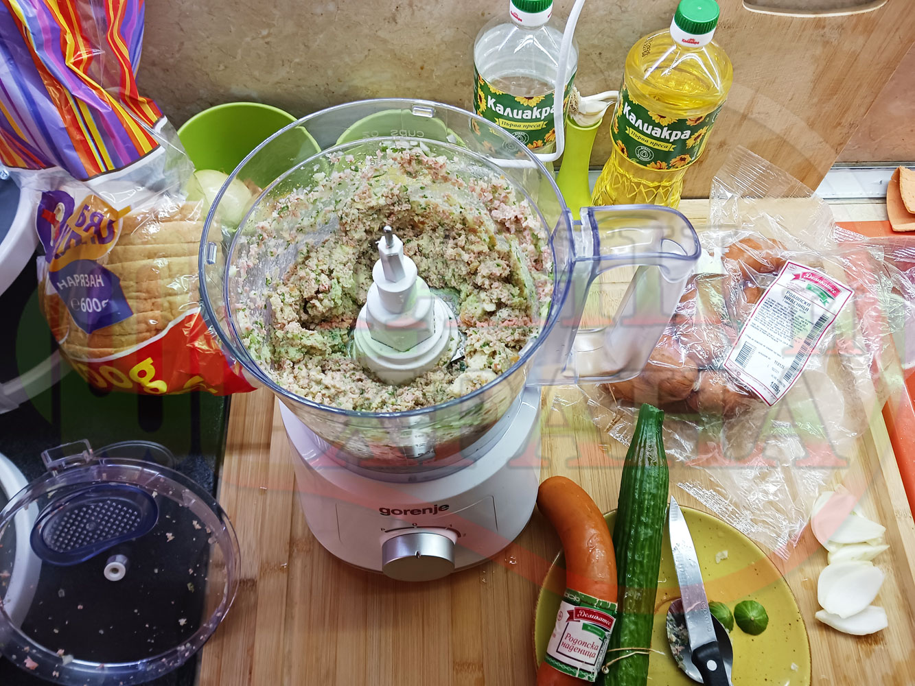 Измийте краставицата, нарежете я на едро без да я белите и я сипете в чопър заедно с измитата, обелена от ципата и нарязана на едро родопска наденица. Обелете, измийте и нарежете кромид лука на едро и го сипете в чопъра (заделете вътрешната част от кромид лука за украса). Разбийте с чопъра продуктите за да прецените степента на консистенцията между продуктите, добавете начупения на едро хляб и отново разбийте с чопъра до образуване на средно гъсто, хомогенизирано тесто с хляб (блат с хляб (преценете количеството на хляба според консистенцията, която зависи от големината и водното съдържание на краставицата, вида на наденицата и големината и вида на филиите хляб)).