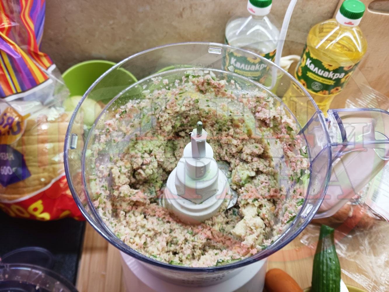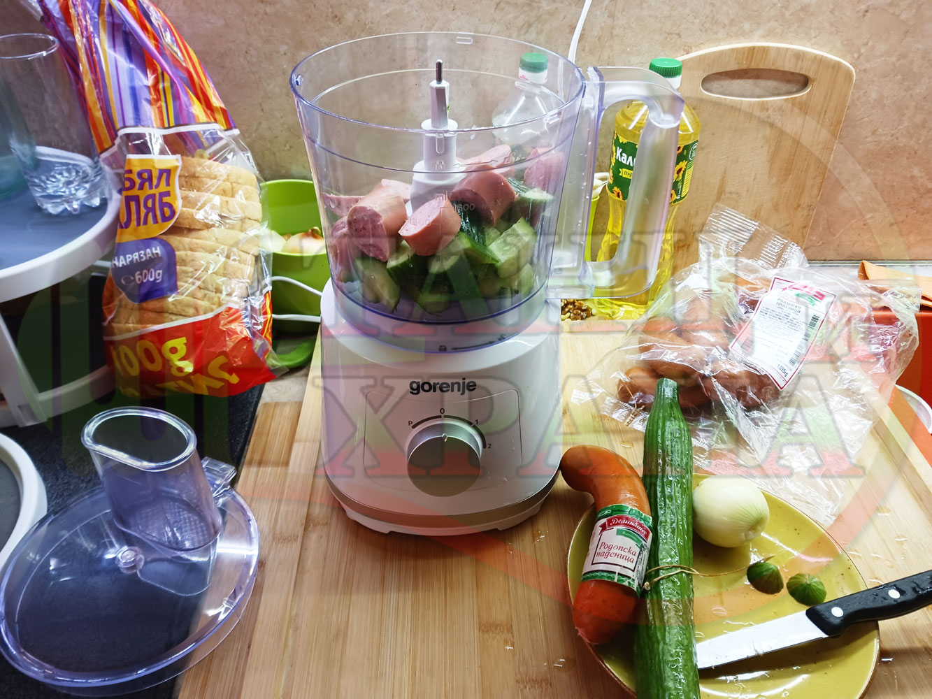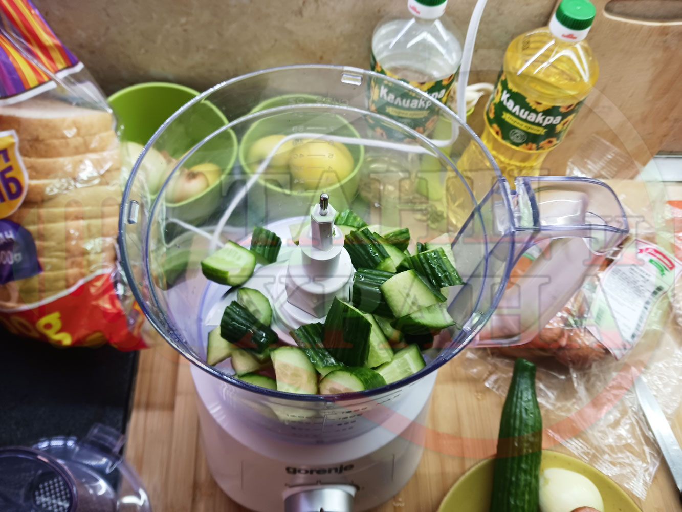 Измийте краставицата, нарежете я на едро без да я белите и я сипете в чопър заедно с измитата, обелена от ципата и нарязана на едро родопска наденица. Обелете, измийте и нарежете кромид лука на едро и го сипете в чопъра (заделете вътрешната част от кромид лука за украса). Разбийте с чопъра продуктите за да прецените степента на консистенцията между продуктите, добавете начупения на едро хляб и отново разбийте с чопъра до образуване на средно гъсто, хомогенизирано тесто с хляб (блат с хляб (преценете количеството на хляба според консистенцията, която зависи от големината и водното съдържание на краставицата, вида на наденицата и големината и вида на филиите хляб)).