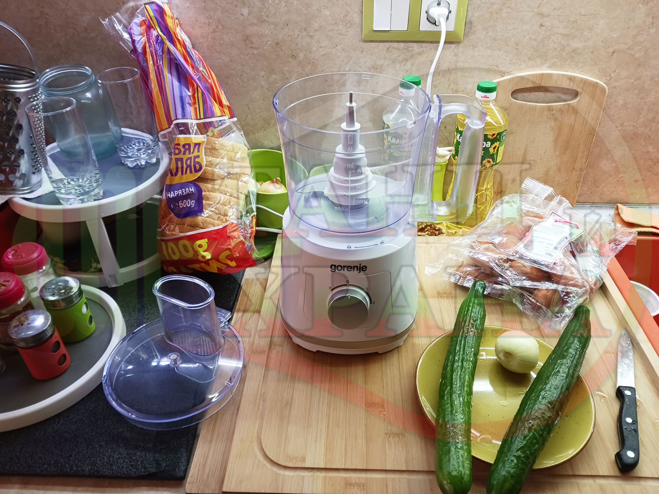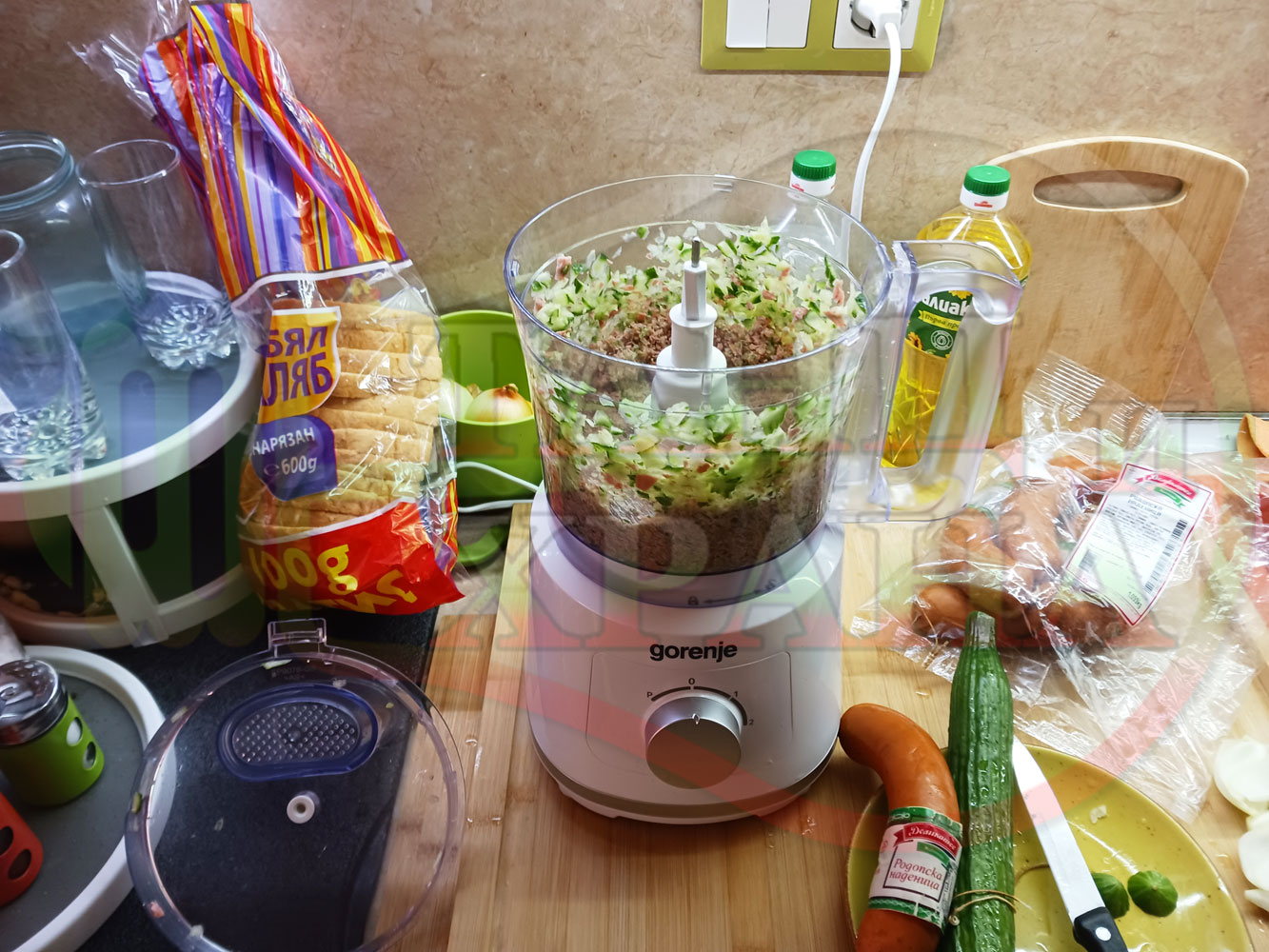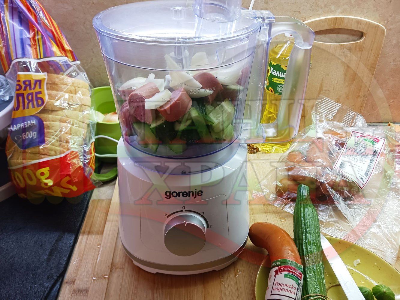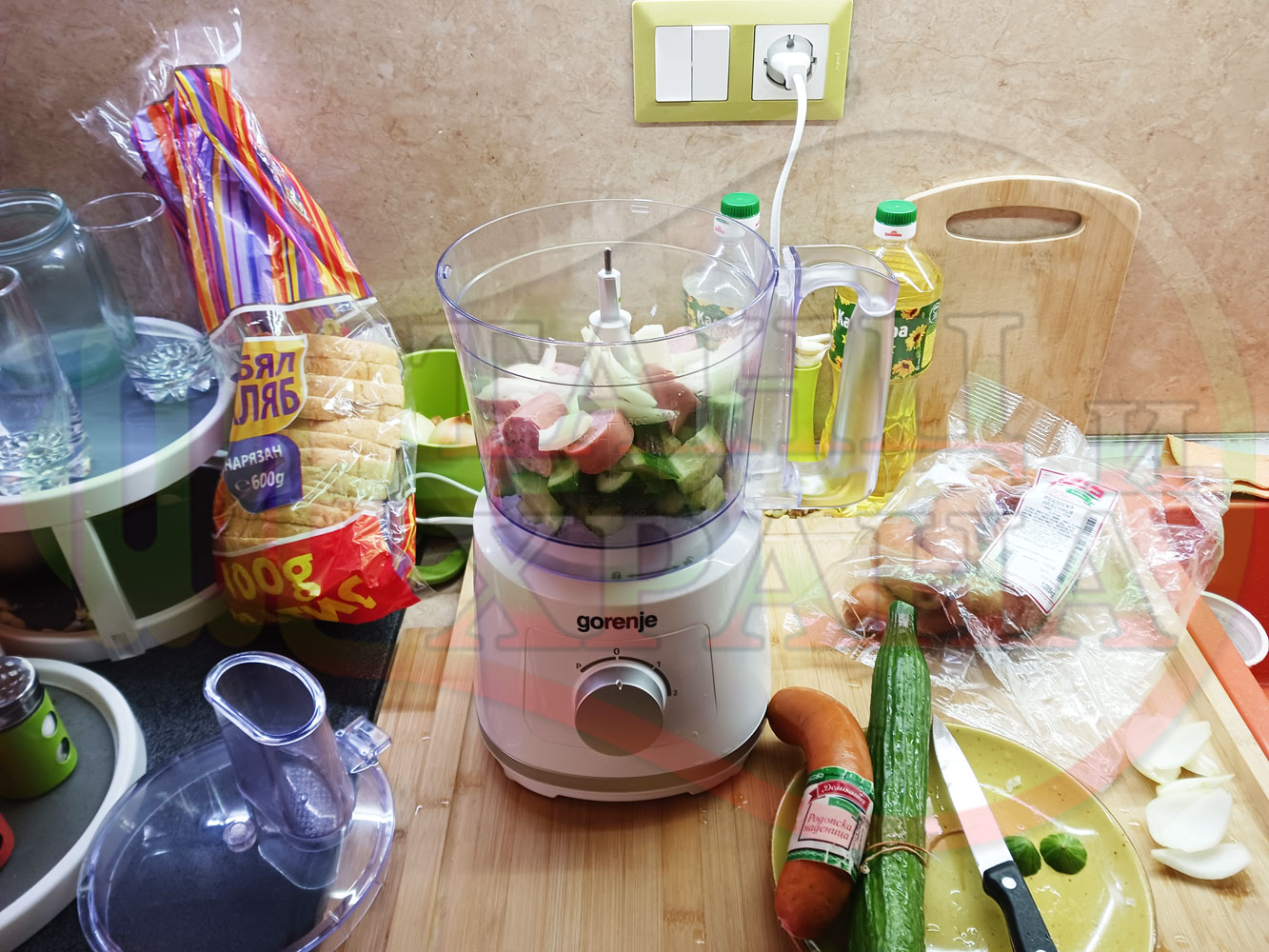 Измийте краставицата, нарежете я на едро без да я белите и я сипете в чопър заедно с измитата, обелена от ципата и нарязана на едро родопска наденица. Обелете, измийте и нарежете кромид лука на едро и го сипете в чопъра (заделете вътрешната част от кромид лука за украса). Разбийте с чопъра продуктите за да прецените степента на консистенцията между продуктите, добавете начупения на едро хляб и отново разбийте с чопъра до образуване на средно гъсто, хомогенизирано тесто с хляб (блат с хляб (преценете количеството на хляба според консистенцията, която зависи от големината и водното съдържание на краставицата, вида на наденицата и големината и вида на филиите хляб)).
