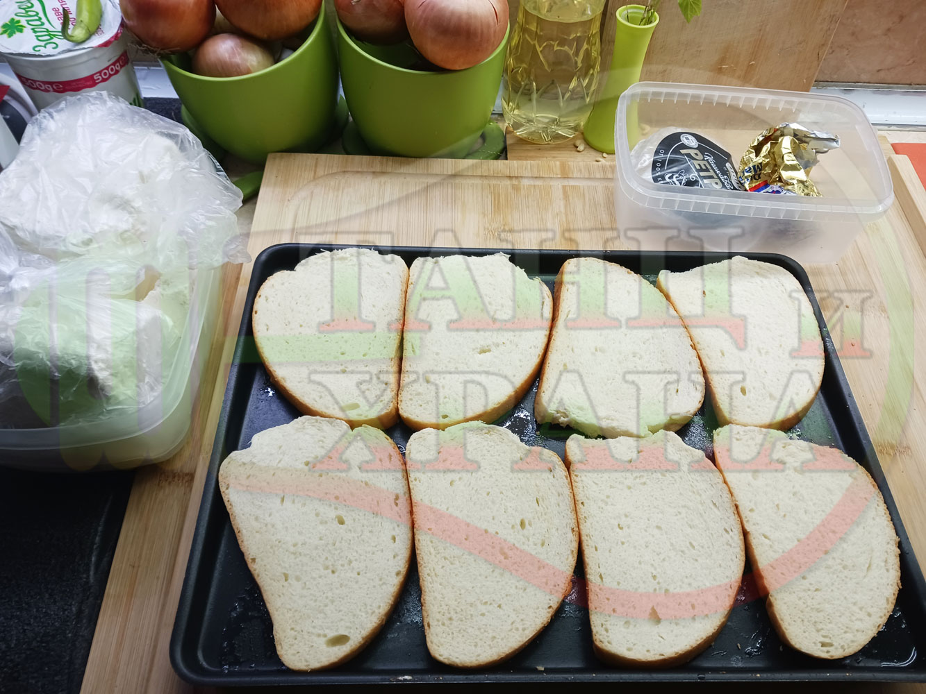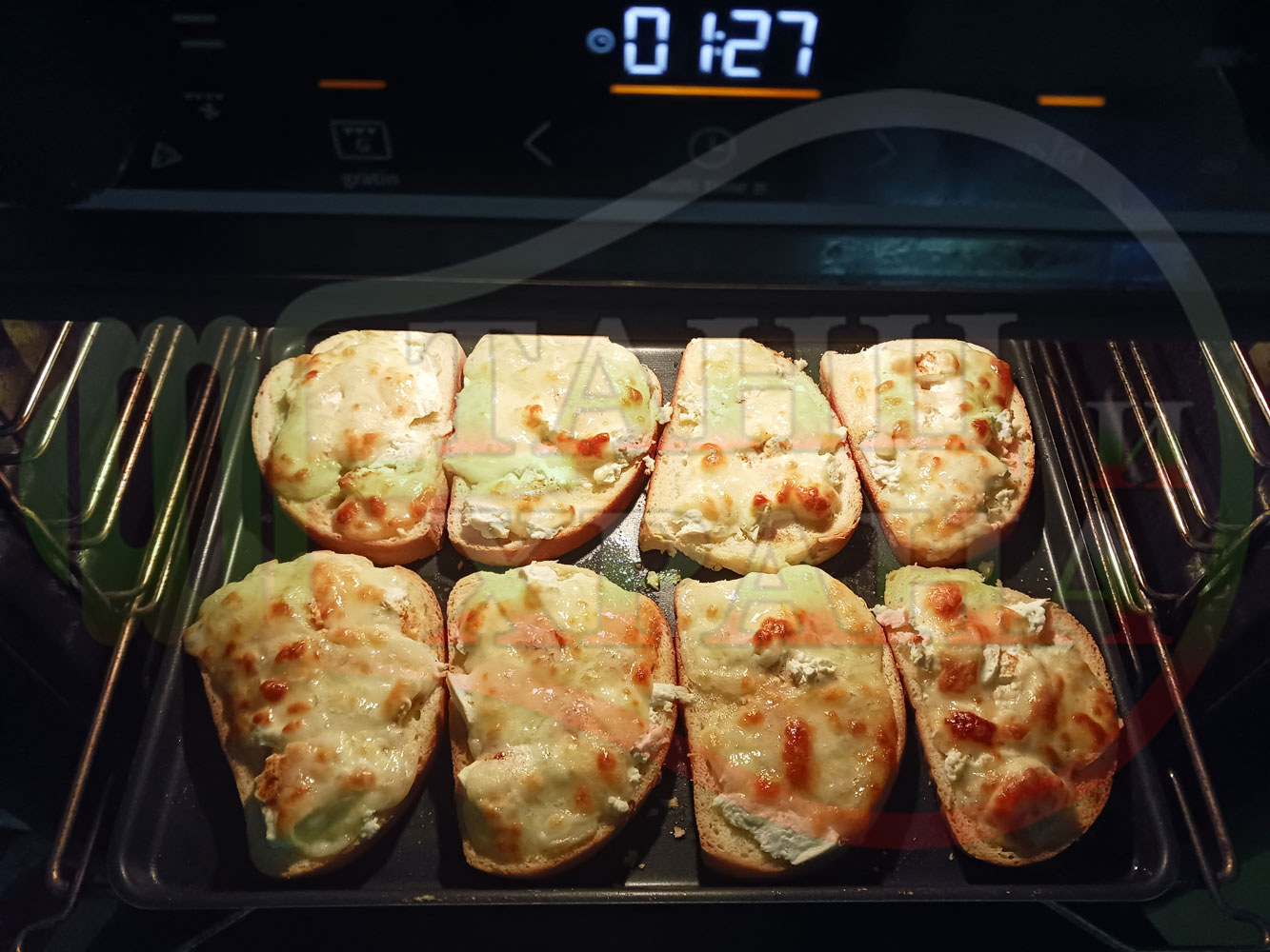 Поставете тавата с подредените филийки в предварително загрятата фурна (загрейте я за поне 5 минути. Запечете на фурна без вентилатор на 180 градуса за около 20 минути.