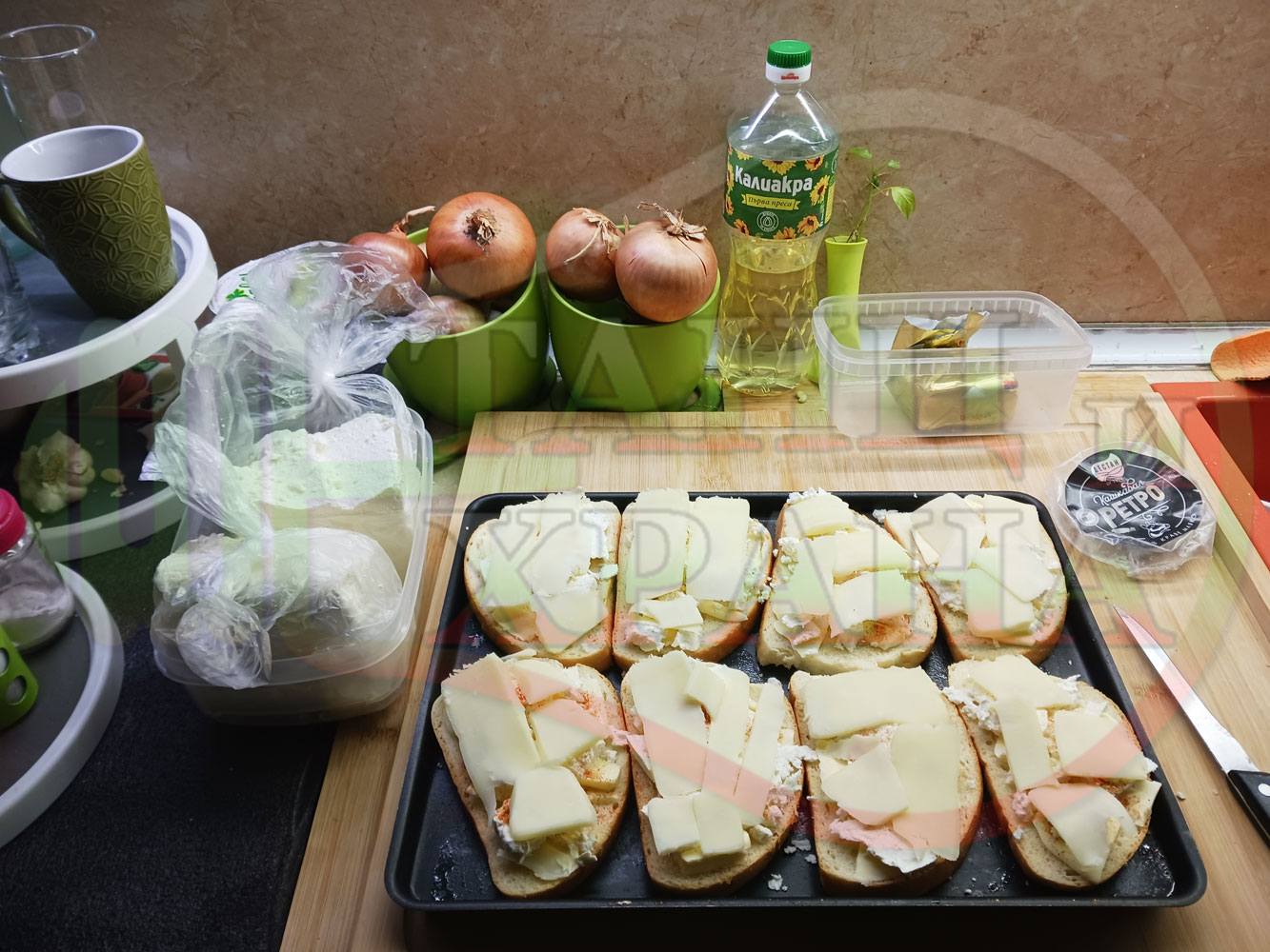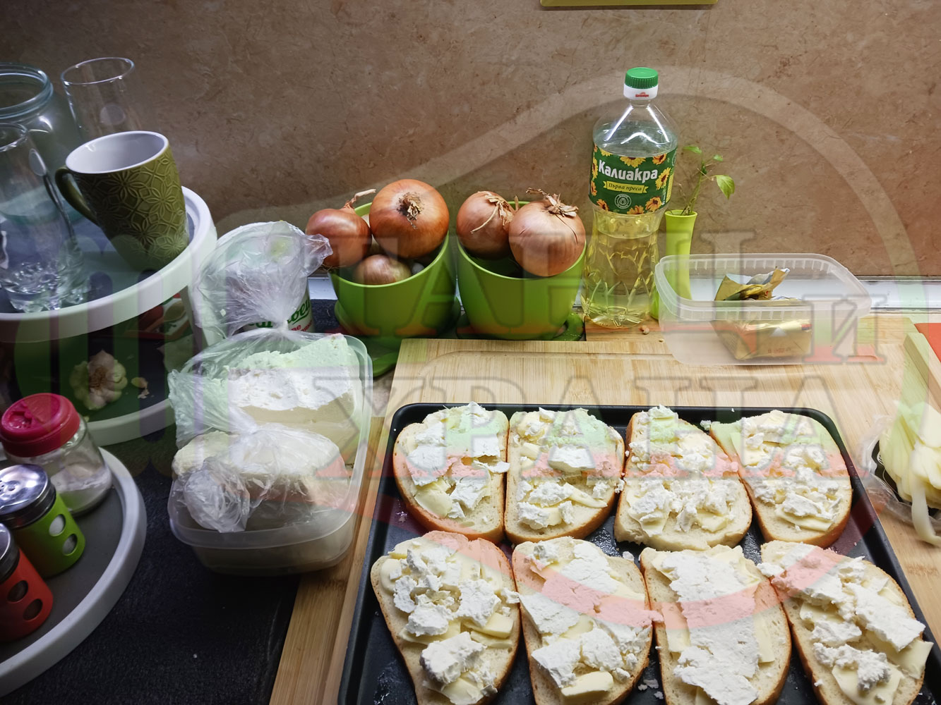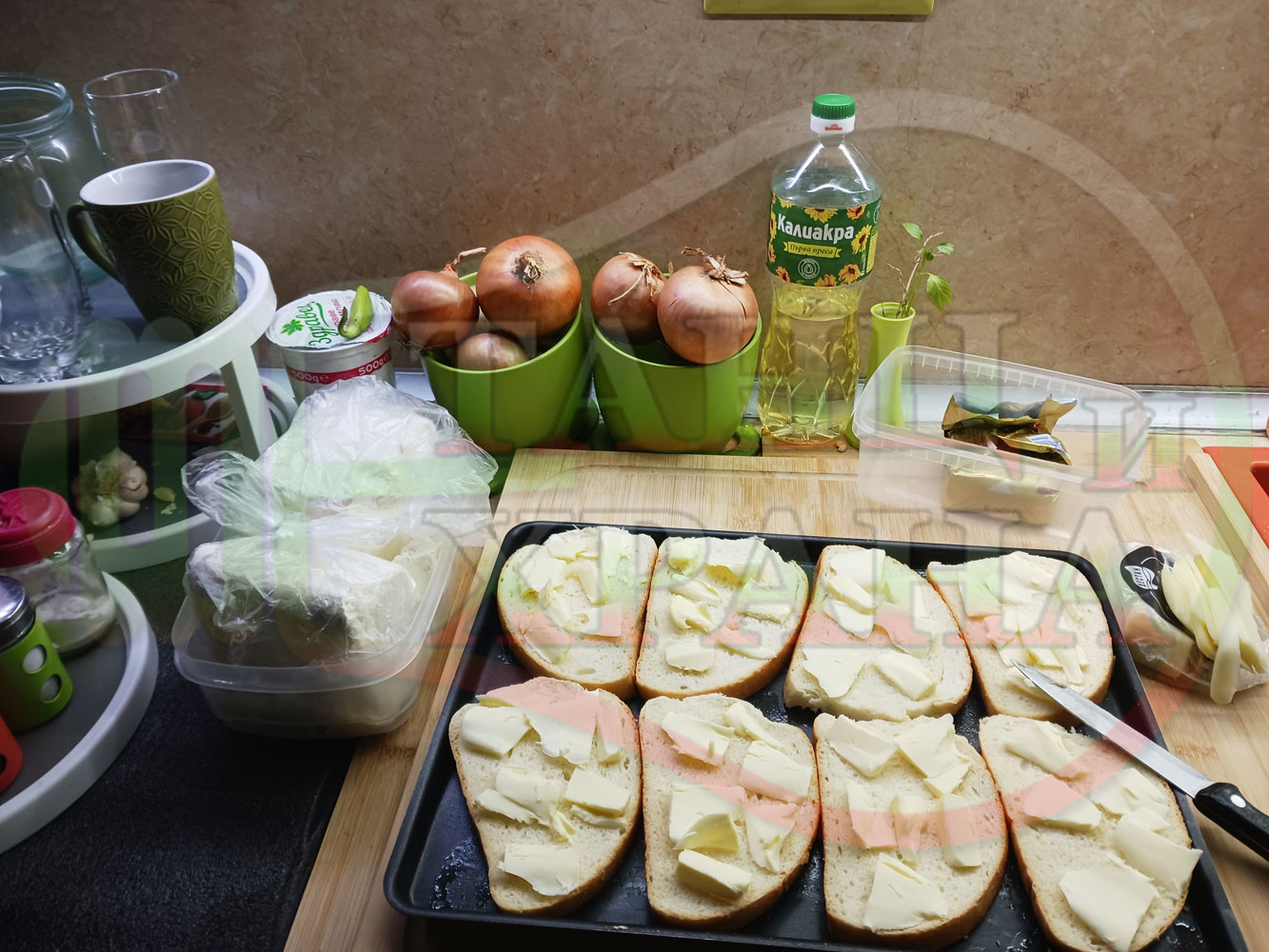 Сипете слънчогледовото олио в тънка тава за печене и го размажете равномерно по тавата чрез накланяне или с четка. Подредете филийките хляб в тавата, намажете ги с масло и разпределете равномерно количество от нарязаното краве бяло сирене на различни по големина парченца (пълното размазване на маслото по филийките не е строго задължително). Поръсете червен сладък пипер върху сиренето и добавете равномерно количество от нарязания кашкавал върху всяка филийка.