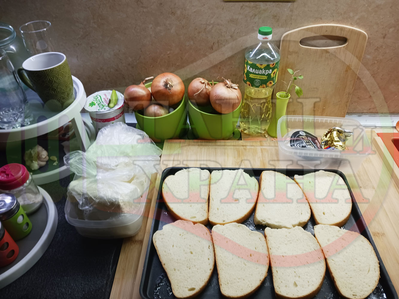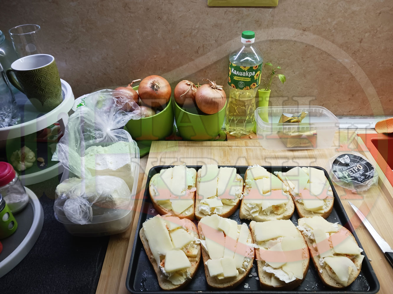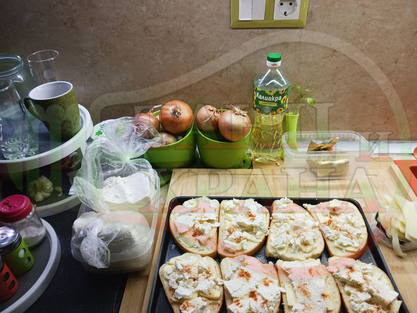 Сипете слънчогледовото олио в тънка тава за печене и го размажете равномерно по тавата чрез накланяне или с четка. Подредете филийките хляб в тавата, намажете ги с масло и разпределете равномерно количество от нарязаното краве бяло сирене на различни по големина парченца (пълното размазване на маслото по филийките не е строго задължително). Поръсете червен сладък пипер върху сиренето и добавете равномерно количество от нарязания кашкавал върху всяка филийка.