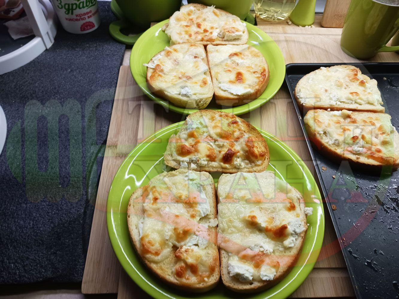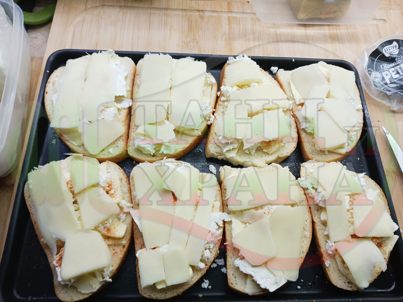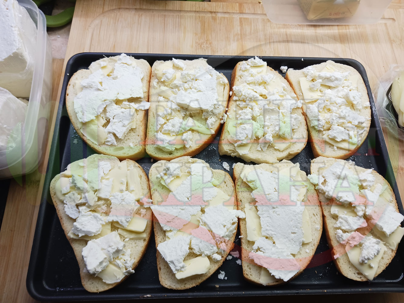 Български филийки "Кашкавалени червеносладкопиперени с БГсирене" запечени на фурна с краве масло, краве бяло сирене (българско, саламурено), червен сладък пипер и млечен кашкавал