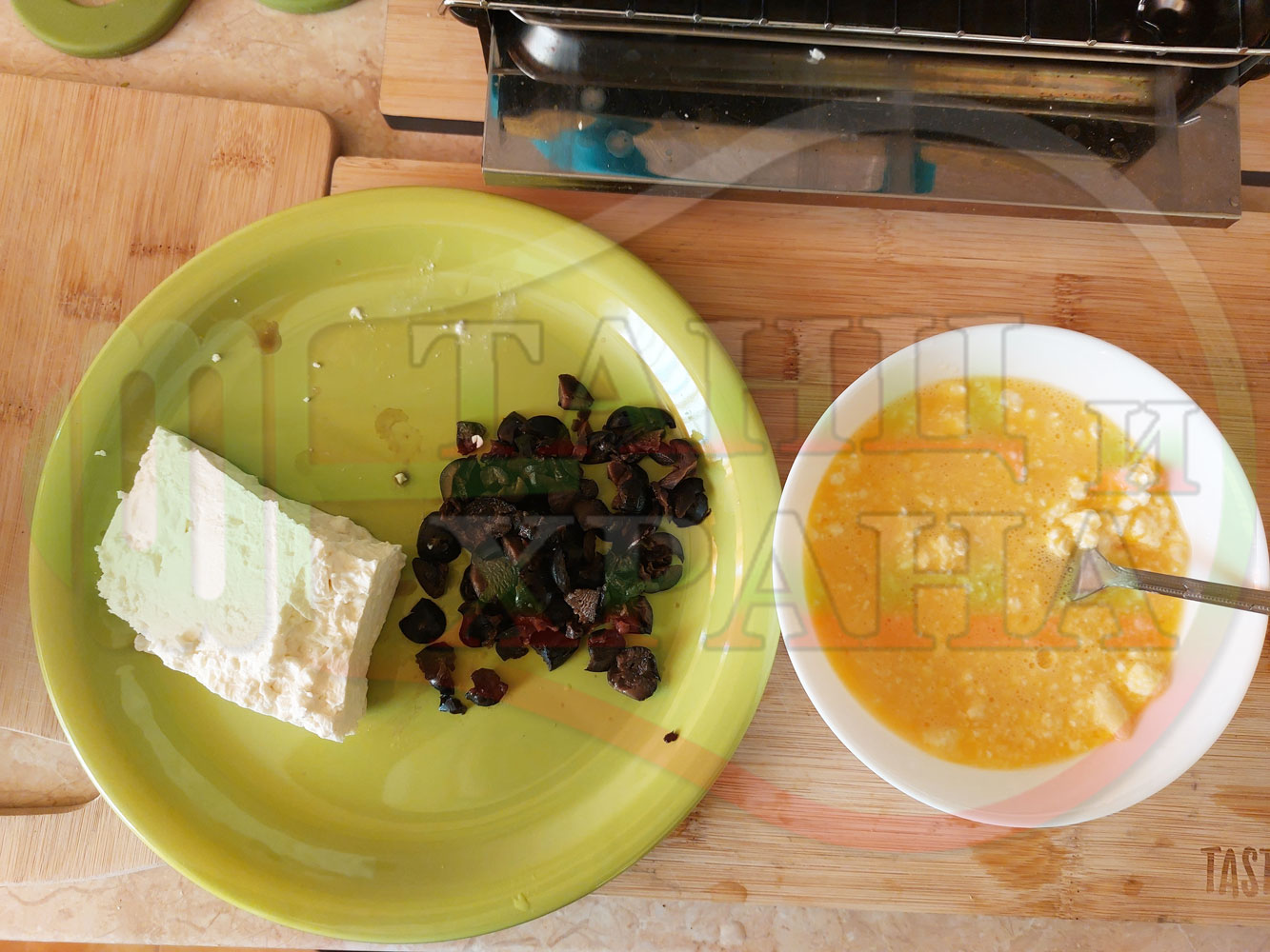 ПРОДУКТИ: Приблизителни количества за български филийки "Маслиновочерни с БГсирене" намазани с краве масло, запечени на мини скара с яйчено сиренова плънка приготвена от яйца, черни маслини и краве бяло сирене (българско, саламурено)