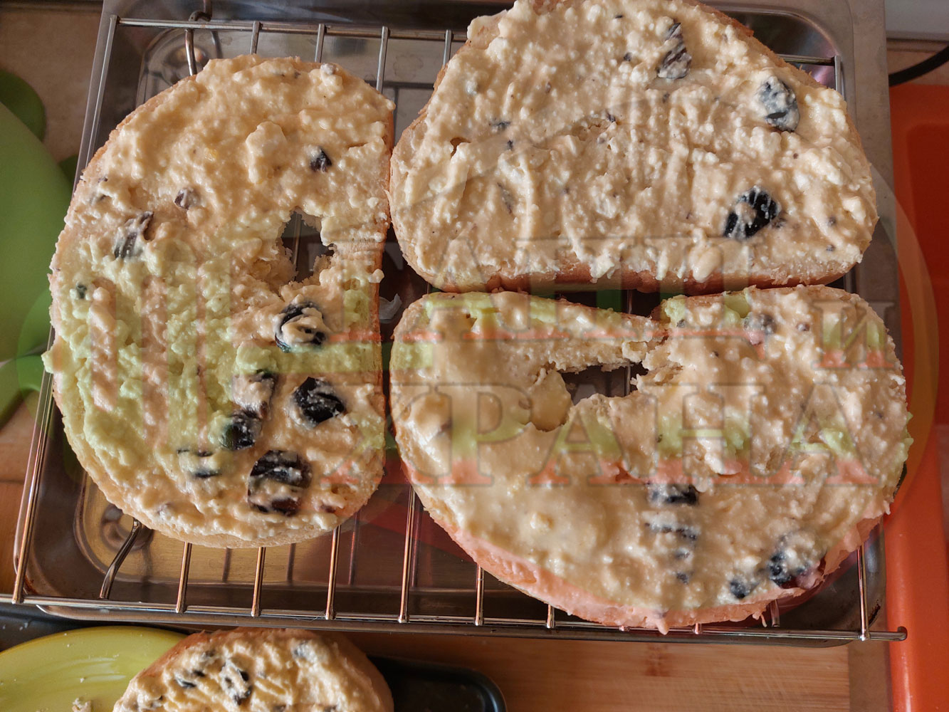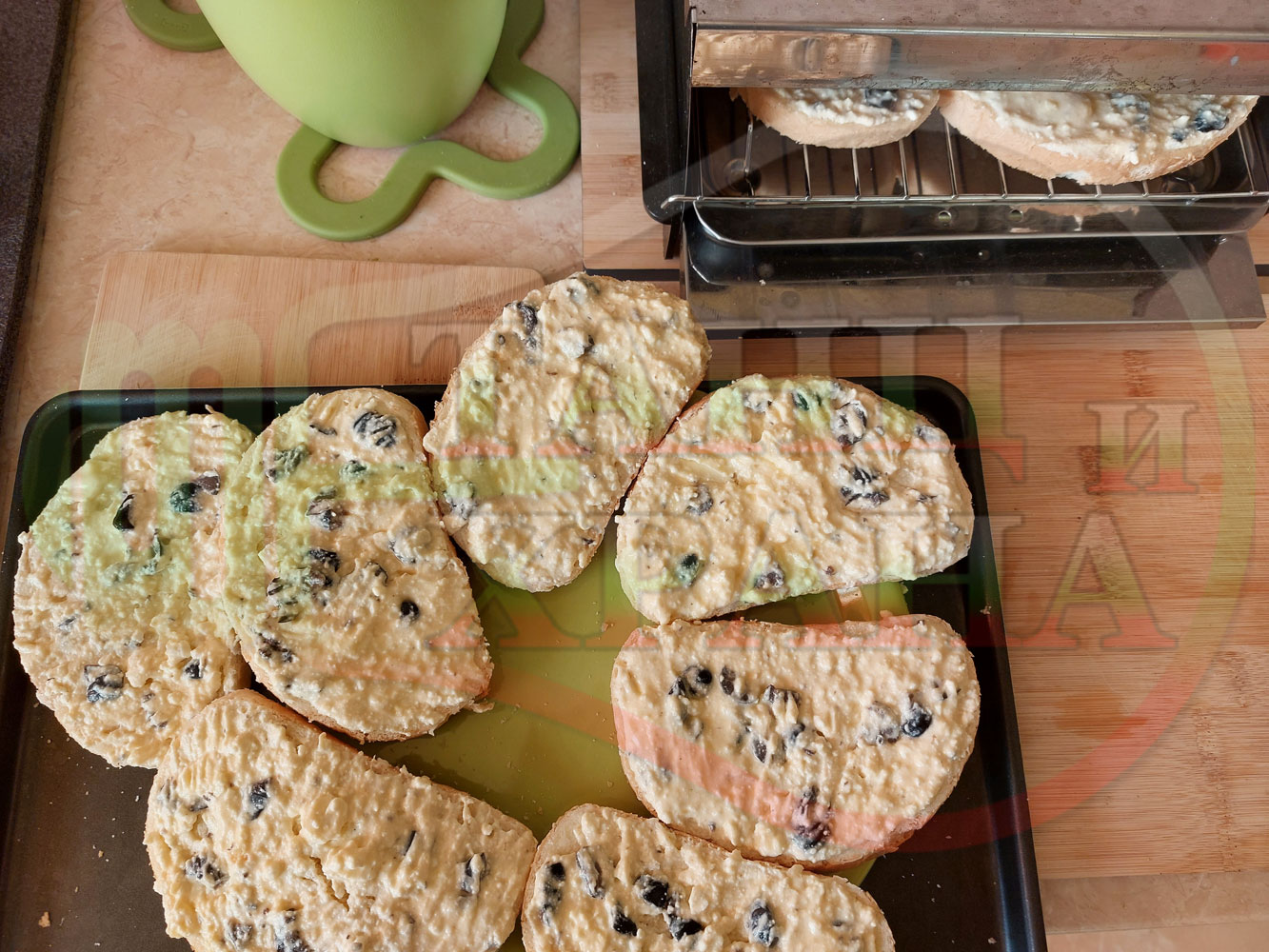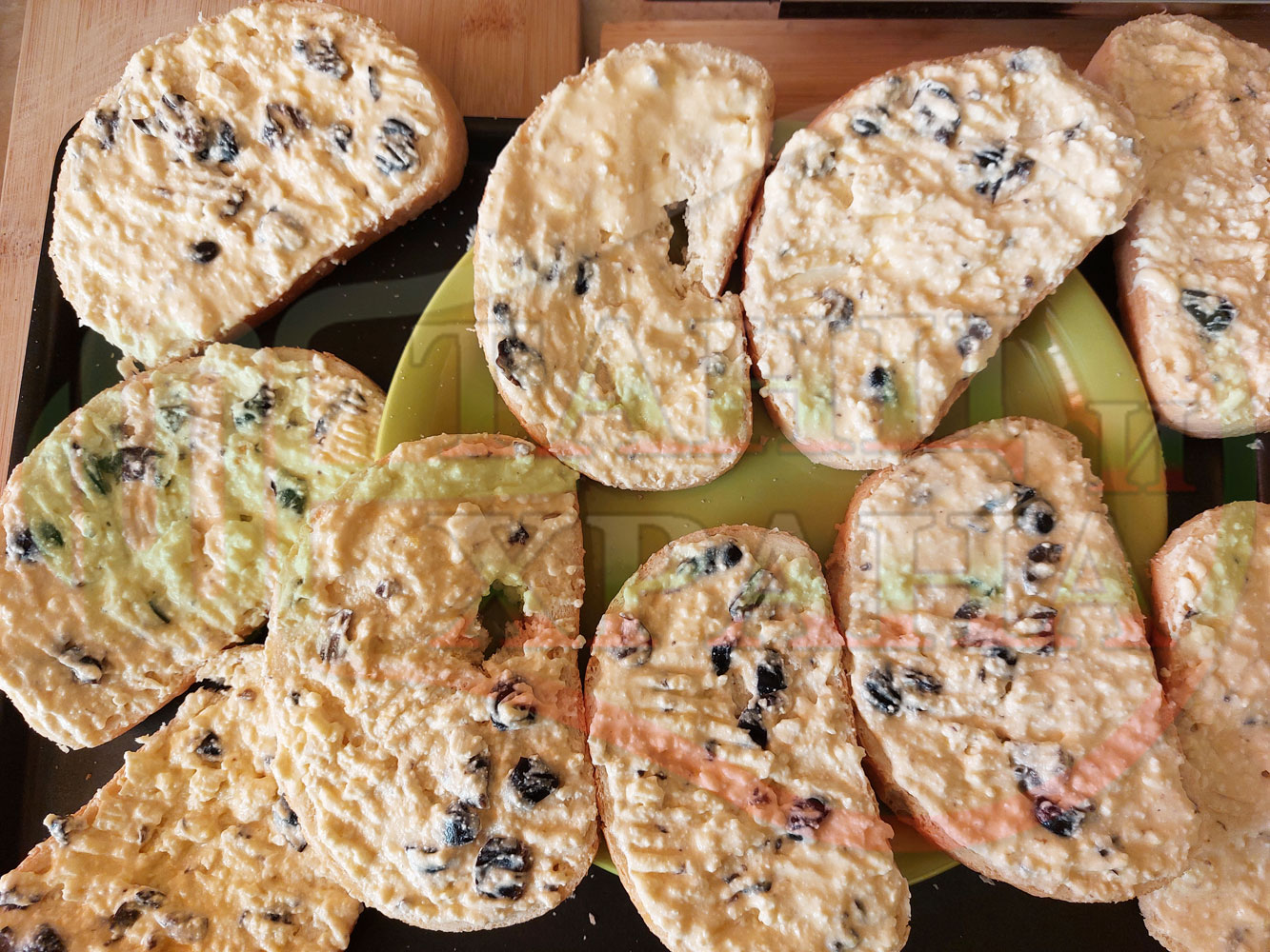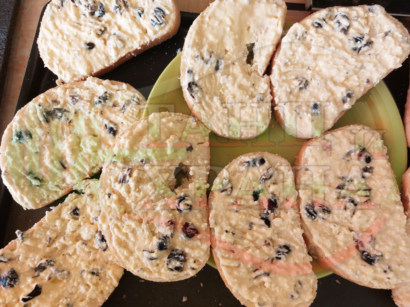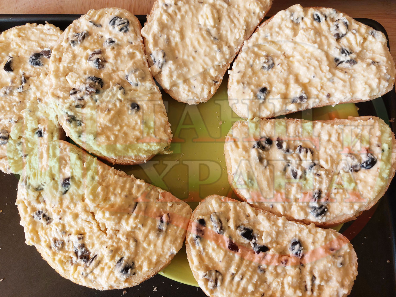 Български филийки "Маслиновочерни с БГсирене" намазани с краве масло, запечени на мини скара с яйчено сиренова плънка приготвена от яйца, черни маслини и краве бяло сирене (българско, саламурено)