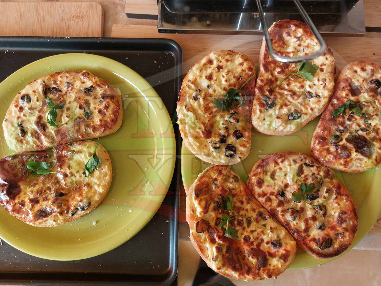 С повече масло филиите стават по-вкусни, сочни и ароматни. Преценявайте гъстотата на яйчено сиреновата плънка за да не станат филийките прекалено сухи и доста солени (зависи от големината на яйцата, солеността на българското краве бяло сирене и черните маслини).