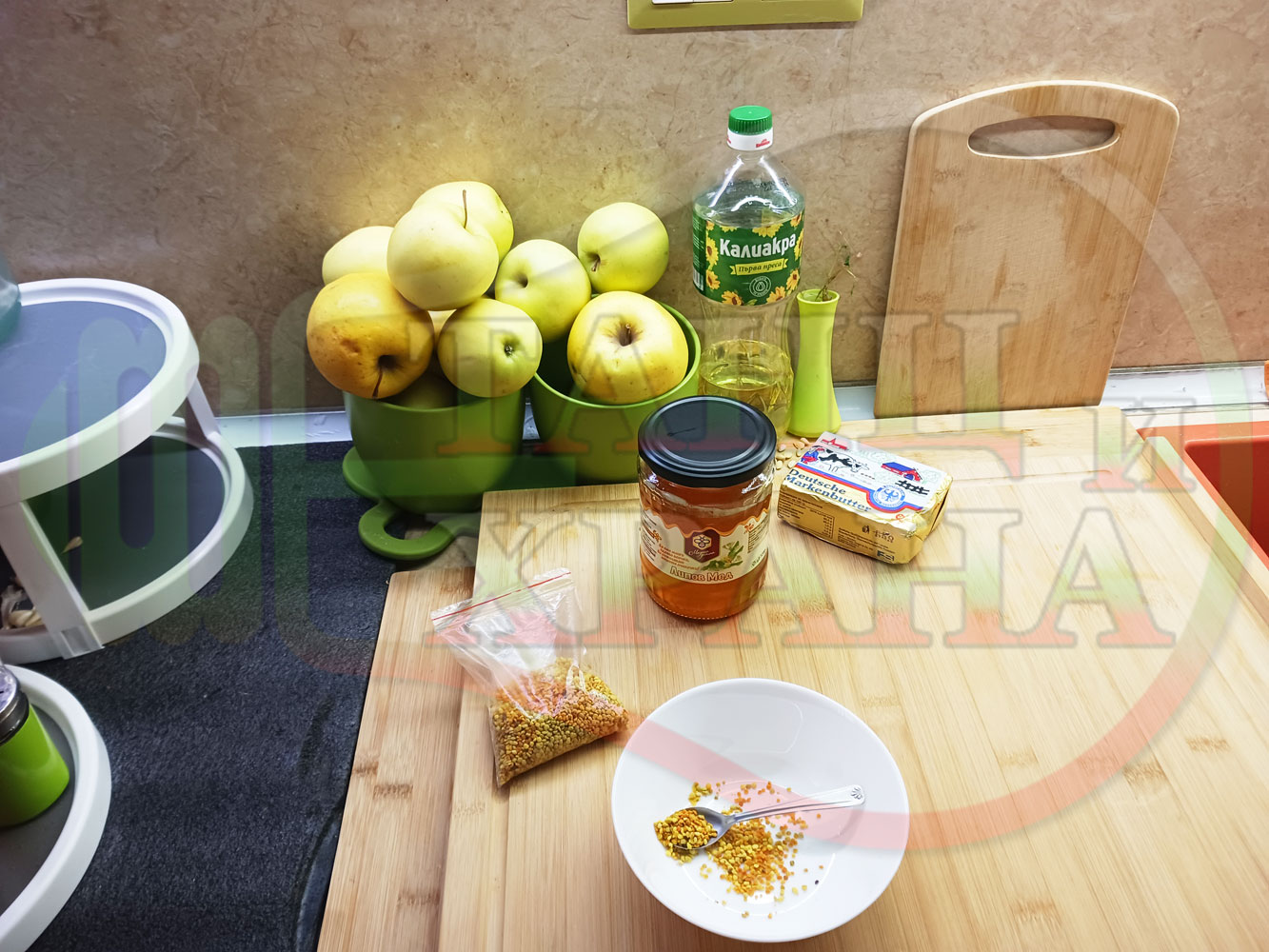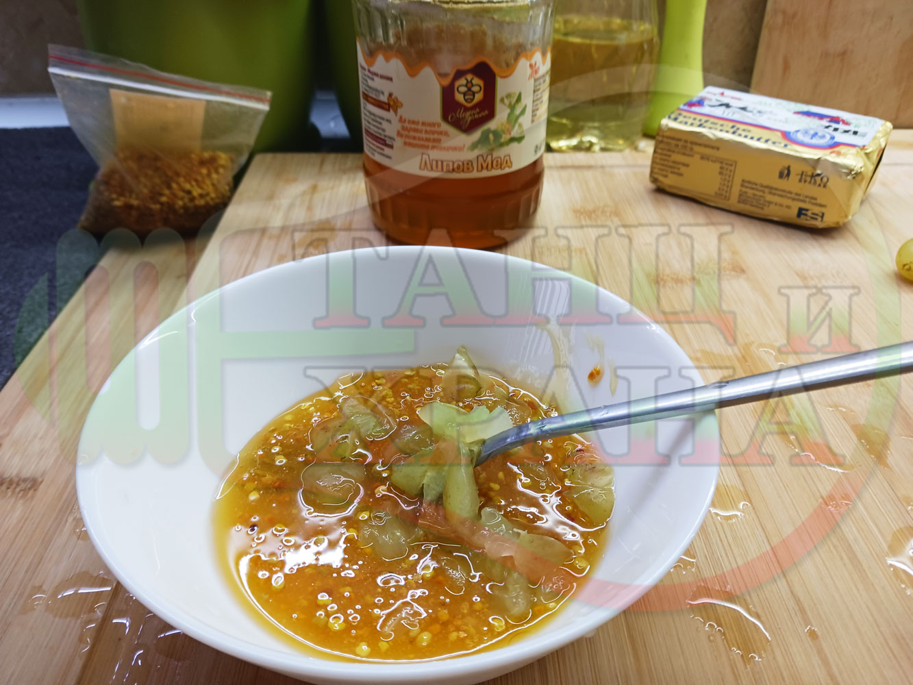 От момента, в който сътворих български млечен десерт с боровинки, пчелен прашец и кисело мляко от България за нас (мен и семейството ми), млечният десерт се превърна в най-българския еликсир на живота. Сега отново сътворих изключително полезен пчелен на базата на пчелния прашец, разтворен в липов ароматен мед и грозвод сок с гроздовата пулпа. Разтварянето на пчелния прашец в меда е доста трудно и така ми хрумна да добавя почистени от семките гроздови зърна, които разтварят меда и прашеца в някаква степен, макар и да остават цели гранулки от прашеца (смятам да сътворявам производни еликсири до намиране на точната рецепта за пълното разтваряне на прашеца (целите гранулки в този еликсир са приятни при хапване в меда и гроздовия сок)).