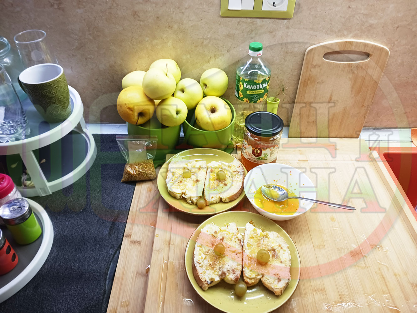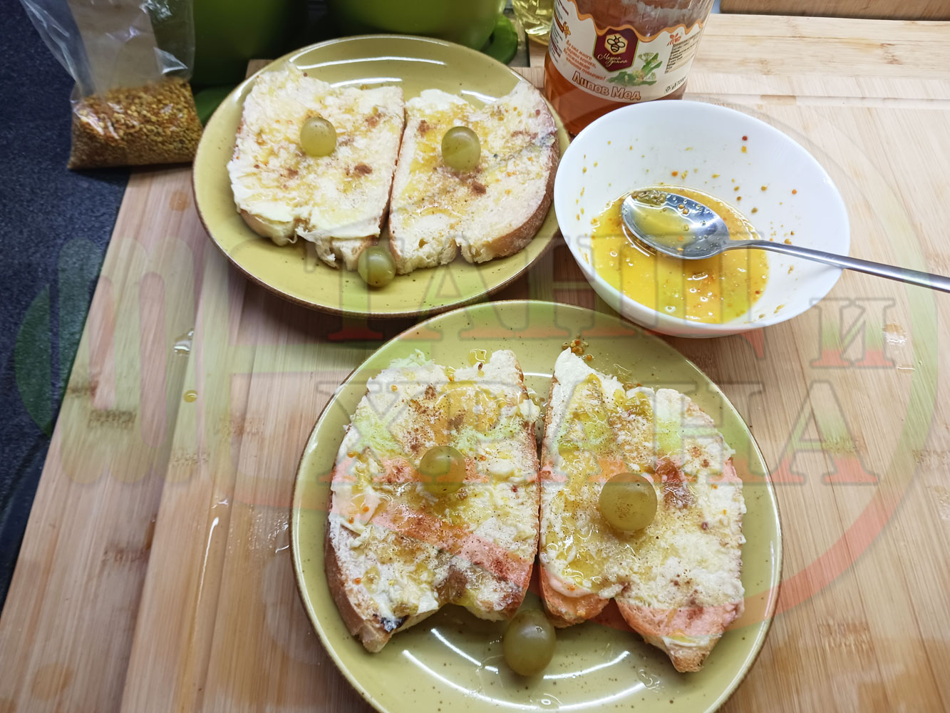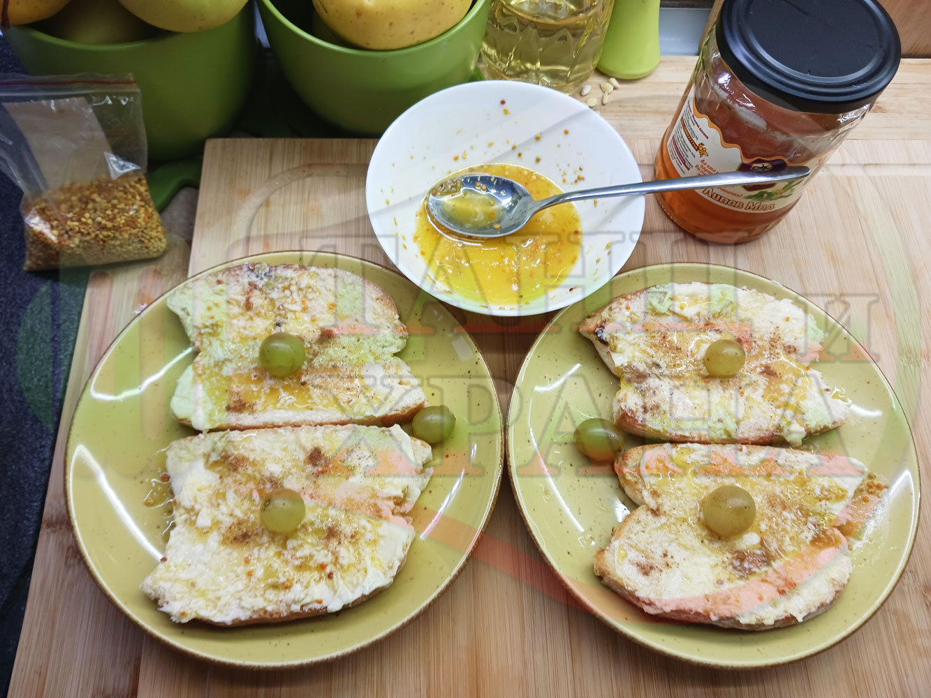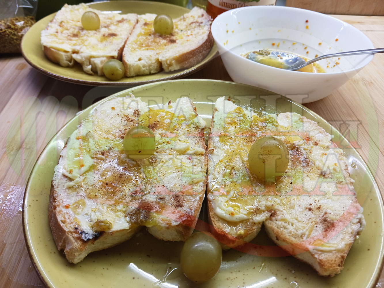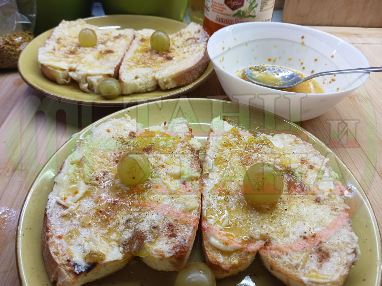 Сладки филийки "Гроздовомедни пчелноцветни" запечени на тостер намазани с масло и гроздов медено пчелен крем приготвен от прясно грозде, липов мед и пчелен цветен прашец поръсени с канела и гарнирани с гроздови зърна