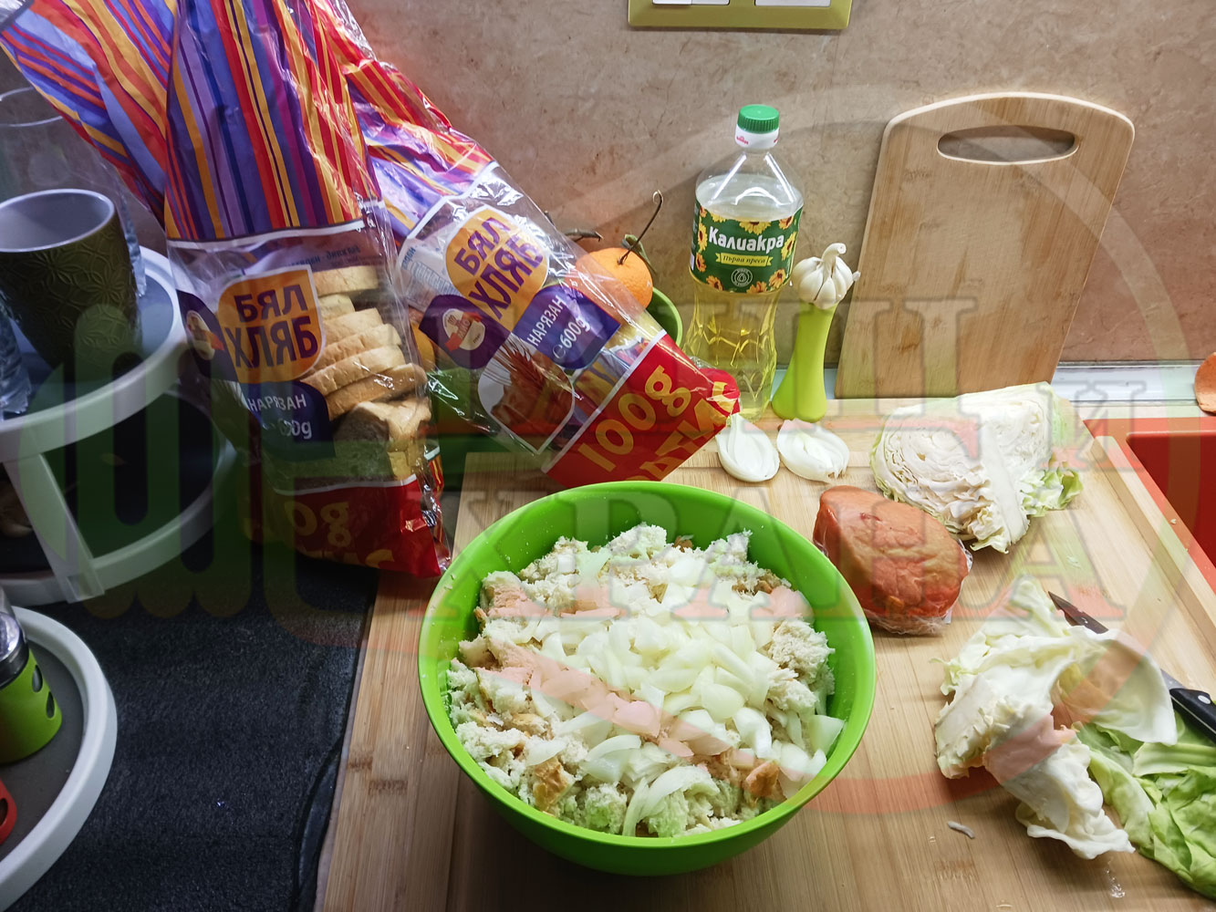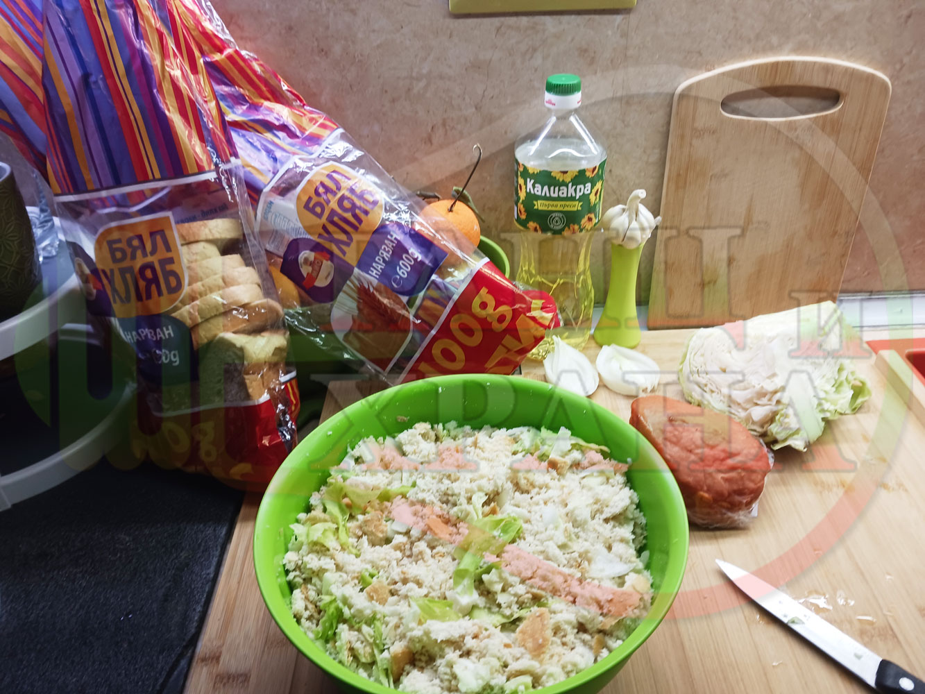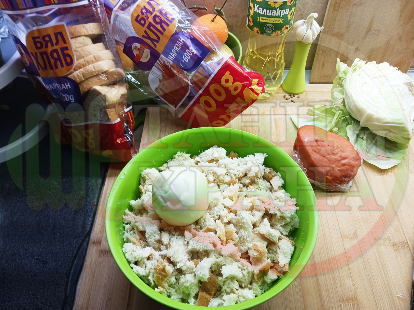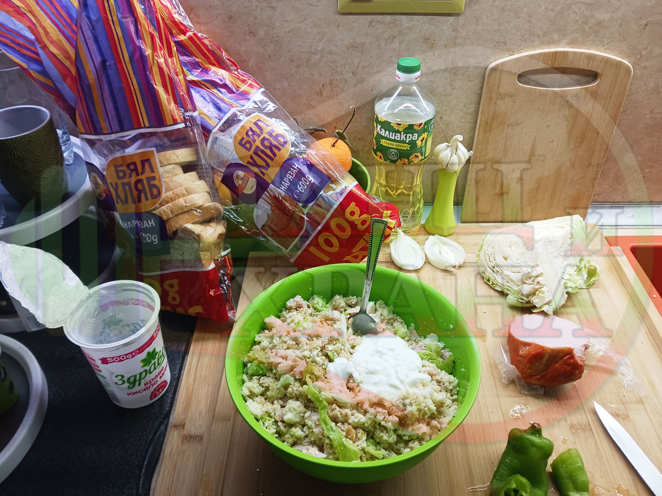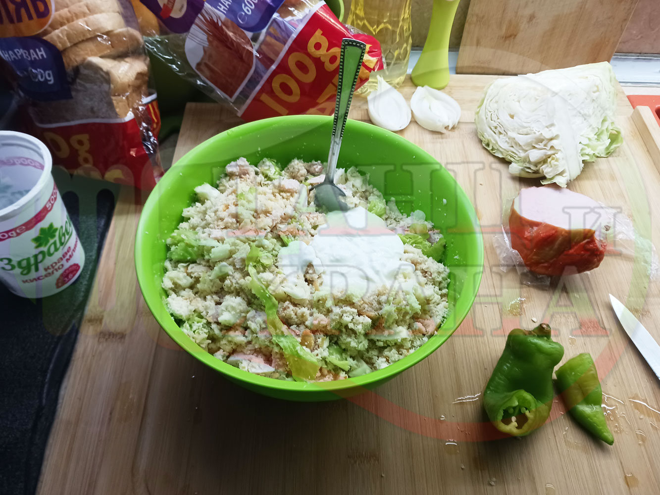Надробете хляба в купа и добавете обеления, измит и нарязан на едро кромид лук заедно с измитото и нарязано на едро прясно зеле (заделете по-хубави вътрешни листенца от зелето и от сърцевината на кромид лука за украса). Размесете с ръка продуктите за да се овкусят, пуснат част от соковете си и се слегнат в някаква степен. Добавете обеленото от ядливата кафеникава кора и нарязано на малки парченца жарено филе заедно с обеления и нарязан на едро чесън (запазете кората от филето за друг вид ястия или бульони). Измийте чушката, почистете я от семките, нарежете я на малки парченца и я сипете в купата заедно с българското кисело мляко и слънчогледовото олио. Отново размесете с ръка и продължете да разбърквате и намачквате продуктите с вилица до получаване на сравнително гъсто, хомогенизирано хлебно тесто.