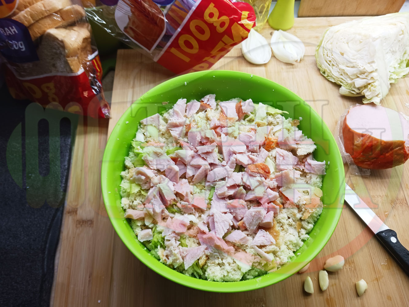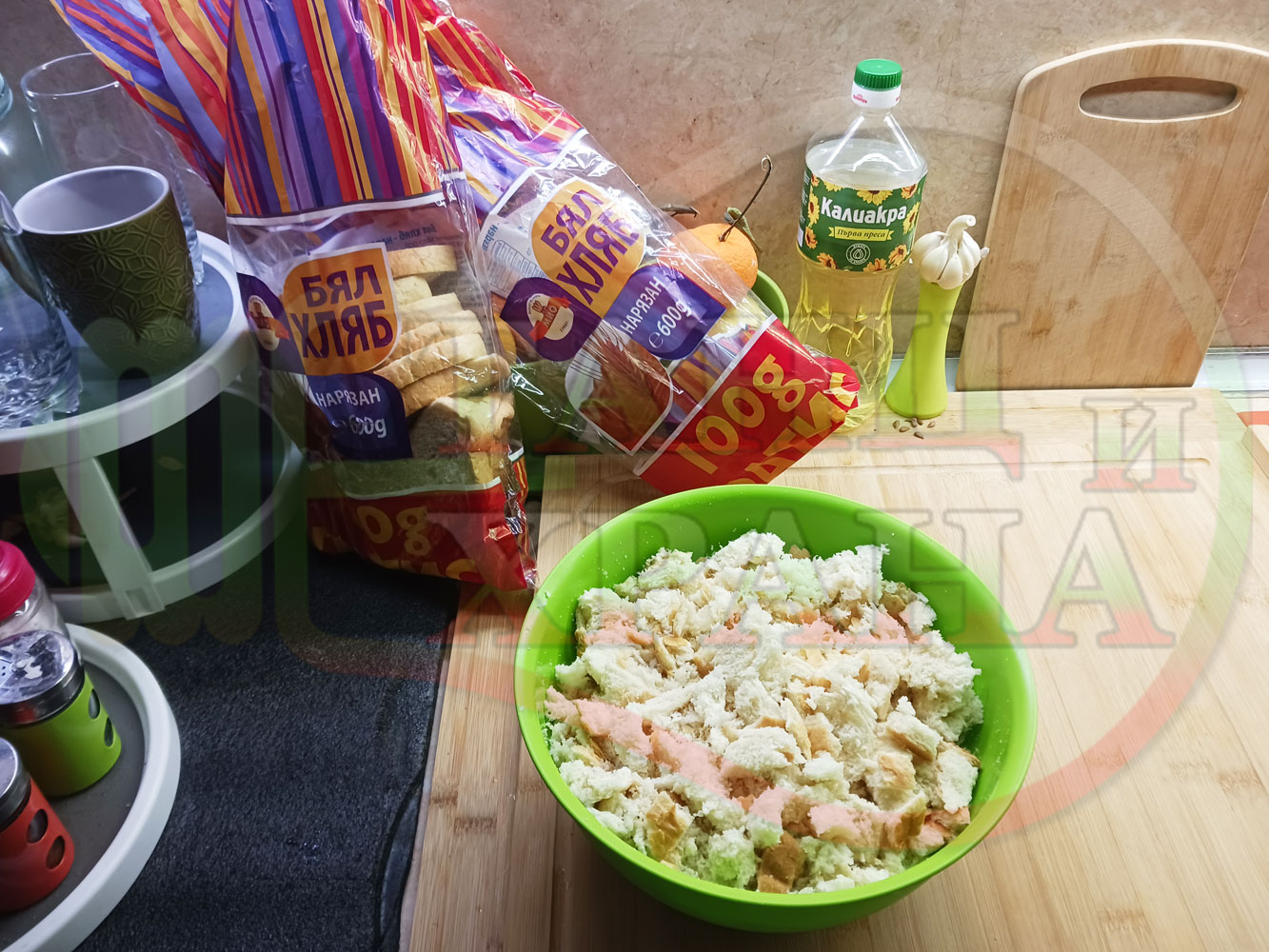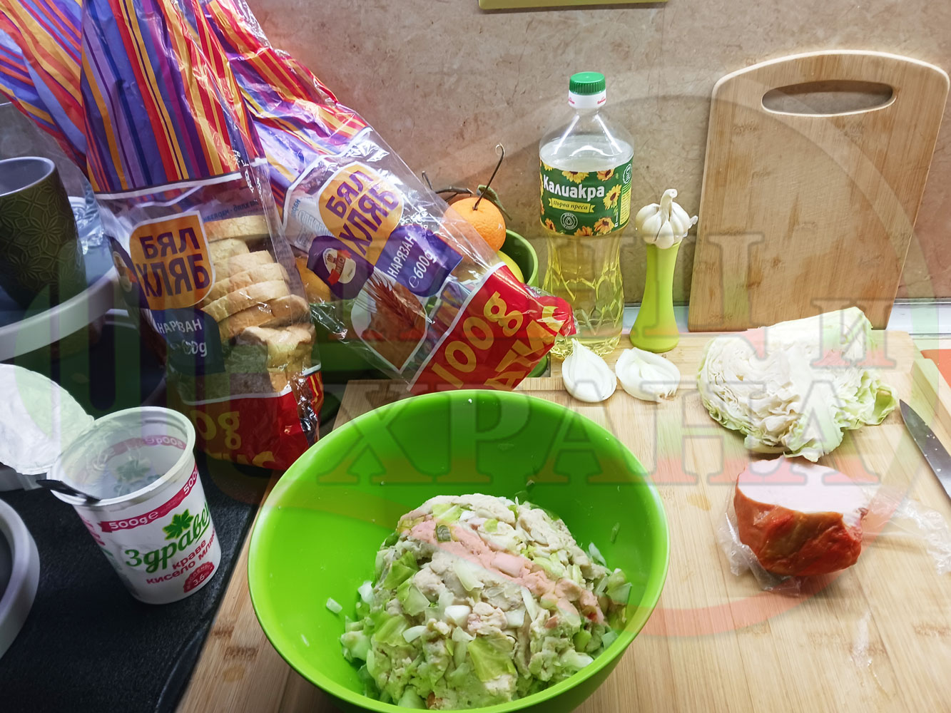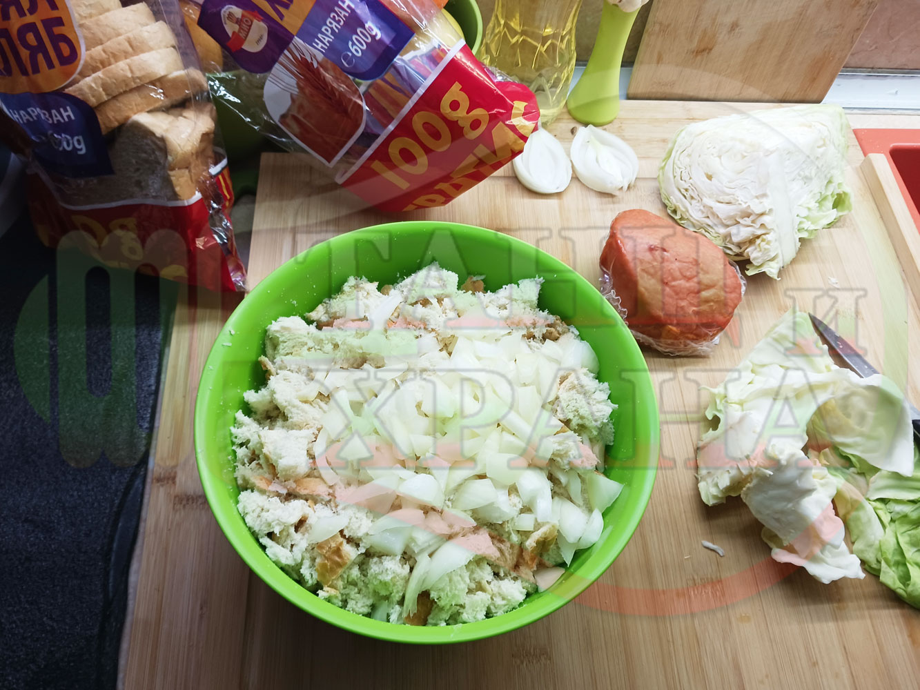 Надробете хляба в купа и добавете обеления, измит и нарязан на едро кромид лук заедно с измитото и нарязано на едро прясно зеле (заделете по-хубави вътрешни листенца от зелето и от сърцевината на кромид лука за украса). Размесете с ръка продуктите за да се овкусят, пуснат част от соковете си и се слегнат в някаква степен. Добавете обеленото от ядливата кафеникава кора и нарязано на малки парченца жарено филе заедно с обеления и нарязан на едро чесън (запазете кората от филето за друг вид ястия или бульони). Измийте чушката, почистете я от семките, нарежете я на малки парченца и я сипете в купата заедно с българското кисело мляко и слънчогледовото олио. Отново размесете с ръка и продължете да разбърквате и намачквате продуктите с вилица до получаване на сравнително гъсто, хомогенизирано хлебно тесто.