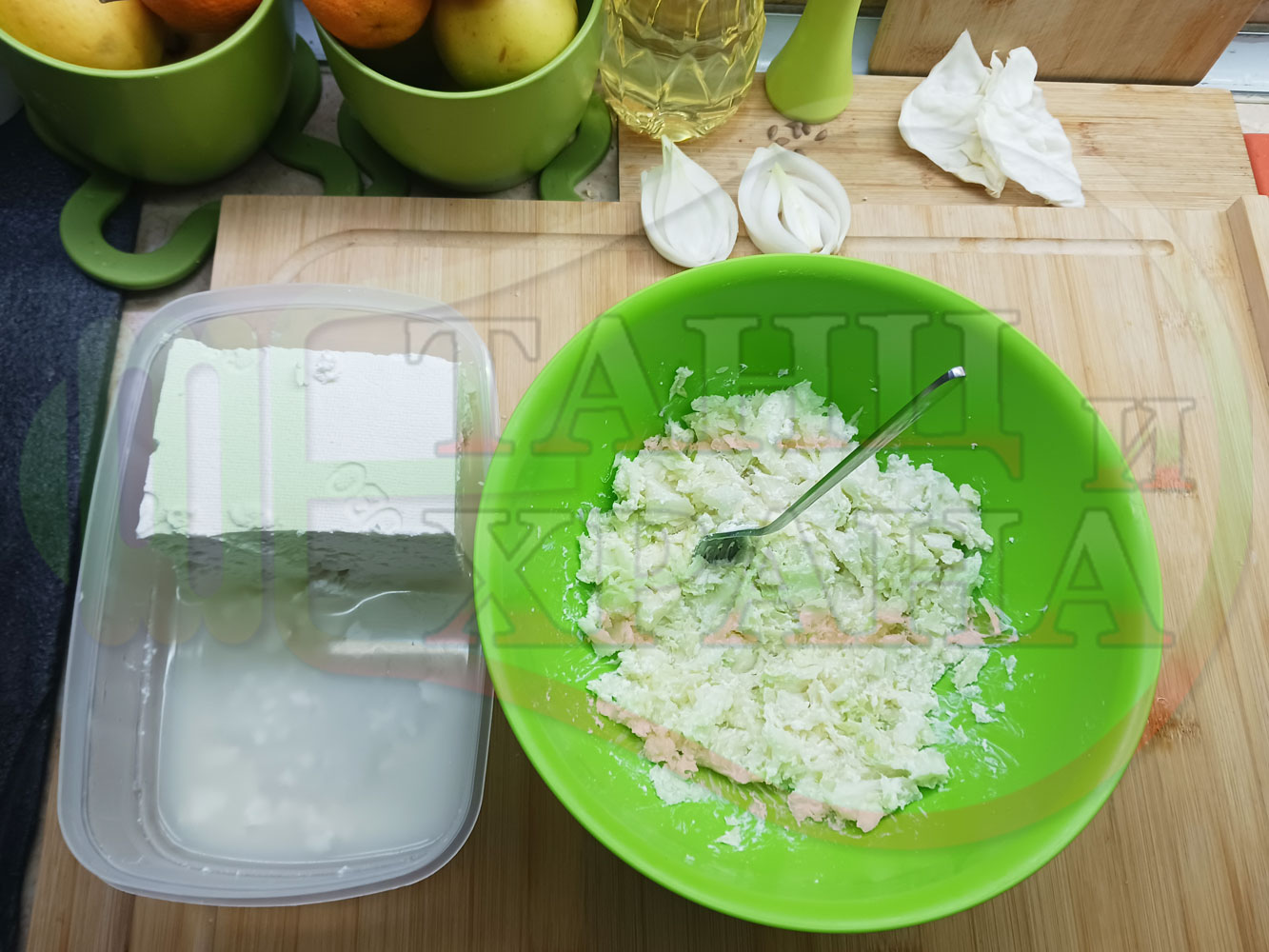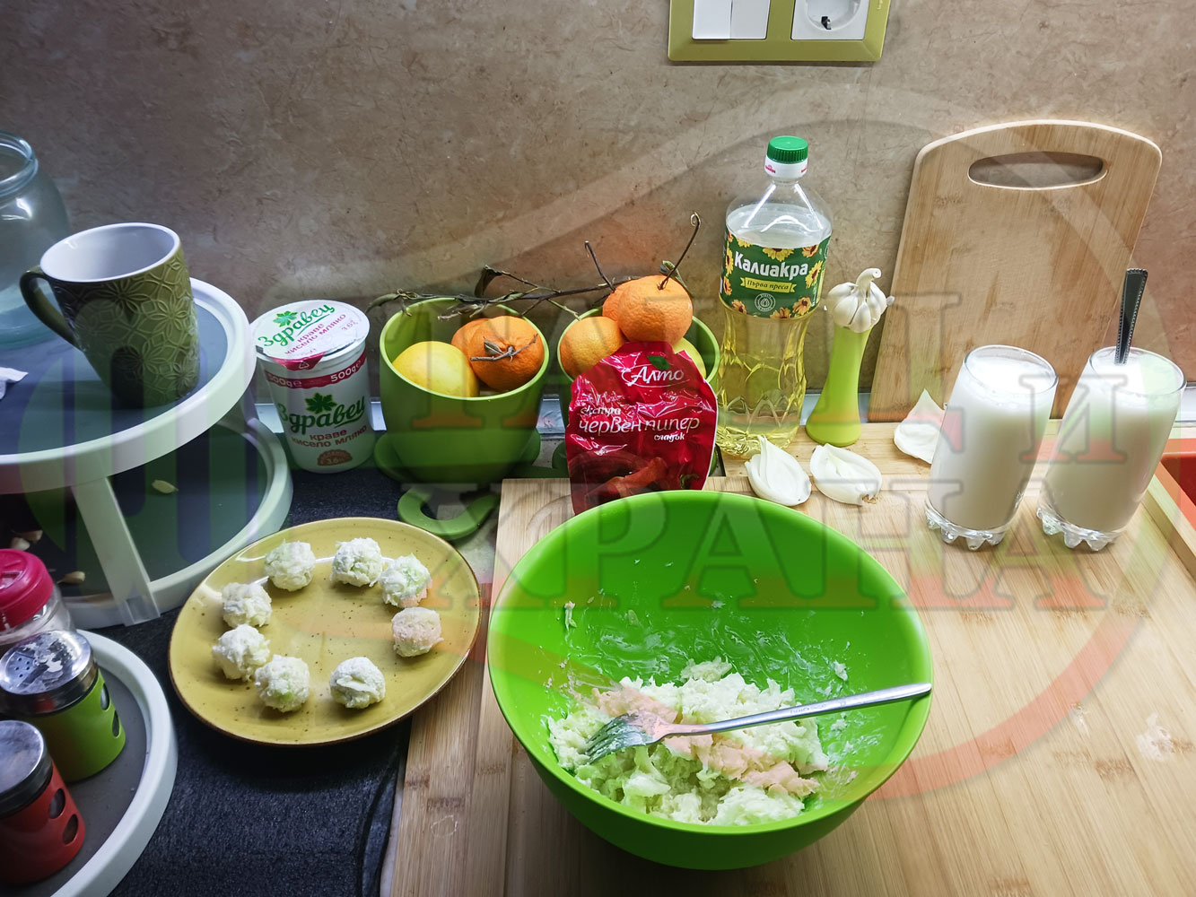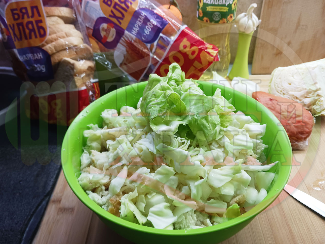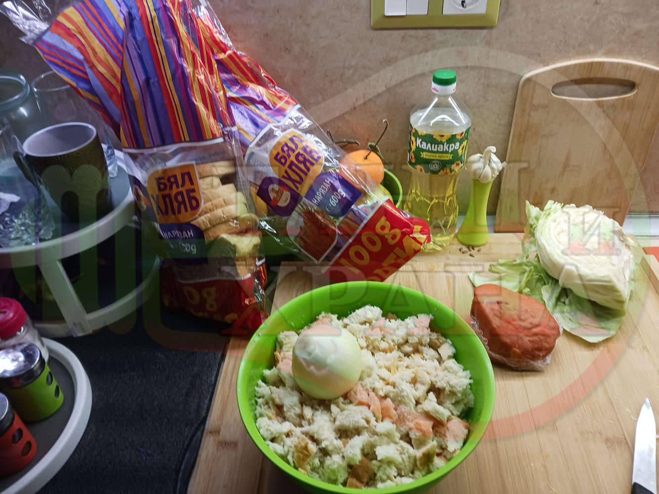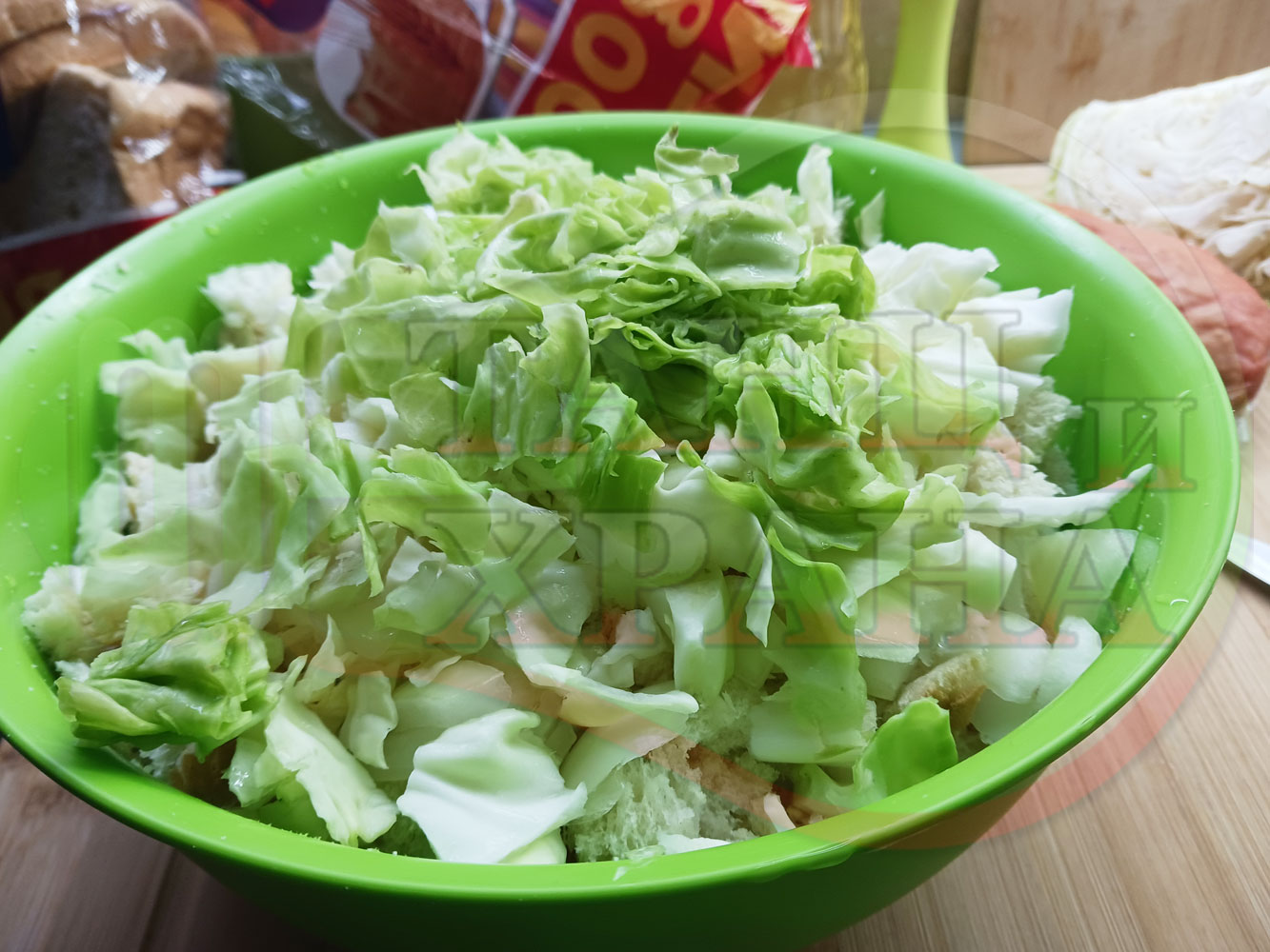 Надробете хляба в купа и добавете обеления, измит и нарязан на едро кромид лук заедно с измитото и нарязано на едро прясно зеле (заделете по-хубави вътрешни листенца от зелето и от сърцевината на кромид лука за украса). Размесете с ръка продуктите за да се овкусят, пуснат част от соковете си и се слегнат в някаква степен. Добавете обеленото от ядливата кафеникава кора и нарязано на малки парченца жарено филе заедно с обеления и нарязан на едро чесън (запазете кората от филето за друг вид ястия или бульони). Измийте чушката, почистете я от семките, нарежете я на малки парченца и я сипете в купата заедно с българското кисело мляко и слънчогледовото олио. Отново размесете с ръка и продължете да разбърквате и намачквате продуктите с вилица до получаване на сравнително гъсто, хомогенизирано хлебно тесто.