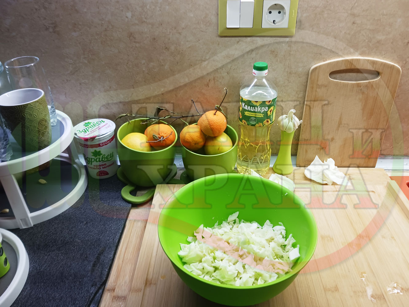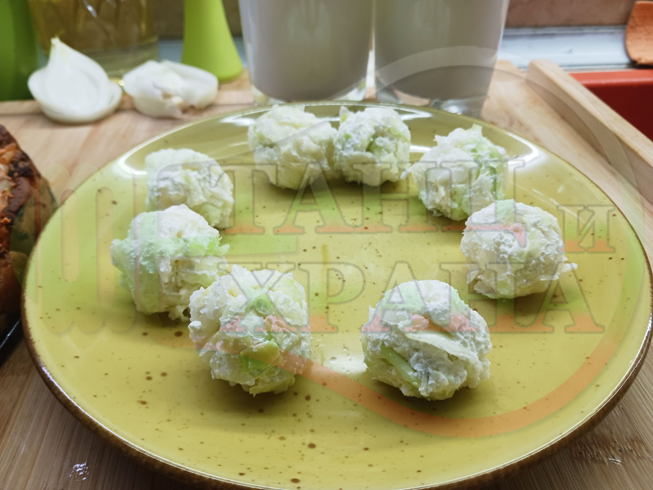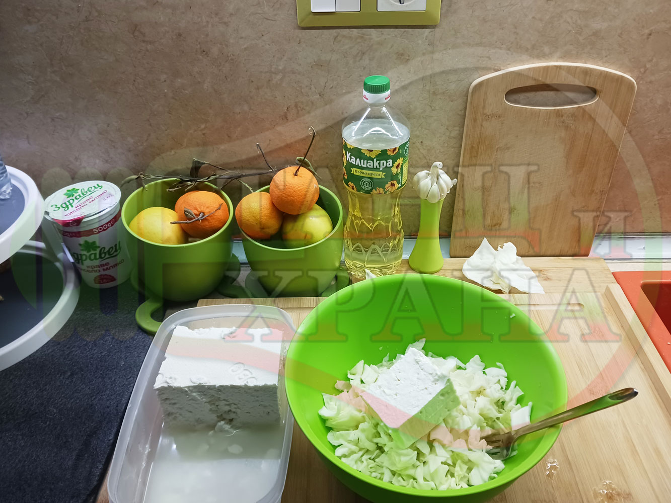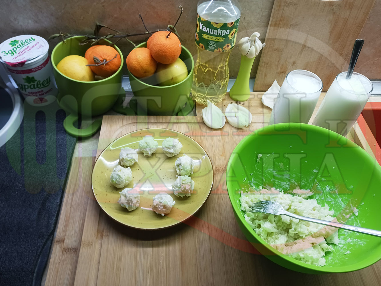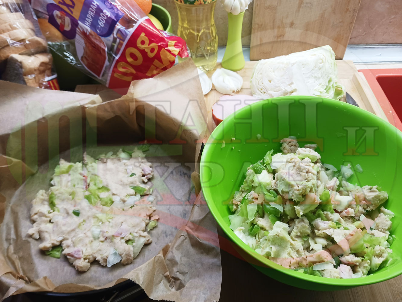 Надробете хляба в купа и добавете обеления, измит и нарязан на едро кромид лук заедно с измитото и нарязано на едро прясно зеле (заделете по-хубави вътрешни листенца от зелето и от сърцевината на кромид лука за украса). Размесете с ръка продуктите за да се овкусят, пуснат част от соковете си и се слегнат в някаква степен. Добавете обеленото от ядливата кафеникава кора и нарязано на малки парченца жарено филе заедно с обеления и нарязан на едро чесън (запазете кората от филето за друг вид ястия или бульони). Измийте чушката, почистете я от семките, нарежете я на малки парченца и я сипете в купата заедно с българското кисело мляко и слънчогледовото олио. Отново размесете с ръка и продължете да разбърквате и намачквате продуктите с вилица до получаване на сравнително гъсто, хомогенизирано хлебно тесто.