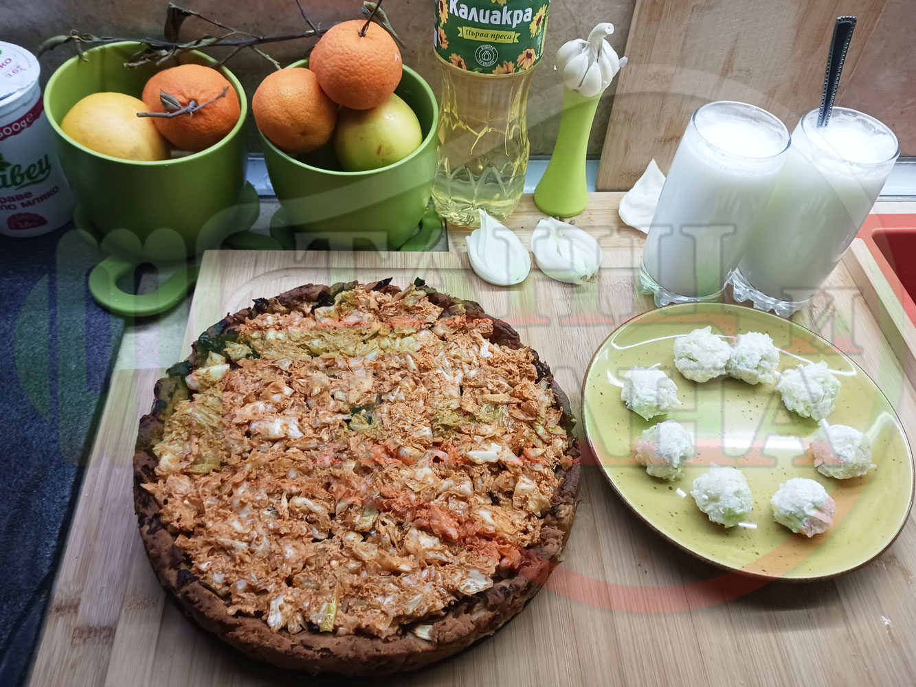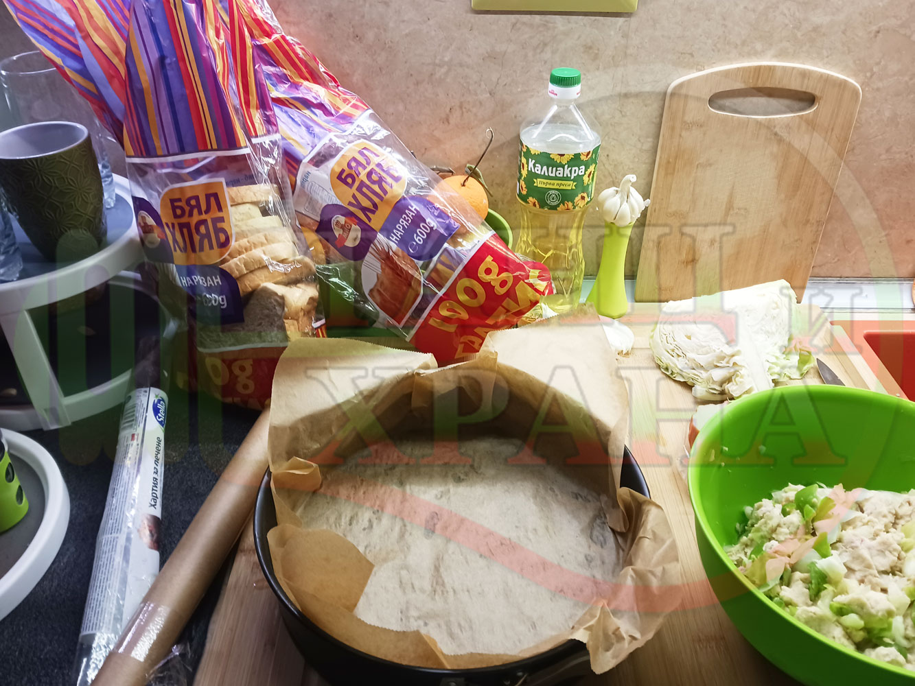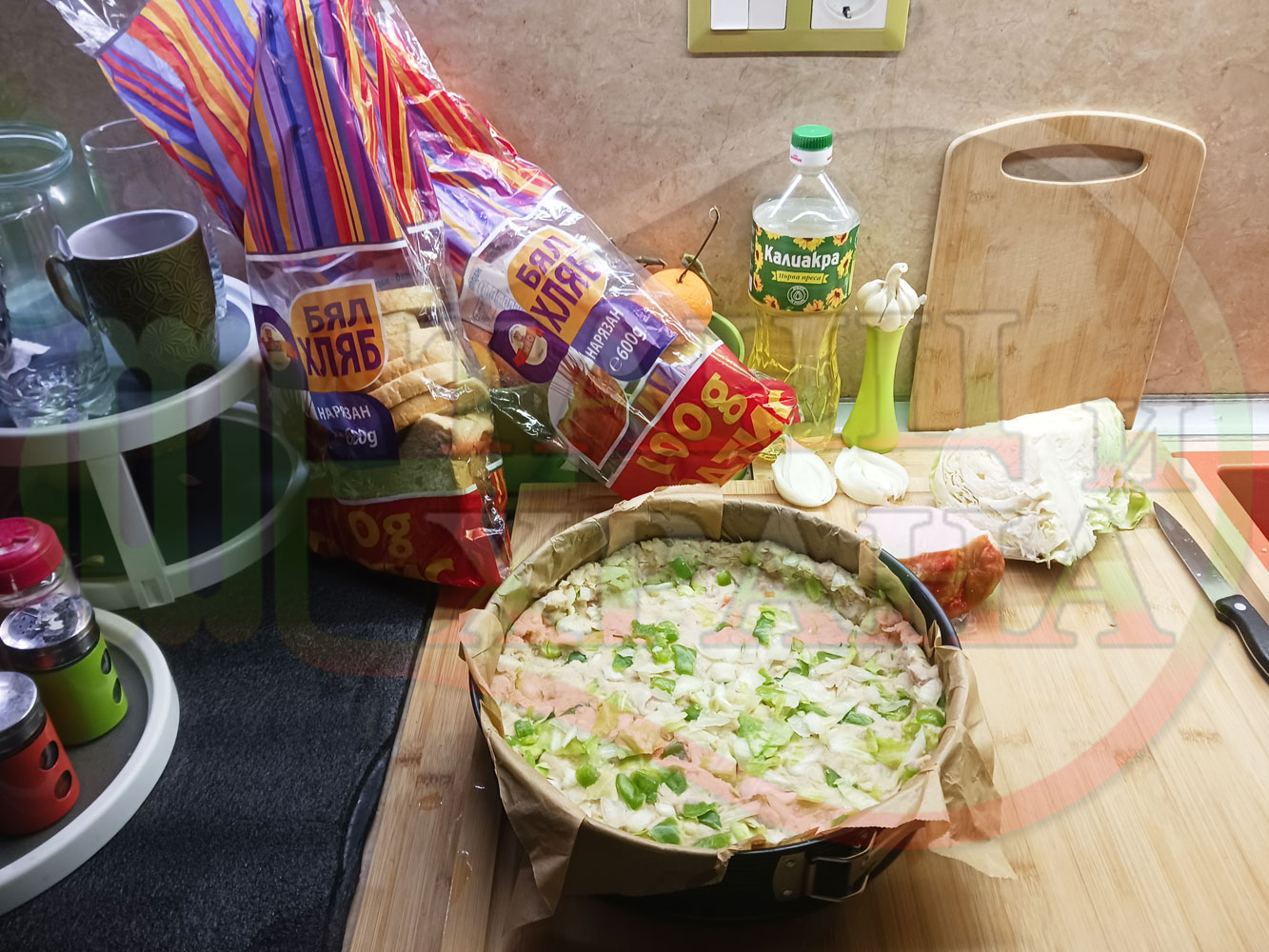 ПРОДУКТИ: Приблизителни количества за българска хлебна торта "Зелева филежарена" омесена от хляб с прясно зеле, кромид лук, зелени пресни чушки, жарено филе и кисело мляко от България сурово гарнирана със сиреново зелев крем с червен сладък пипер и краве бяло сирене - двукомпонентна