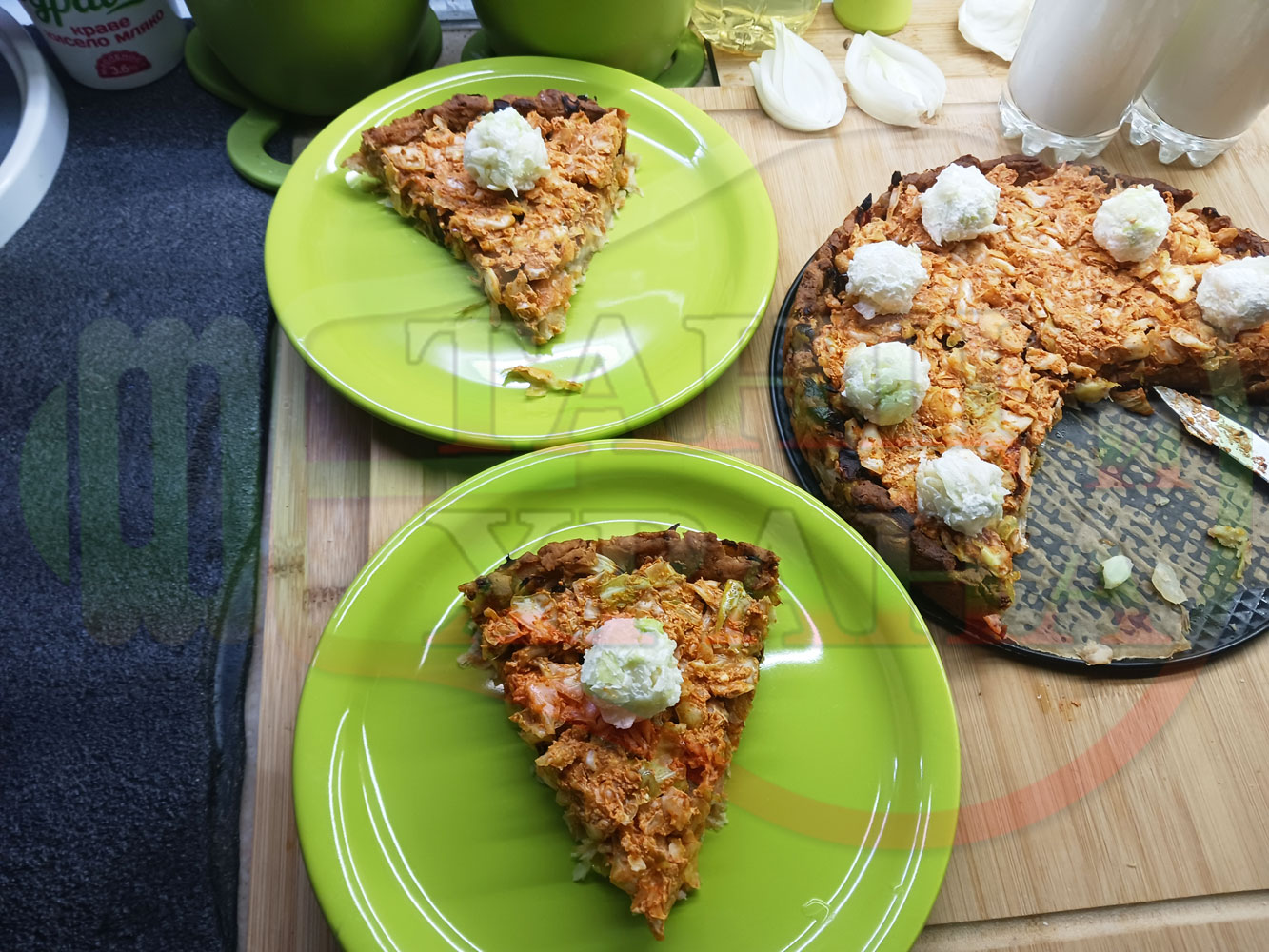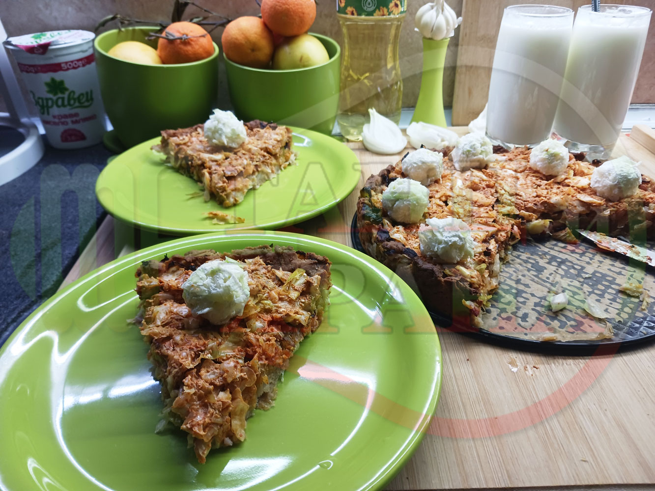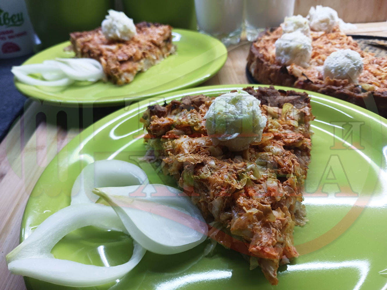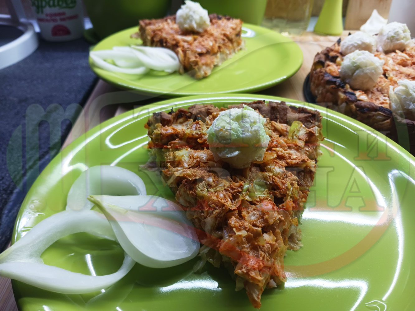 Българска хлебна торта "Зелева филежарена" омесена от хляб с прясно зеле, кромид лук, зелени пресни чушки, жарено филе и кисело мляко от България сурово гарнирана със сиреново зелев крем с червен сладък пипер и краве бяло сирене - двукомпонентна