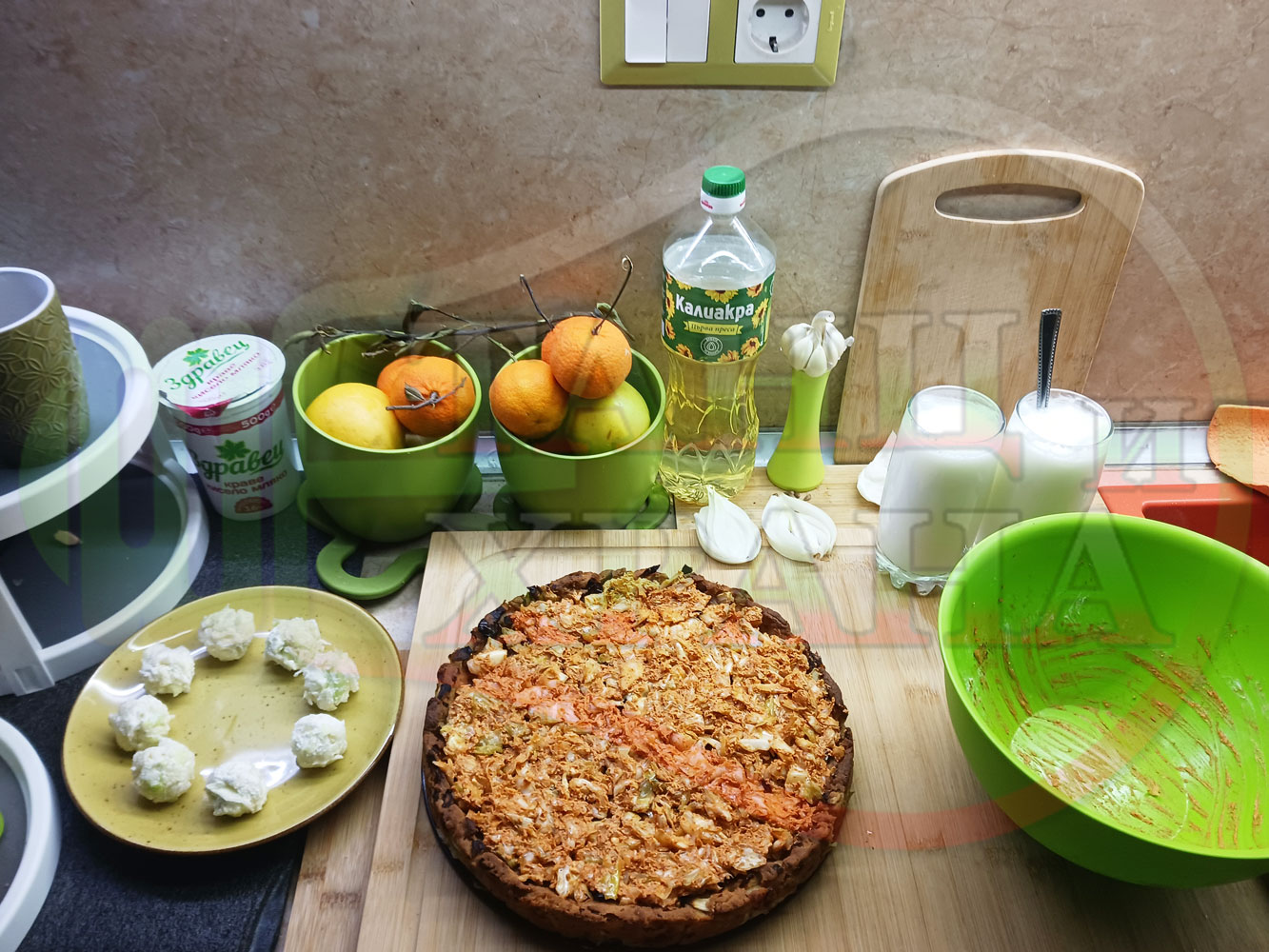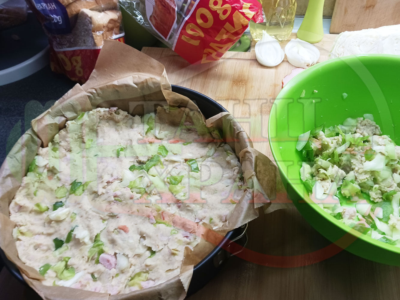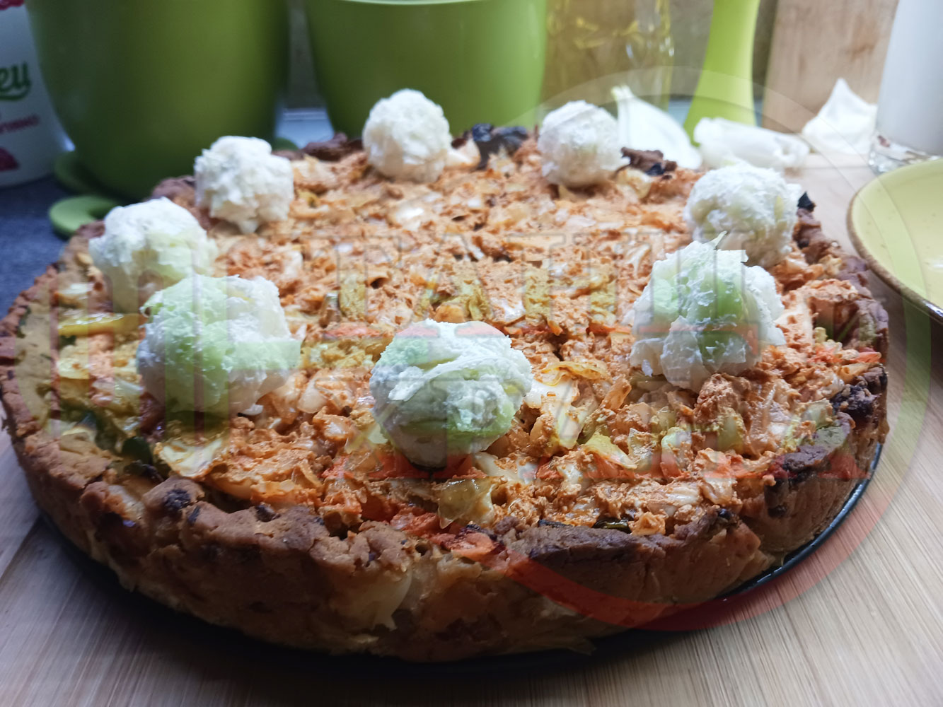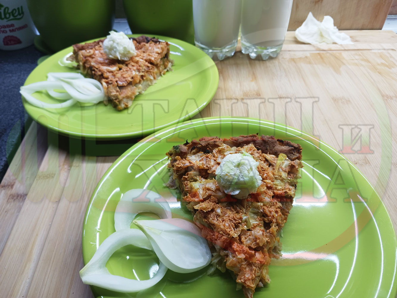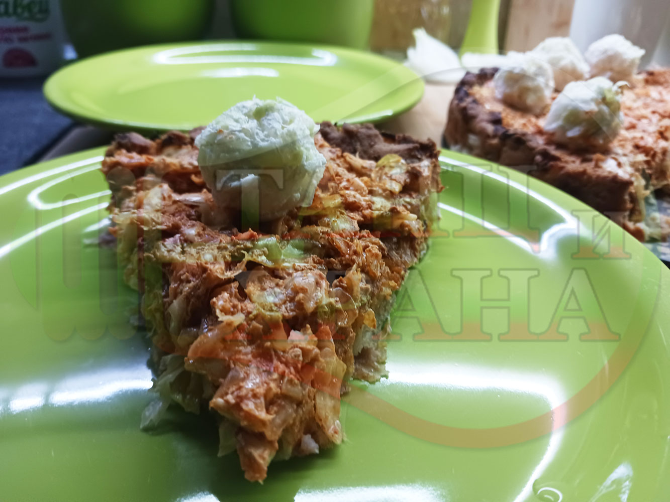 Българска хлебна торта "Зелева филежарена" омесена от хляб с прясно зеле, кромид лук, зелени пресни чушки, жарено филе и кисело мляко от България сурово гарнирана със сиреново зелев крем с червен сладък пипер и краве бяло сирене - двукомпонентна