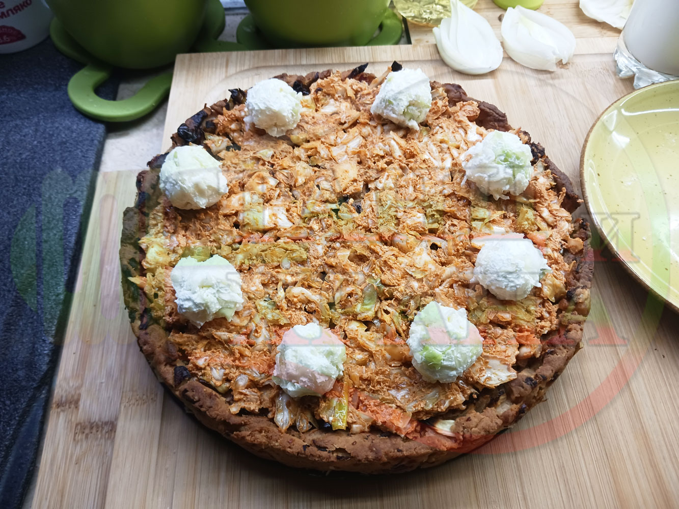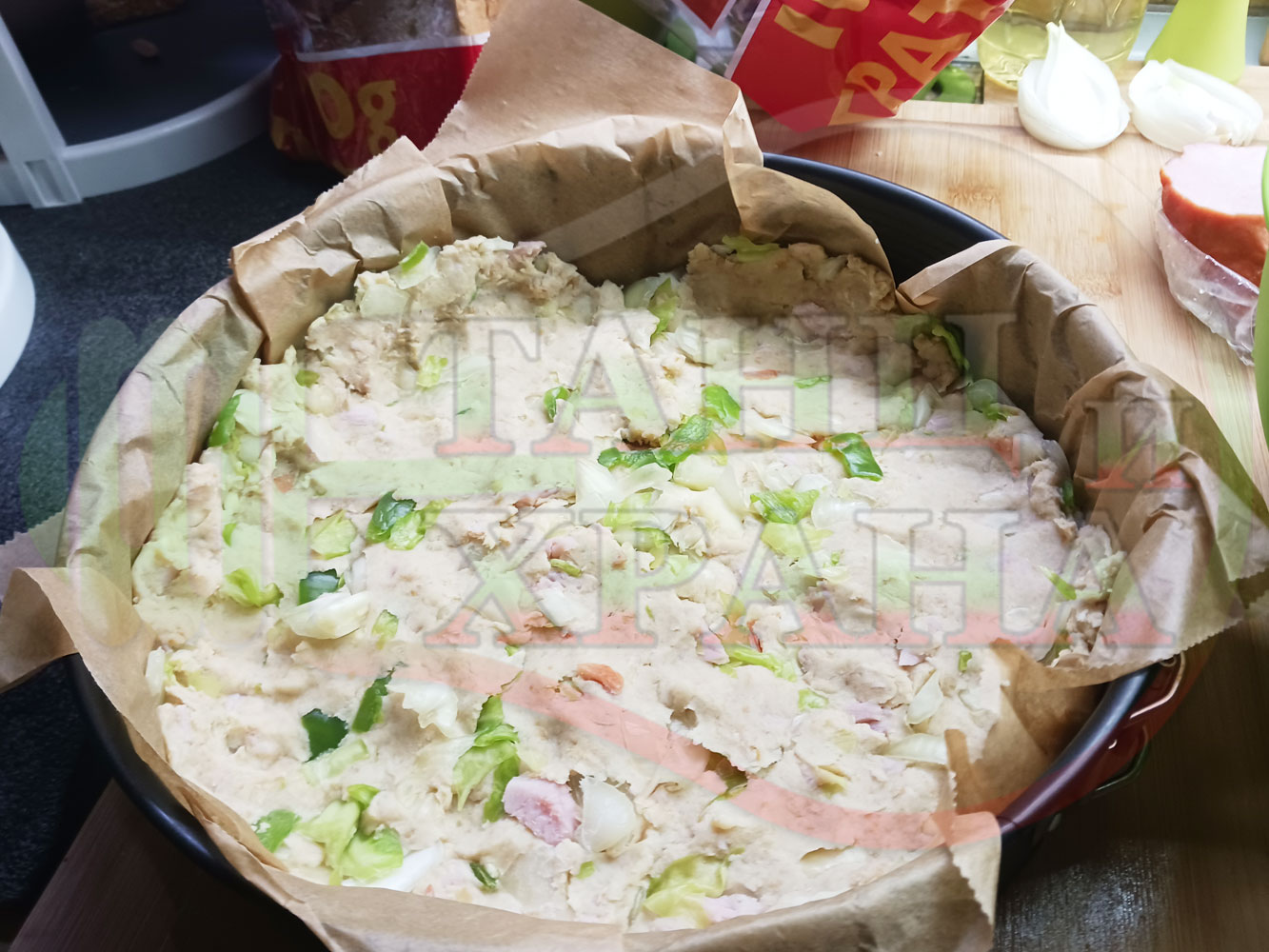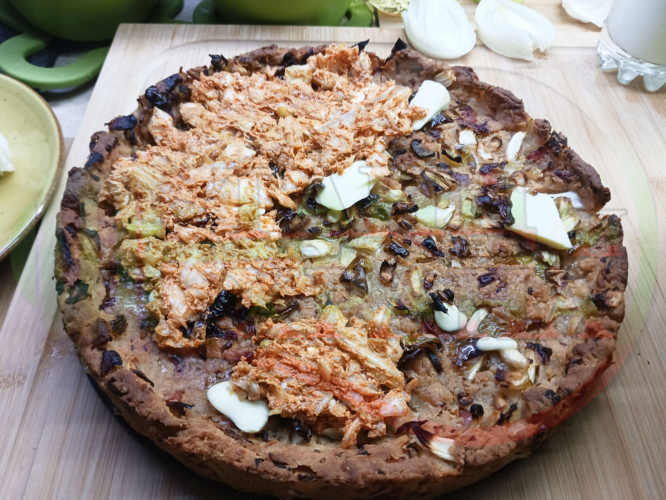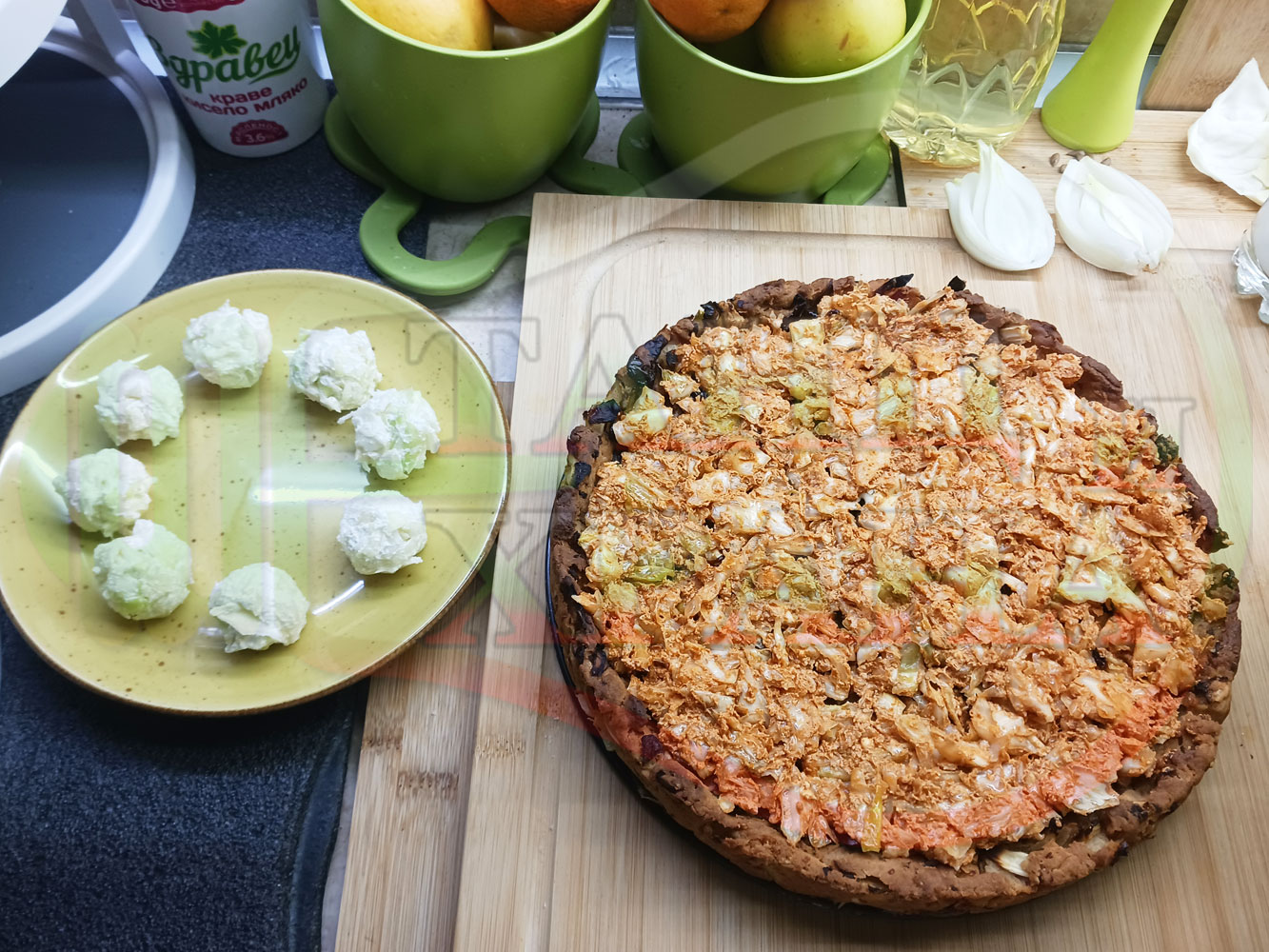 Българска хлебна торта "Зелева филежарена" омесена от хляб с прясно зеле, кромид лук, зелени пресни чушки, жарено филе и кисело мляко от България сурово гарнирана със сиреново зелев крем с червен сладък пипер и краве бяло сирене - двукомпонентна