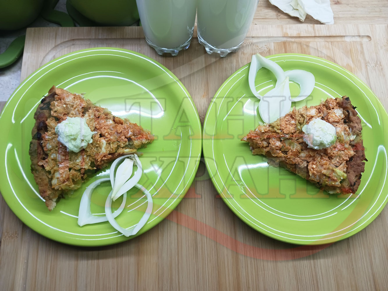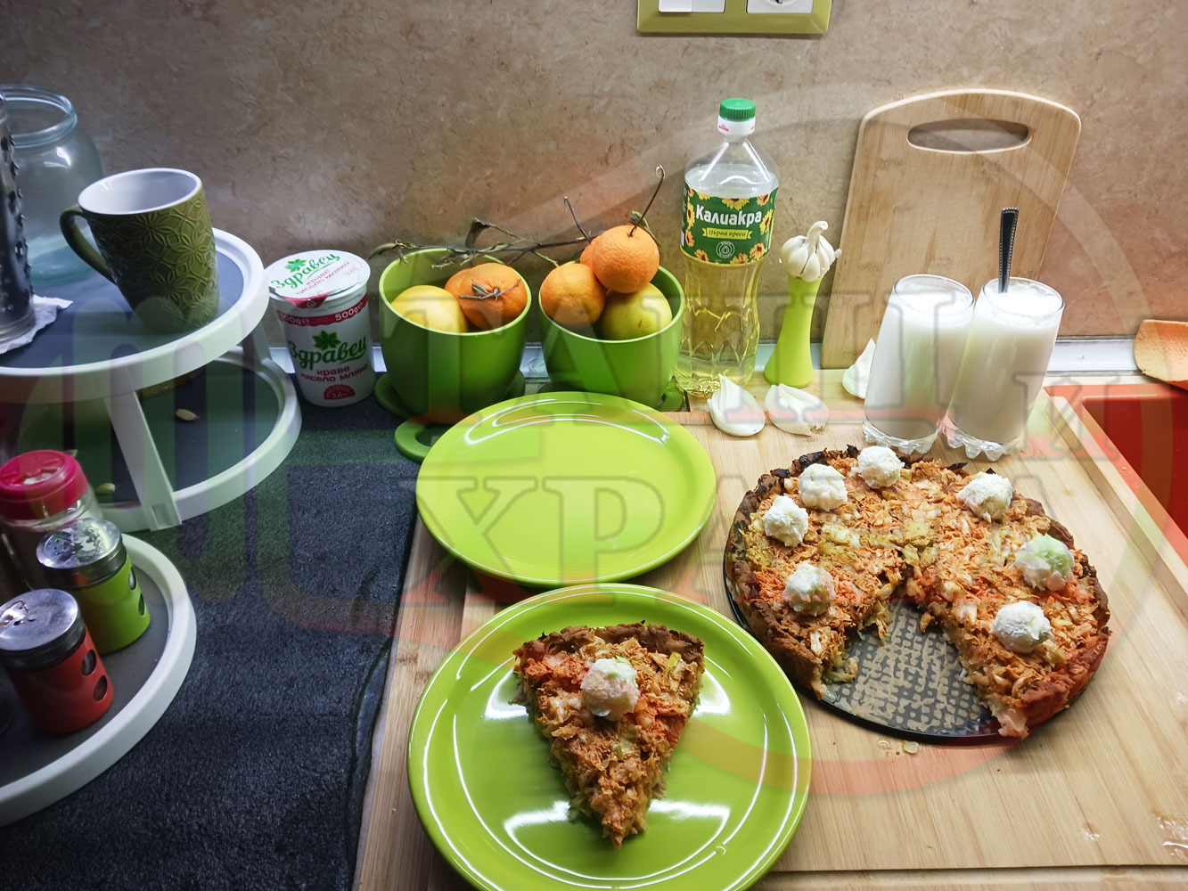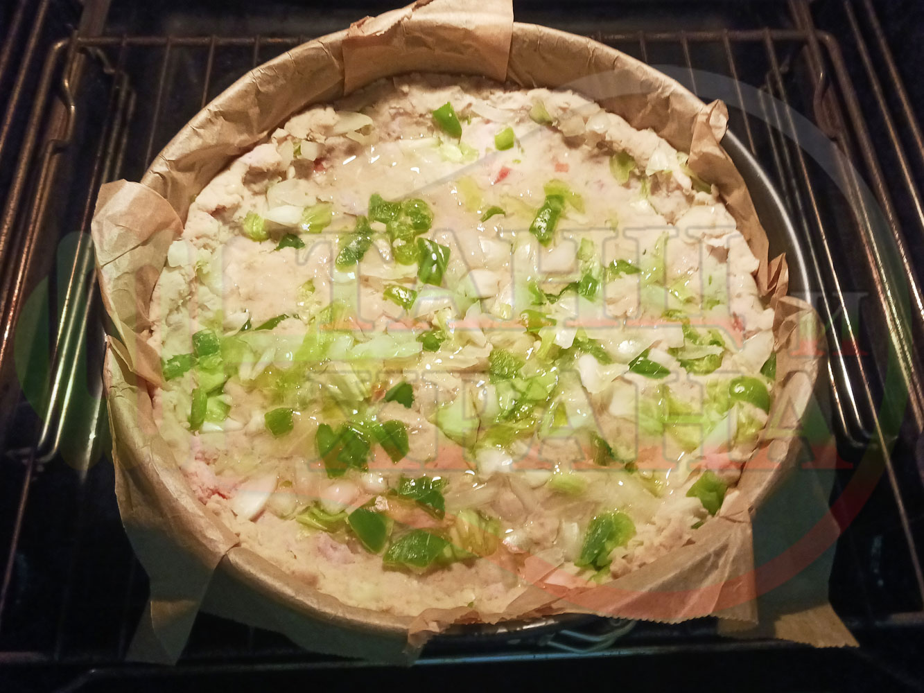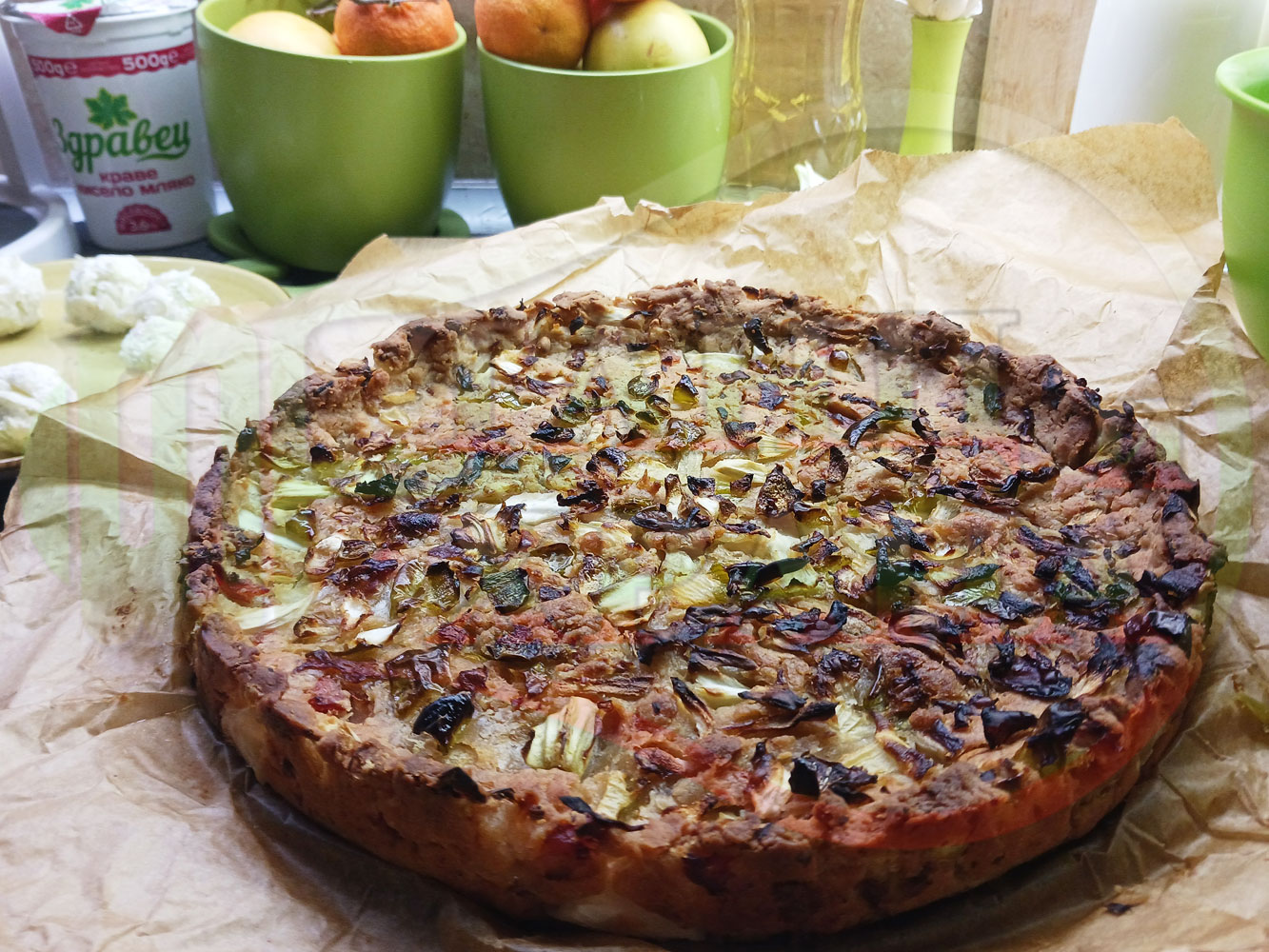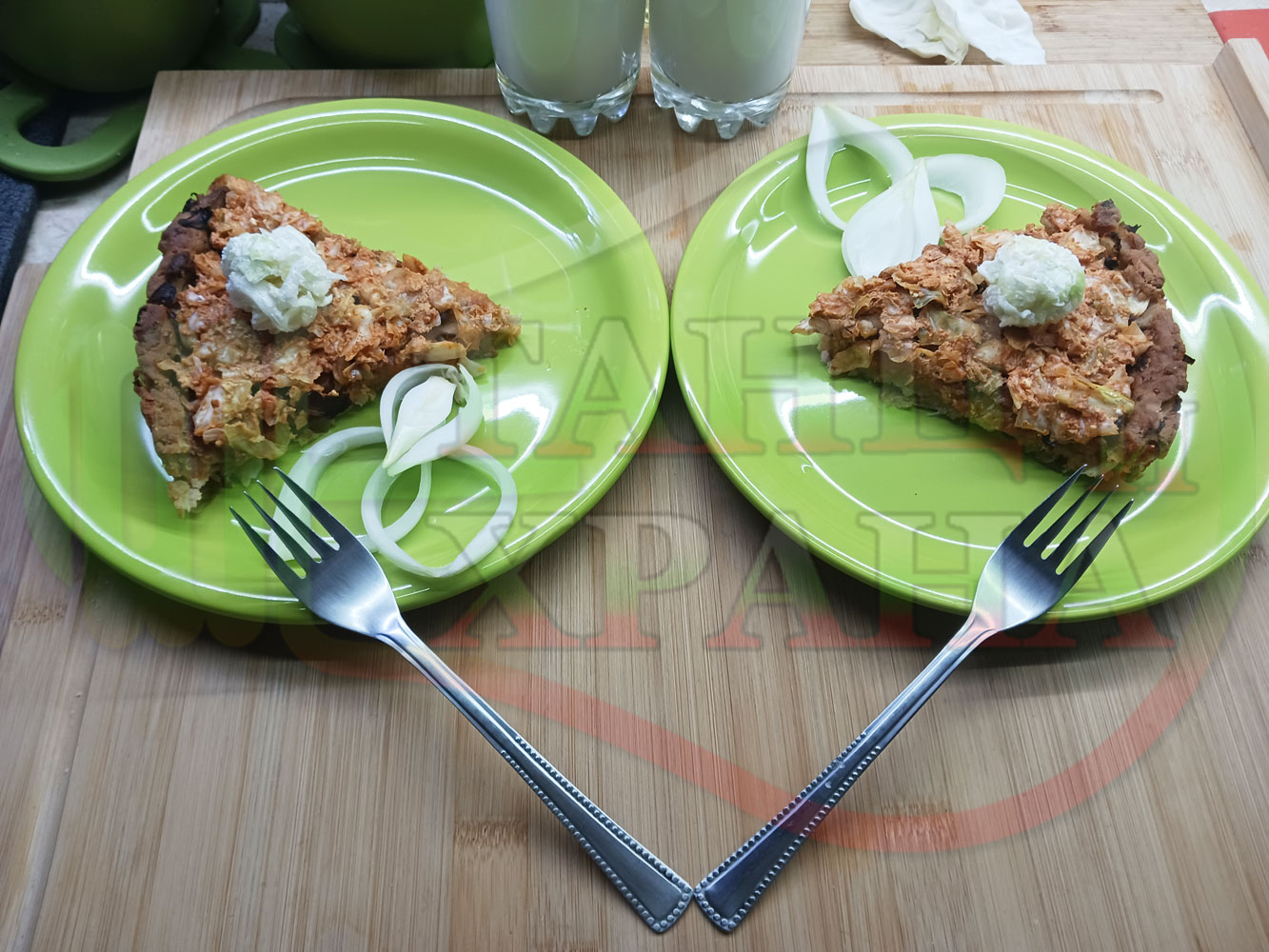 Българска хлебна торта "Зелева филежарена" омесена от хляб с прясно зеле, кромид лук, зелени пресни чушки, жарено филе и кисело мляко от България сурово гарнирана със сиреново зелев крем с червен сладък пипер и краве бяло сирене - двукомпонентна