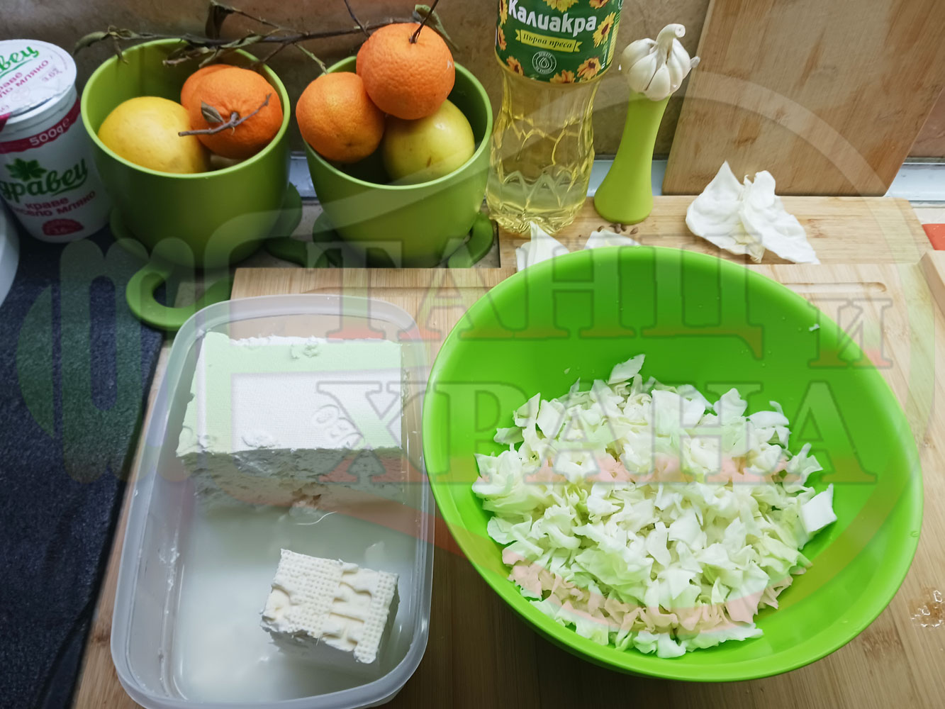Измийте зелето, отстранете кочана и сърцевината на кочана, която е твърда и не е особено подходяща за приготвянето на крема и нарежете зелето на едро в купа. Добавете кравето бяло сирене и разбъркайте и намачкайте с вилица до образуване на средно гъст сиреново зелев, хомогенизиран крем (сиренов крем). Оформете 8 или повече малки сиренови топчета за украса на тортата. Сипете червения сладък пипер и слънчогледовото олио в останалата част от крема и разбъркайте и намачкайте с вилица за да се овкуси сиреновия крем.