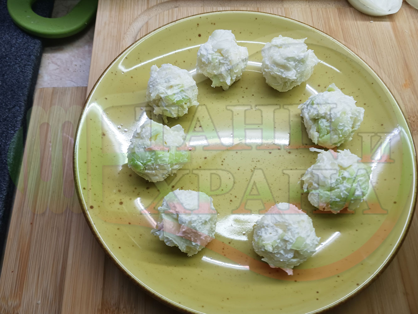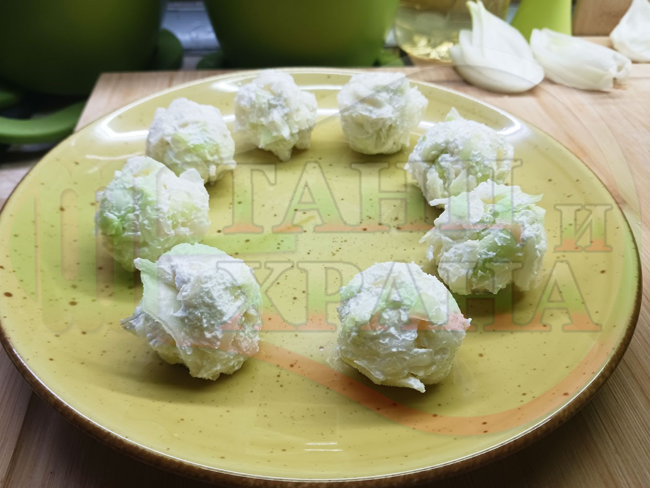 Извадете изпечената хлебна торта от фурната, отстранете падащия ринг и отрежете хартията, така че да остане хартия само под тортата. Поставете нарязано на тънки парченца краве масло на различни места върху тортата докато е гореща, за да усвои в максимална степен кравето масло и да се овкуси. Разпределете сиреново зелевия крем върху маслото и загладете крема до страничния борд на хлебната зелева торта. Гарнирайте и украсете тортата със сиреновите топчета (гарнирайте и украсете по ваше желание и усмотрение).