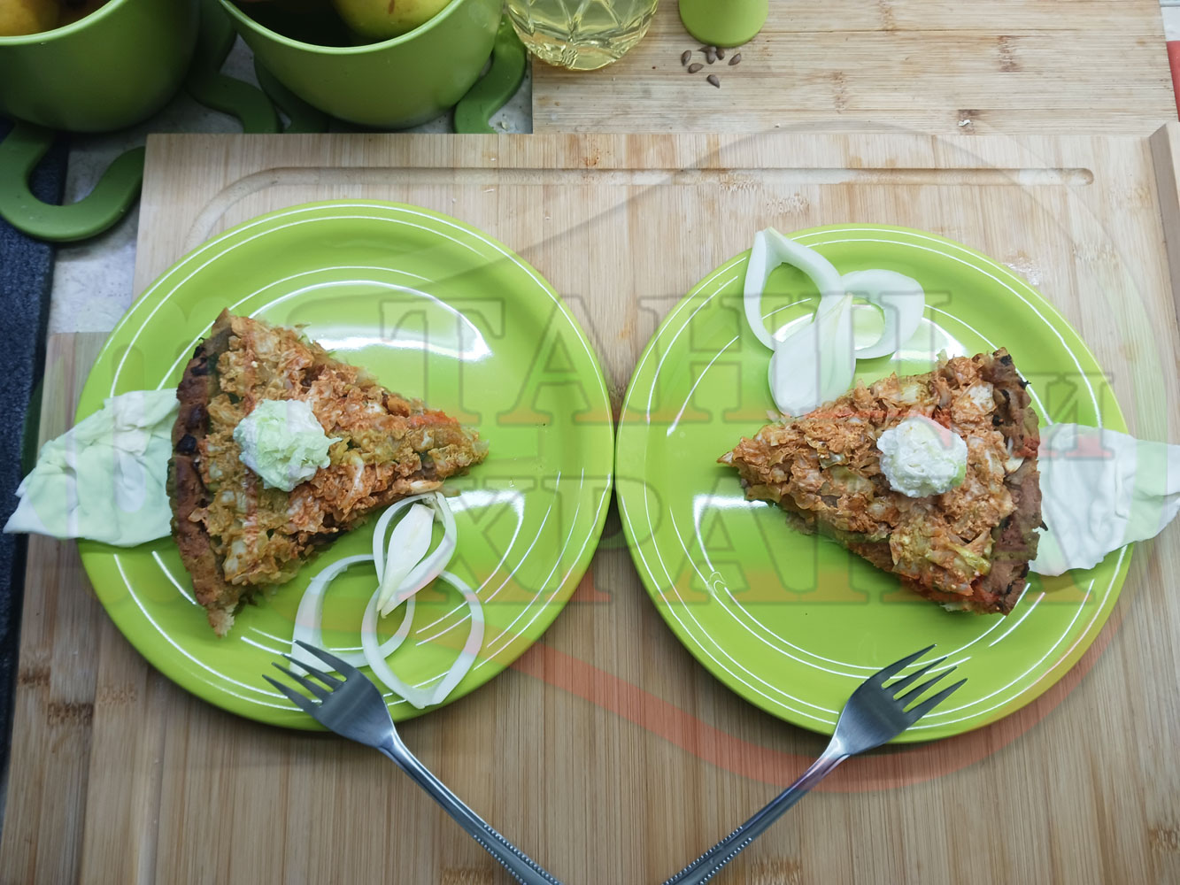 Отрежете по едно парче от тортата и го поставете в центъра на чиниите. Украсете порциите с лучената сърцевина от кромид лука и със зелевите пресни листа (оформете и украсете порциите по ваше желание и усмотрение).