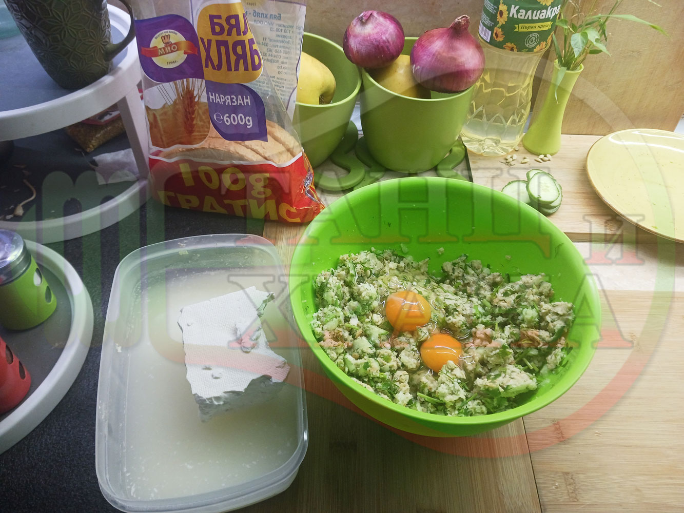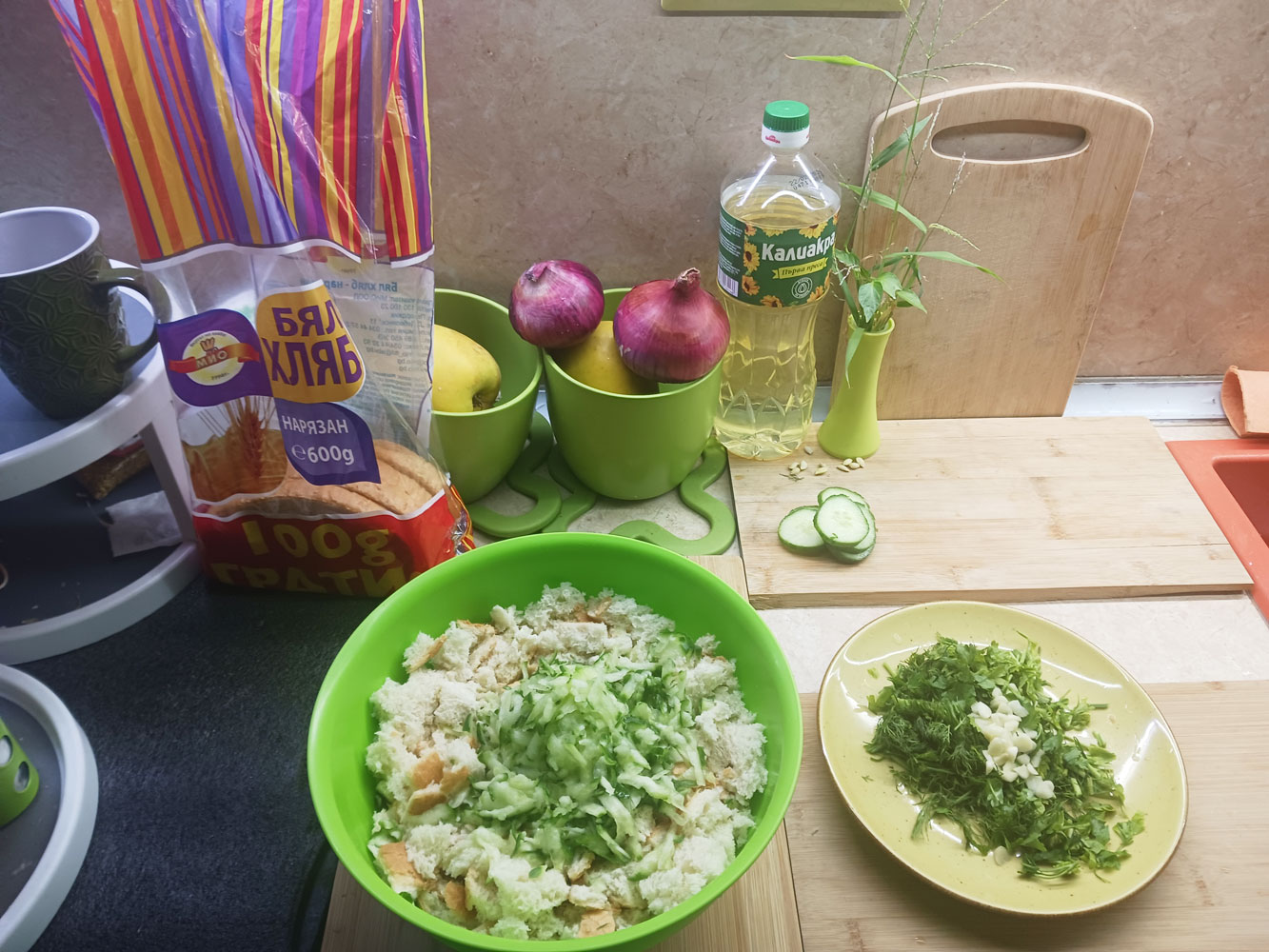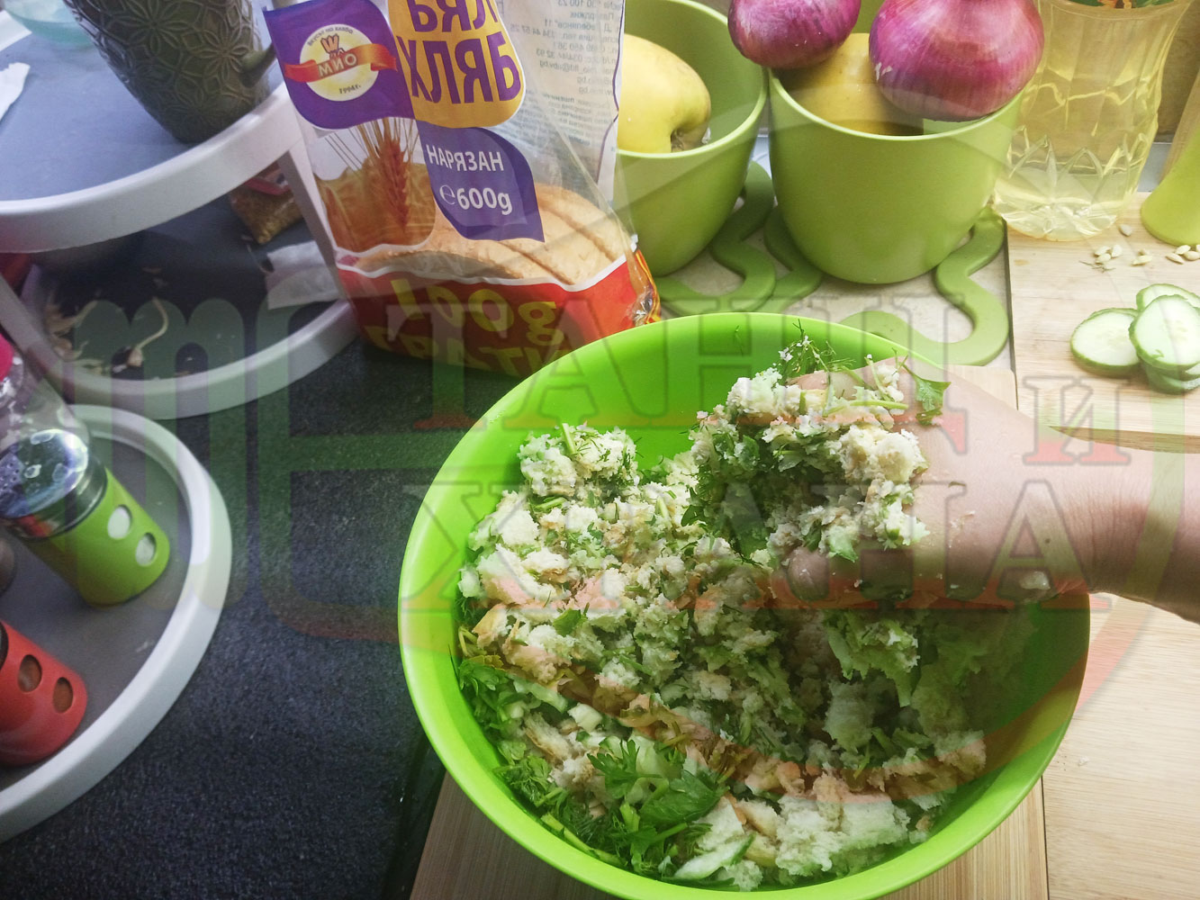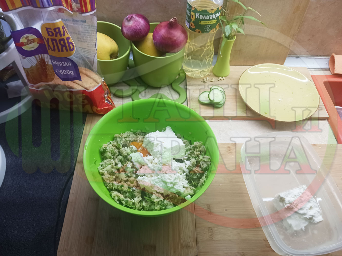 Надробете хляба в купа, измийте краставицата, настържете я на едро и добавете измитите и нарязани на едро копър и магданоз заедно с обеления и нарязан на едро чесън (нарежете част от краставицата на кръгчета и запазете стръкчета копър за украса). Добавете яйцата и кравето бяло сирене и разбъркайте и намачкайте с вилица и/или омесете с ръка продуктите до получаване на средно гъсто хлебно тесто. Сипете слънчогледовото олио и хубаво размесете тестото до хомогенизиране (не намалявайте количеството на олиото, описано в рецептата за да не се напукат кюфтетата при печене).