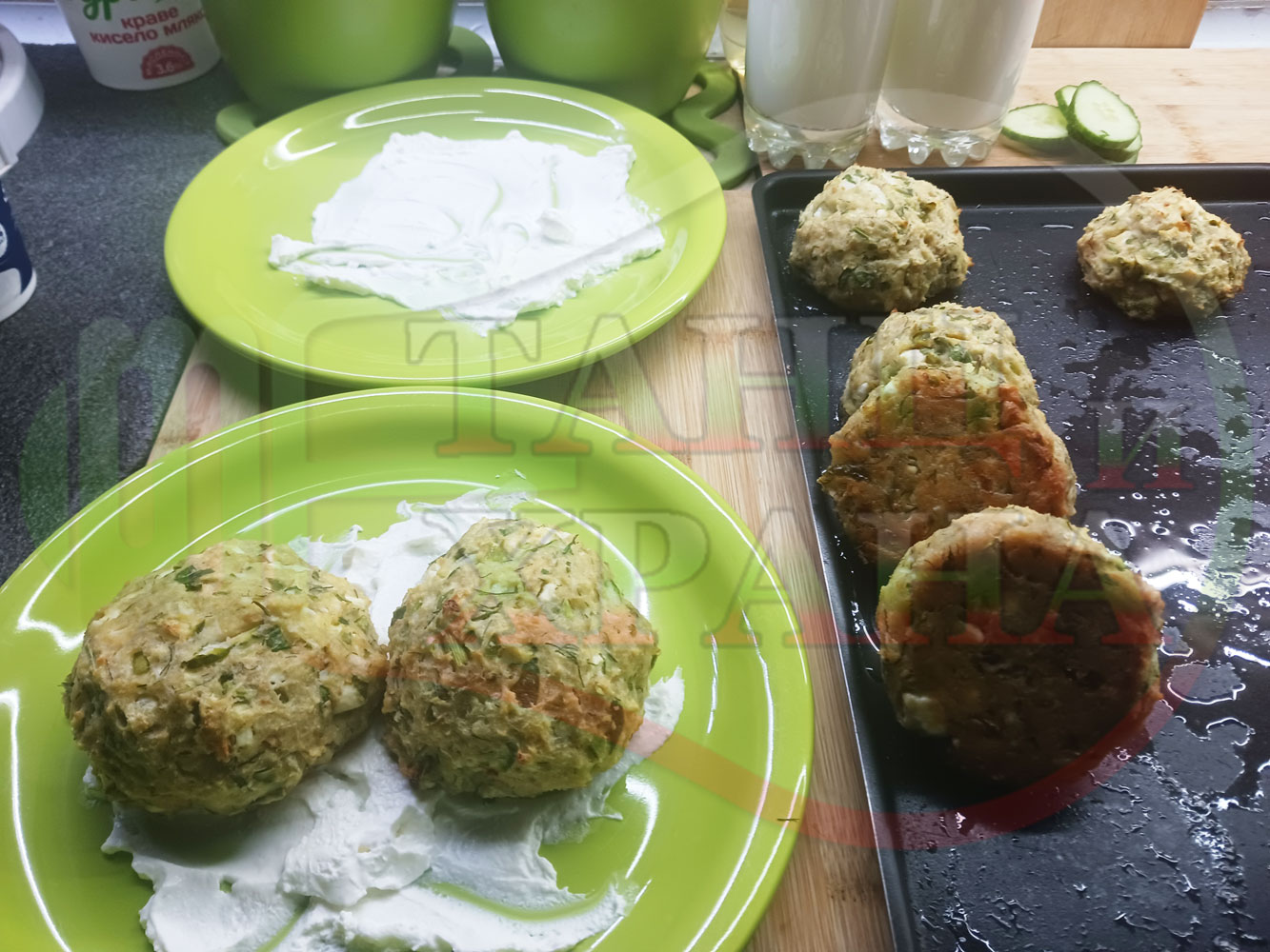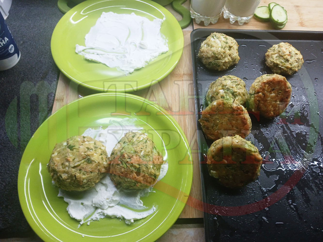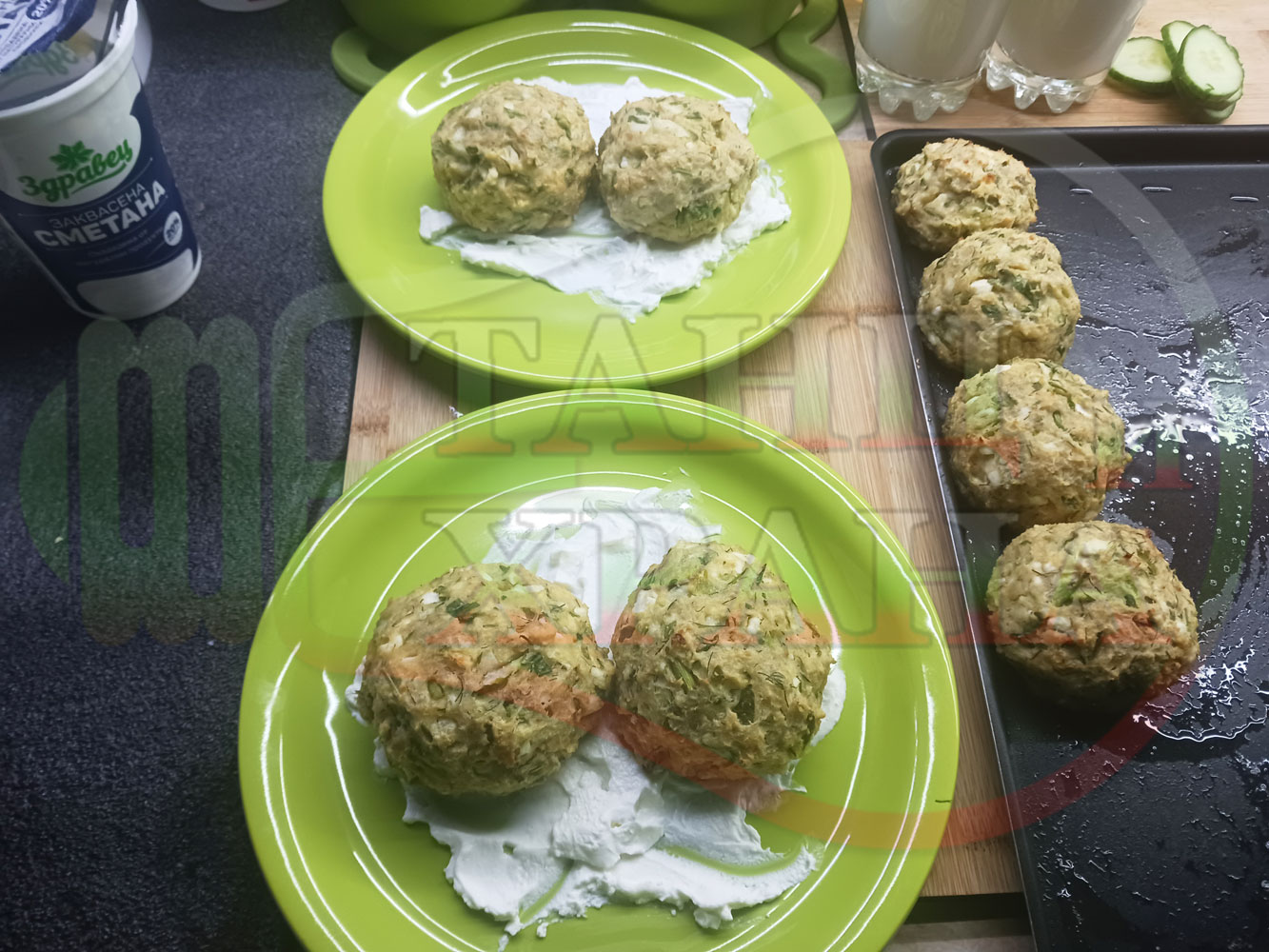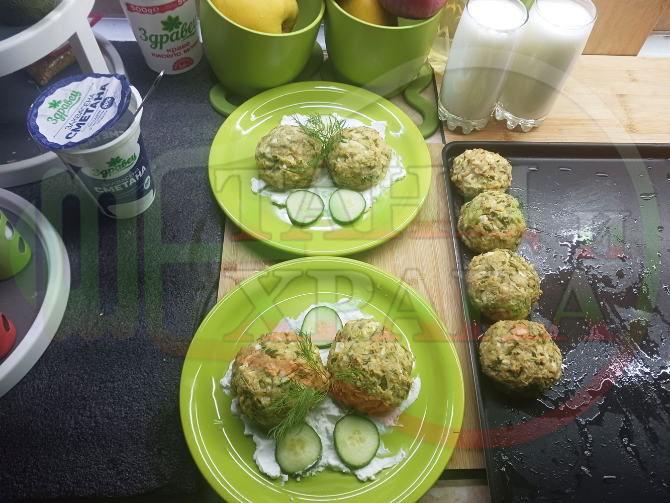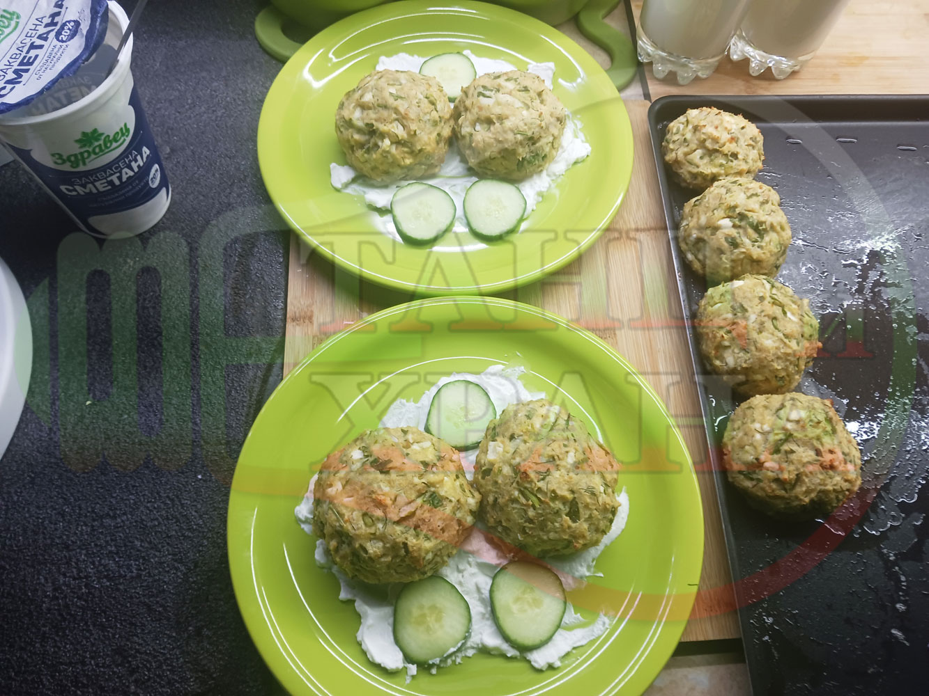 Хлебни кюфтета на фурна "Краставичнокопърови с БГсирене" омесени от хляб с пресни краставици, чесън, яйца, свеж магданоз, копър и краве бяло сирене (българско, саламурено) гарнирани със заквасена сметана