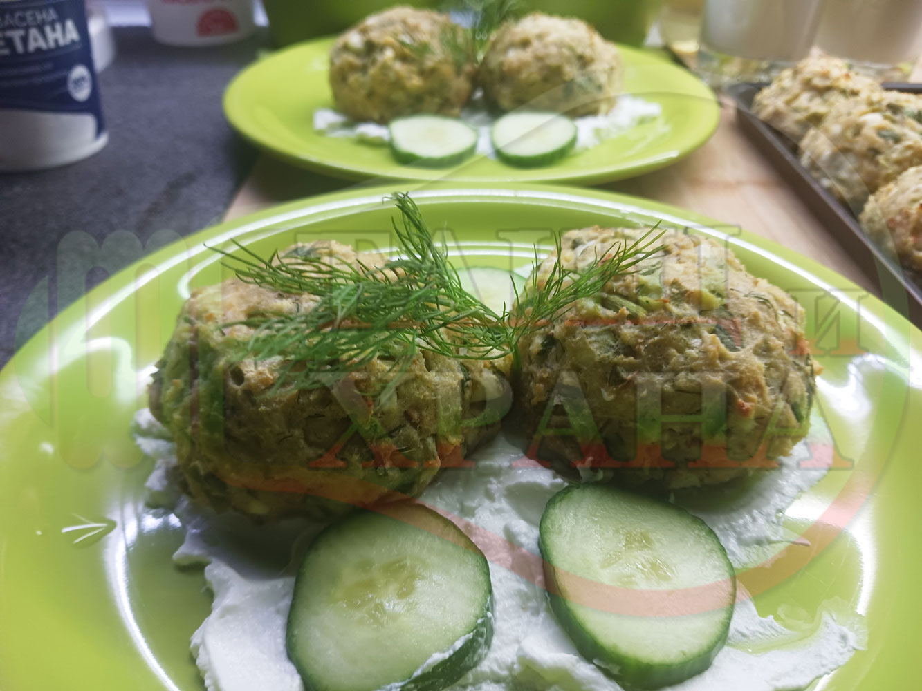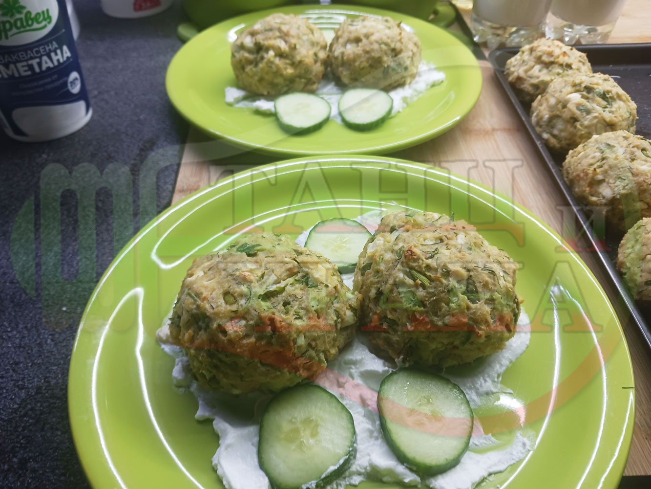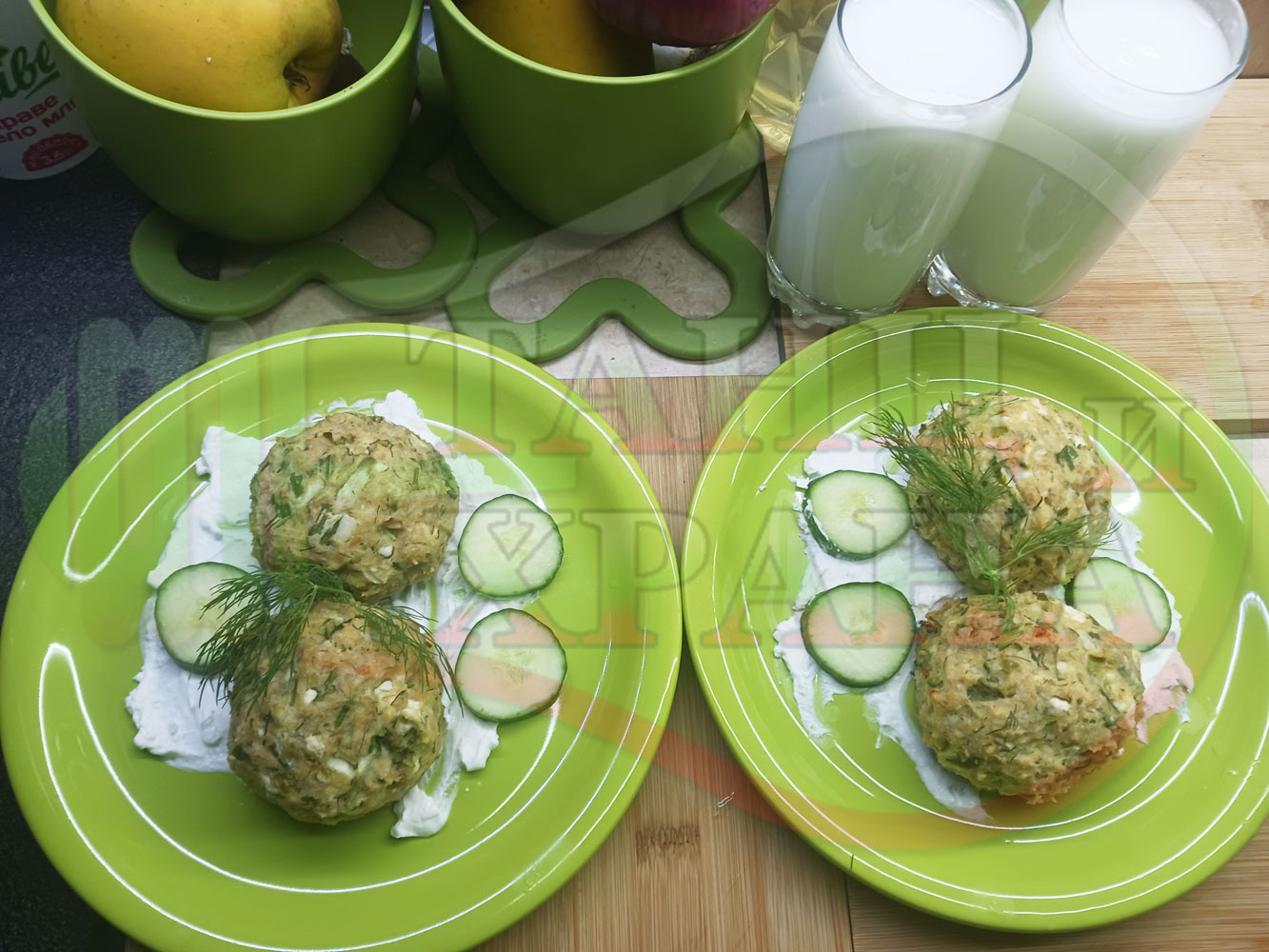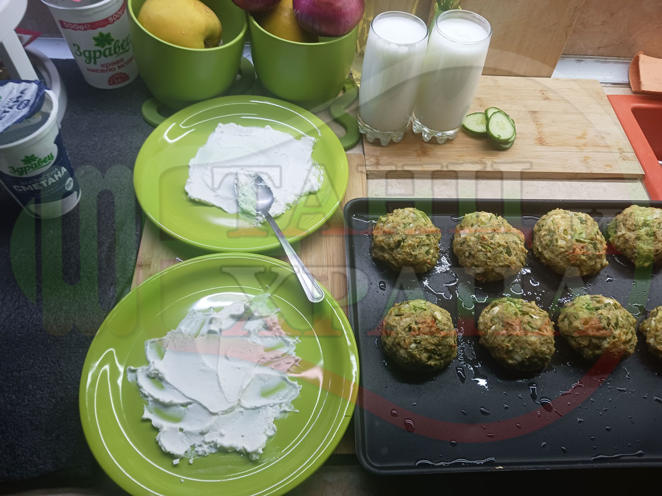 Хлебни кюфтета на фурна "Краставичнокопърови с БГсирене" омесени от хляб с пресни краставици, чесън, яйца, свеж магданоз, копър и краве бяло сирене (българско, саламурено) гарнирани със заквасена сметана