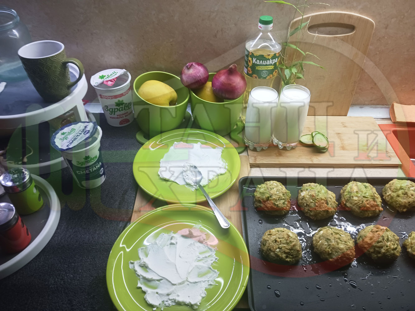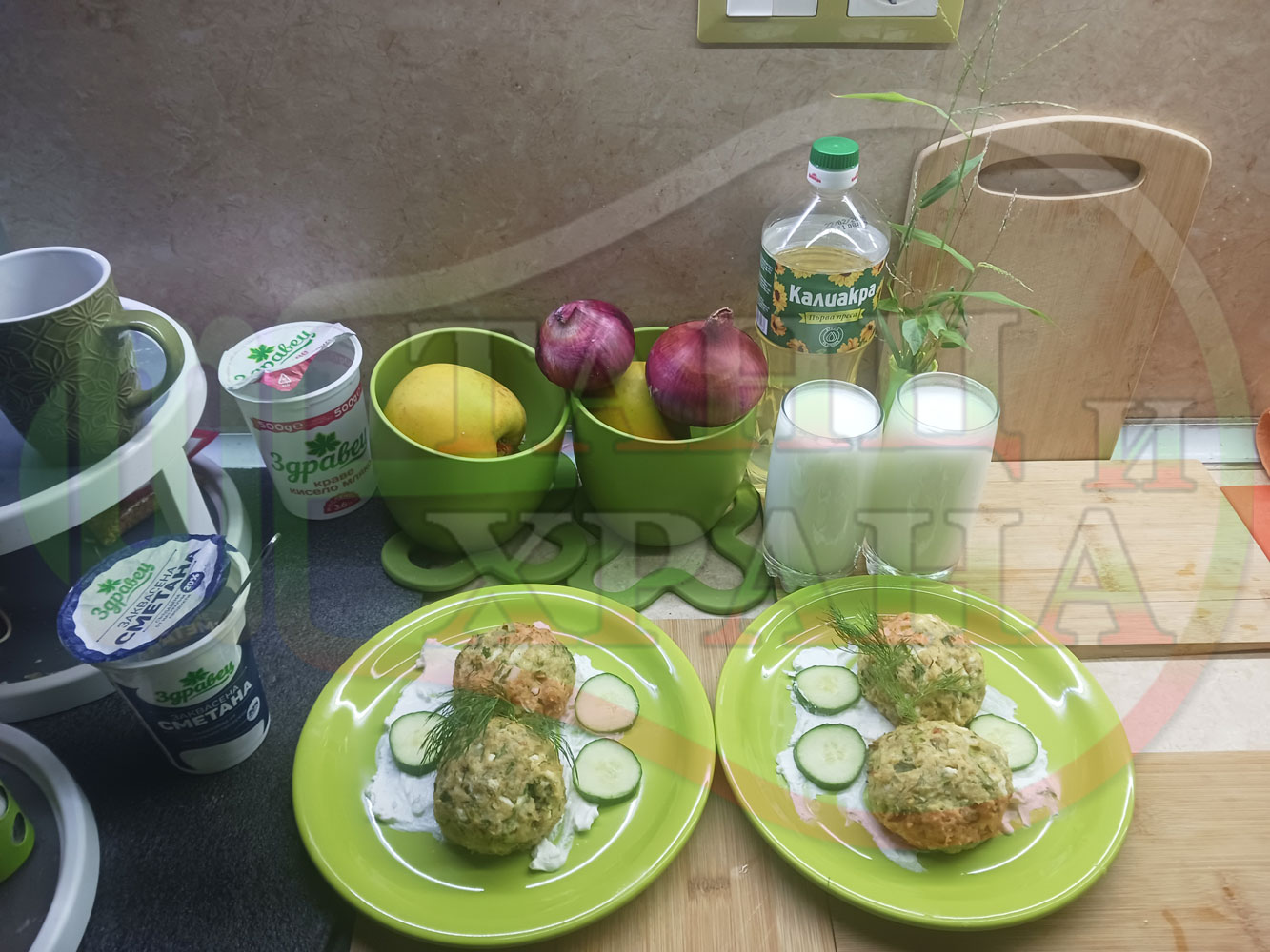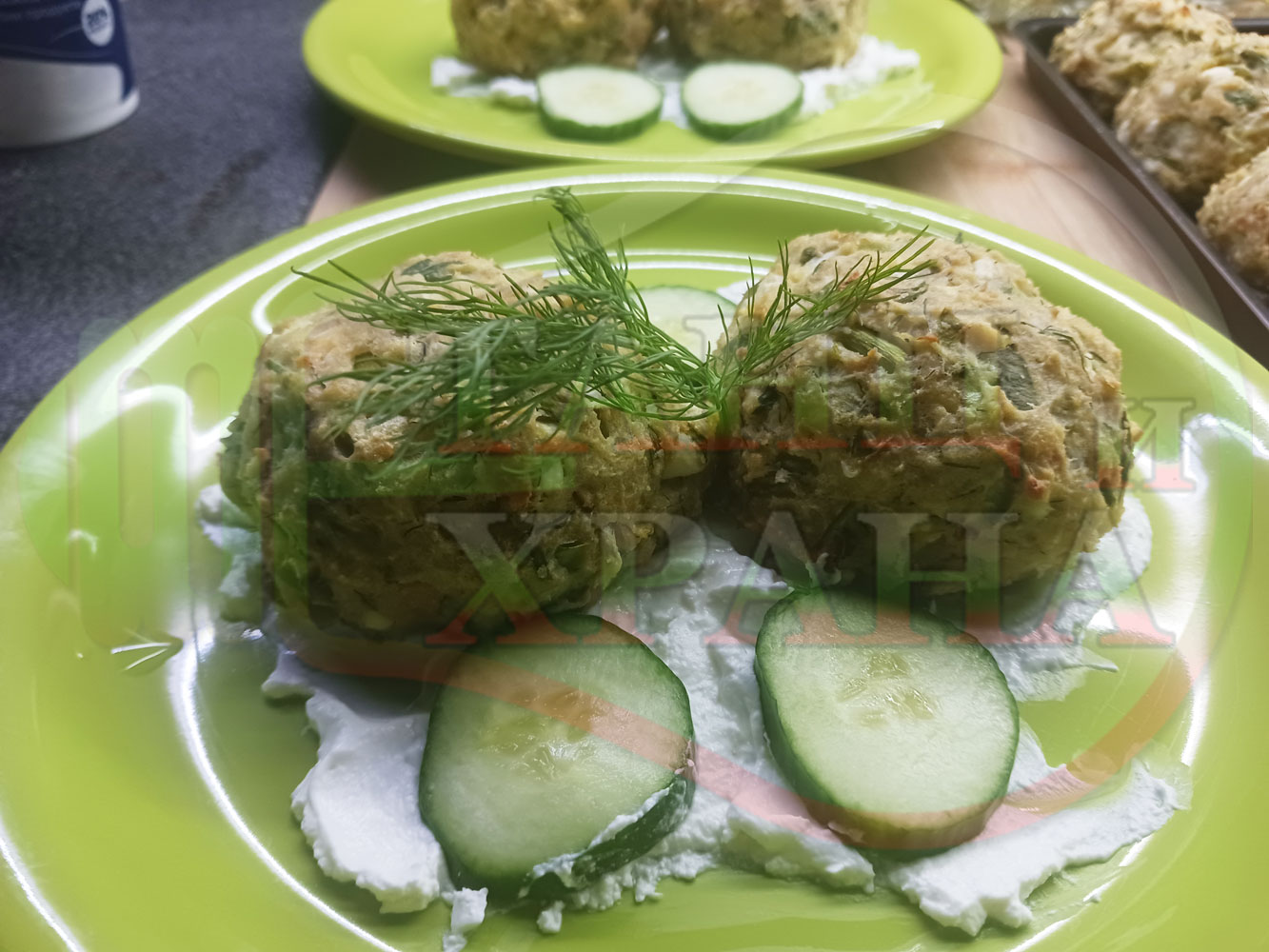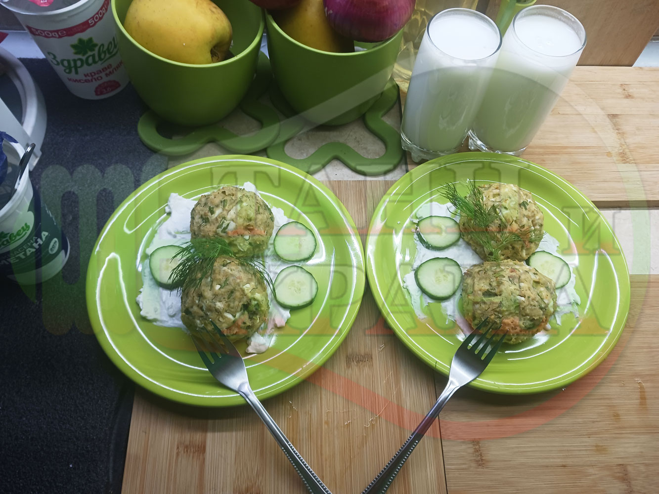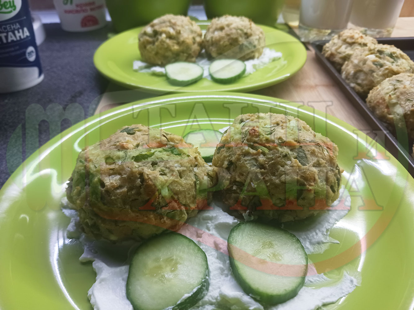 Хлебни кюфтета на фурна "Краставичнокопърови с БГсирене" омесени от хляб с пресни краставици, чесън, яйца, свеж магданоз, копър и краве бяло сирене (българско, саламурено) гарнирани със заквасена сметана