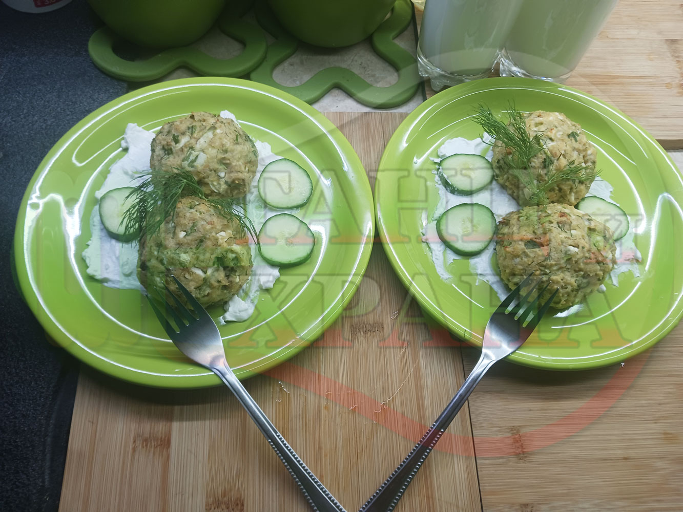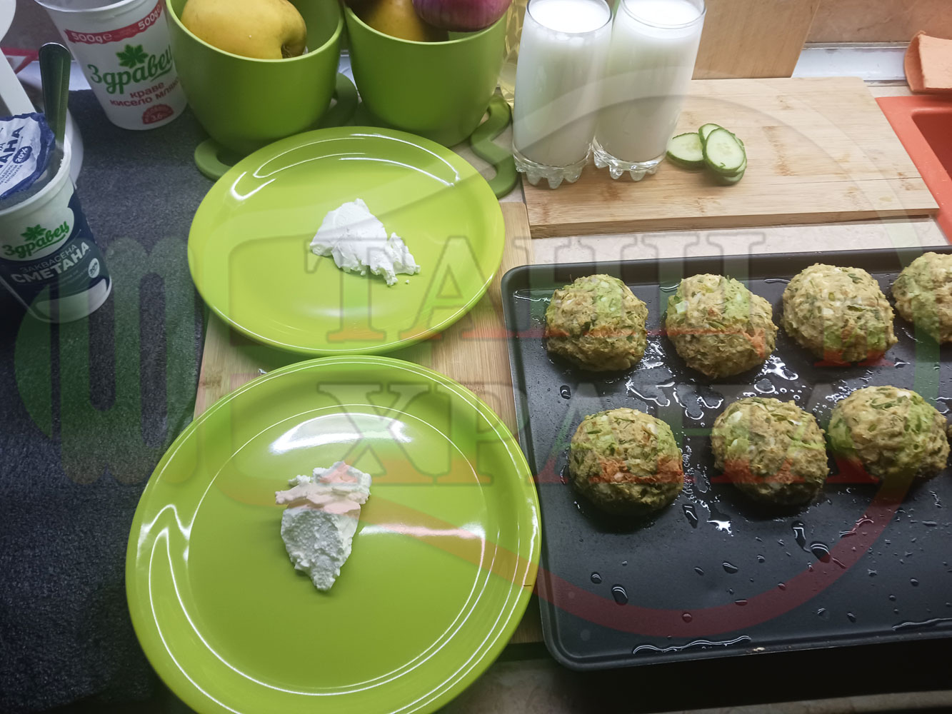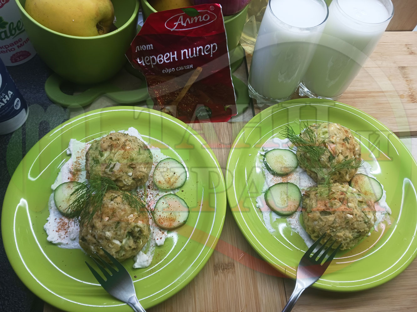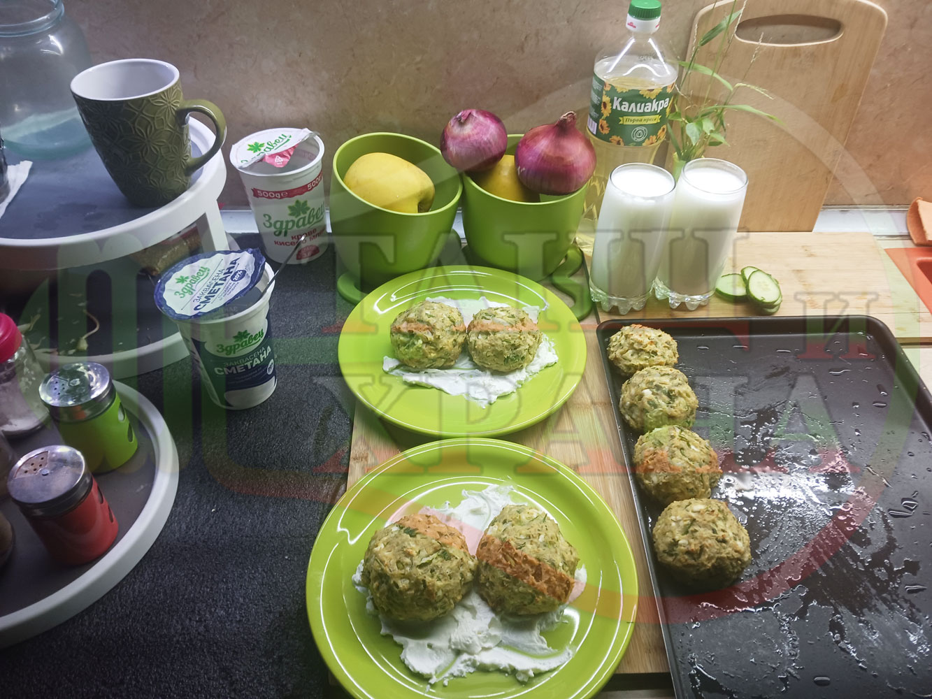 Хлебни кюфтета на фурна "Краставичнокопърови с БГсирене" омесени от хляб с пресни краставици, чесън, яйца, свеж магданоз, копър и краве бяло сирене (българско, саламурено) гарнирани със заквасена сметана
