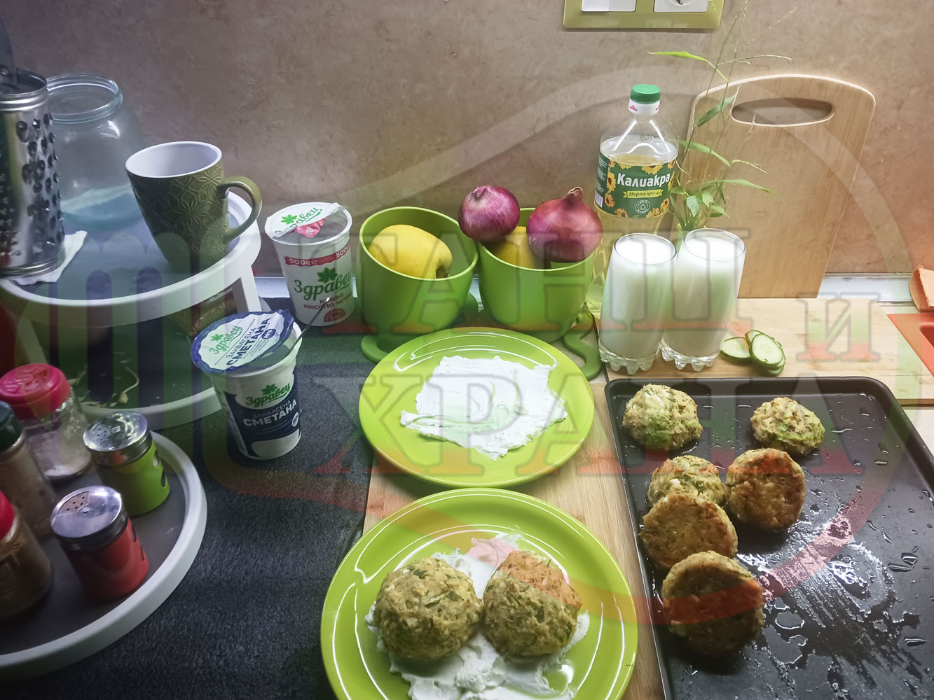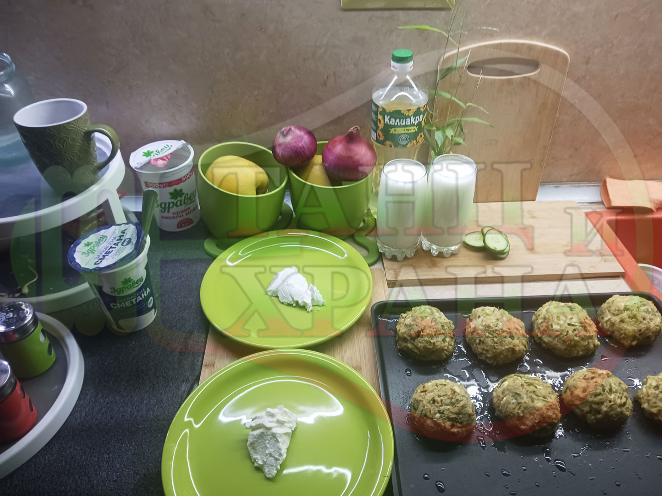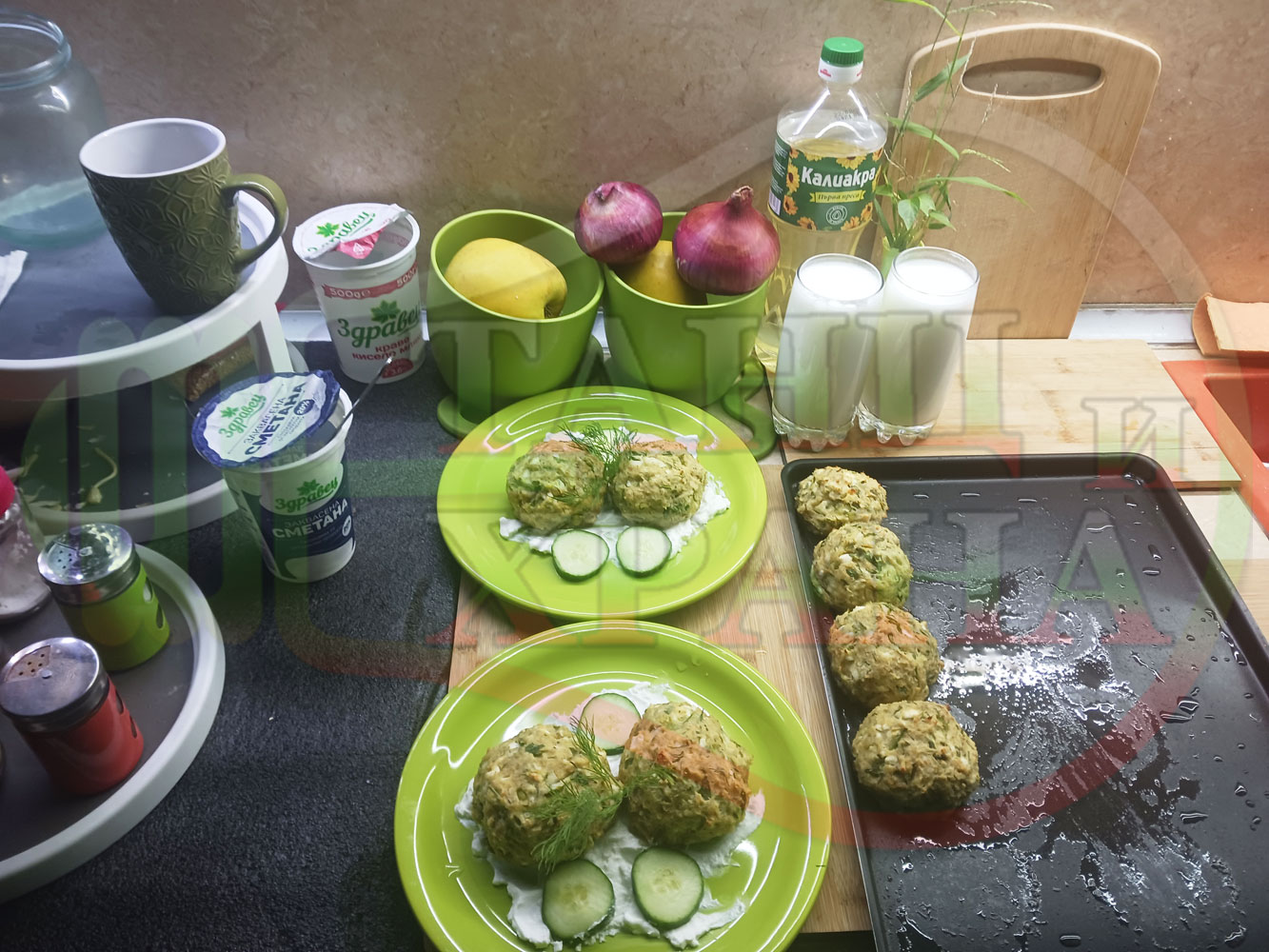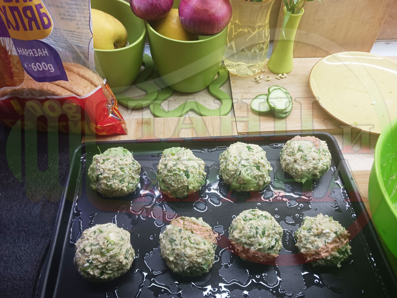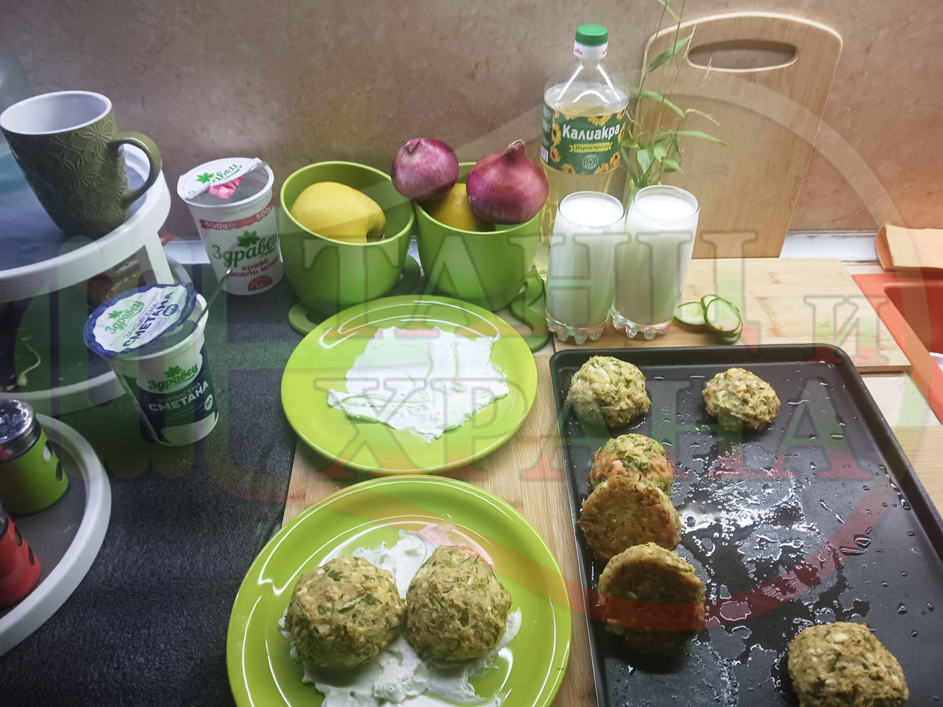 Хлебни кюфтета на фурна "Краставичнокопърови с БГсирене" омесени от хляб с пресни краставици, чесън, яйца, свеж магданоз, копър и краве бяло сирене (българско, саламурено) гарнирани със заквасена сметана